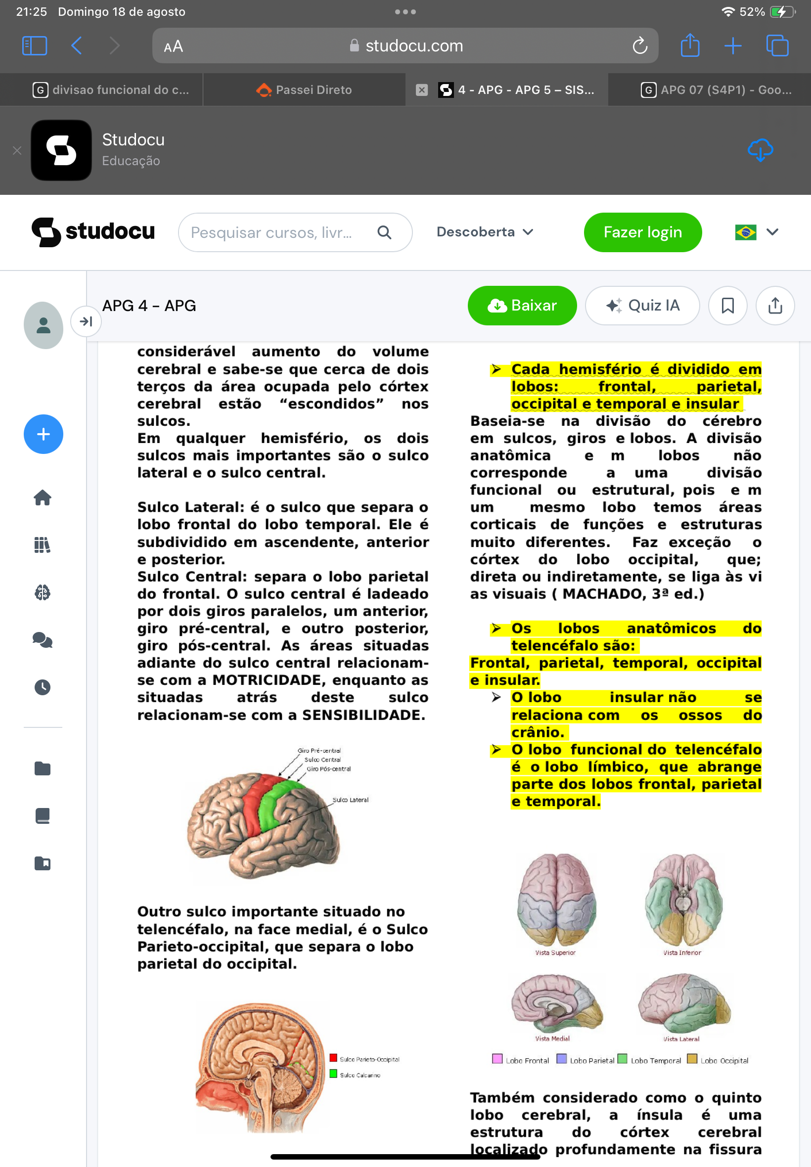 21:25 Domingo 18 de agosto ... 52% < AA studocu.com + G divisao funcional do C... Passei Direto 4 - APG - APG 5 - SIS... G APG 07 (S4P1) Goo... X S Studocu Educação studocu Pesquisar cursos, livr... Q Descoberta Fazer login APG 4 APG Baixar Quiz IA considerável aumento do volume cerebral e sabe-se que cerca de dois Cada hemisfério é dividido em terços da área ocupada pelo córtex lobos: frontal, parietal, cerebral estão "escondidos" nos occipital e temporal e insular sulcos. na divisão do cérebro + Em qualquer hemisfério, os dois em sulcos, giros e lobos. A divisão sulcos mais importantes são o sulco anatômica e m lobos não lateral e o sulco central. corresponde a uma divisão funcional ou estrutural, pois e m Sulco Lateral: é o sulco que separa o um mesmo lobo temos áreas lobo frontal do lobo temporal. Ele é corticais de funções e estruturas subdividido em ascendente, anterior muito diferentes. Faz exceção o e posterior. córtex do lobo occipital, que; Sulco Central: separa o lobo parietal direta ou indiretamente, se liga às vi do frontal. o sulco central é ladeado as visuais ( MACHADO, ed.) por dois giros paralelos, um anterior, giro pré-central, e outro posterior, Os lobos anatômicos do giro pós-central. As áreas situadas telencéfalo são: adiante do sulco central relacionam- Frontal, parietal, temporal, occipital se com a MOTRICIDADE, enquanto as e insular. situadas atrás deste sulco o lobo insular não se relacionam-se com a relaciona com os ossos do crânio. Giro o lobo funcional do telencéfalo Sulco Central Pós-central é o lobo límbico, que abrange parte dos lobos frontal, parietal Sulco Lateral e temporal. Outro sulco importante situado no telencéfalo, na face medial, é o Sulco Parieto-occipital, que separa o lobo Vista Superior Vista parietal do occipital. Vista Medial Vista Lateral Sulce Occipital Lobo Frontal Lobo Parietal Lobo Temporal Lobo Occipital Sulco Calcarino Também considerado como o quinto lobo cerebral, a ínsula é uma estrutura do córtex cerebral localizado profundamente na fissura