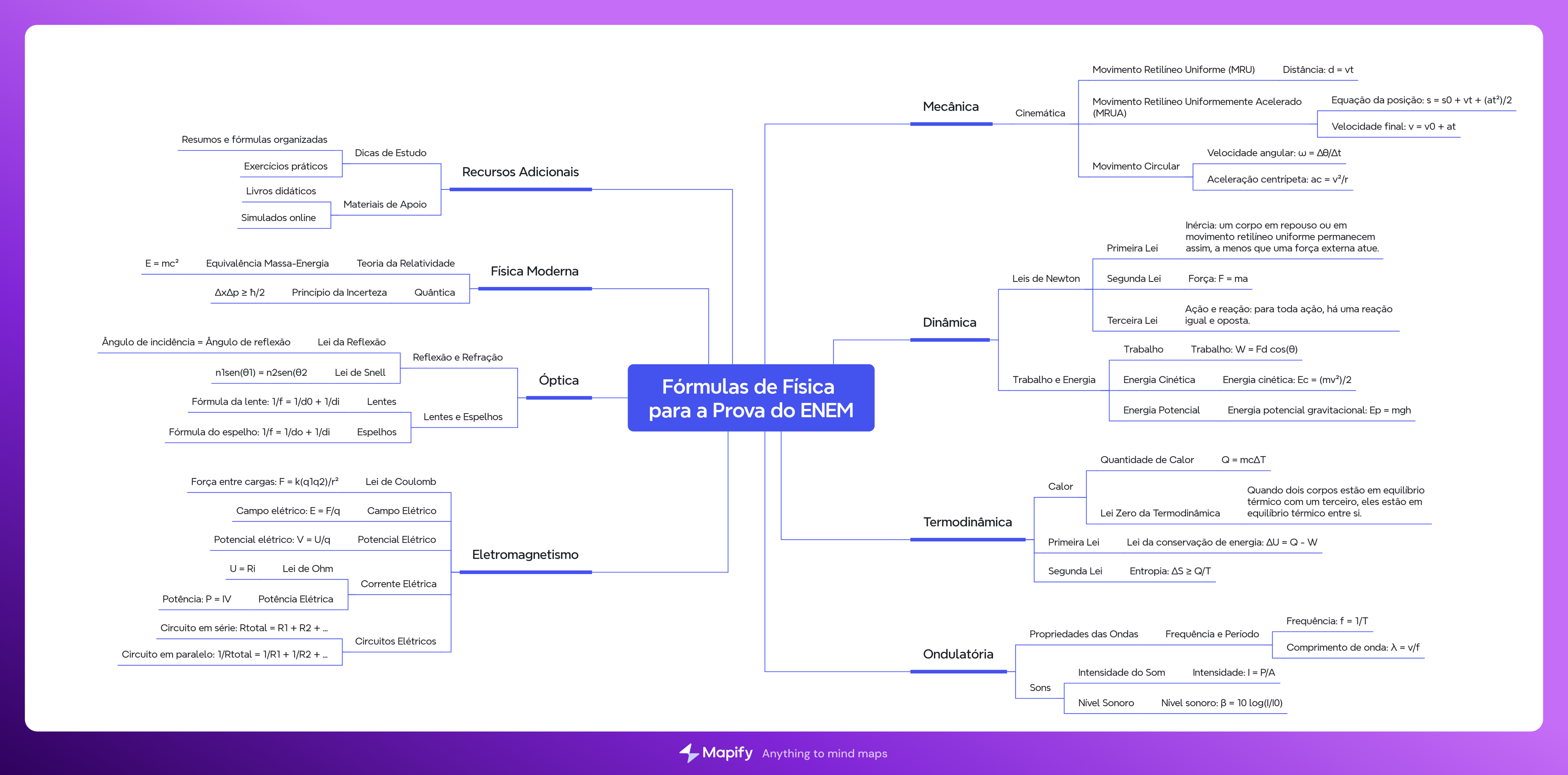 Movimento Retilíneo Uniforme (MRU) Distância: d vt Mecânica Movimento Retilineo Uniformemente Acelerado Equação da posição: Cinemática (MRUA) Velocidade final: v0 + at Resumos e fórmulas organizadas Dicas de Estudo Velocidade angular: Exercícios práticos Movimento Circular Recursos Adicionais Aceleração ao Livros didáticos Materiais de Apoio Simulados online Inércia: um corpo em repouso ou em movimento retilíneo uniforme permanecem Primeira Lei assim. a menos que uma forca externa atue. E Equivalência Massa-Energia Teoria da Relatividade Física Moderna Leis de Newton Segunda Lei Força: ma h/2 Principio da Incerteza Quântica Ação e reação: para toda ação, há uma reação Dinâmica Terceira Lei igual oposta. Ângulo de incidência de reflexão Lei da Reflexão Trabalho W Fd cos(e) Reflexão Refração n2sen(02 Lei de Snell Óptica Fórmulas de Física Trabalho e Energia Energia Cinética Energia cinética Fórmula da lente: Lentes Lentes Espelhos para a Prova do ENEM Energia Potencial Energia potencial gravitacional: Ep = mgh Fórmula do espelho: 1/f = Espelhos Quantidade de Calor Q mcAT Força entre cargas: F Lei de Coulomb Calor Quando dois corpos estão em térmico com um terceiro, eles estão em Campo elétrico: F/q Campo Elétrico Lei Zero da Termodinâmica térmico entre si Termodinâmica Potencial Potencial Elétrico Primeira Lei Lei da conservação de energia: AU = Q W Eletromagnetismo Ri Lei de Ohm Segunda Lei Entropia: AS Q/T Corrente Elétrica Potência: P IV Potência Elétrica Frequência: 1/T Circuito em série: Rtotal = + R2 + Propriedades das Ondas Frequência Período Circuitos Elétricos Comprimento de = v/f Circuito em paralelo: 1/Rtotal = 1/R1 + 1/R2 + Ondulatória Intensidade do Som Intensidade: P/A Sons Nível Nível sonoro 10 Manify