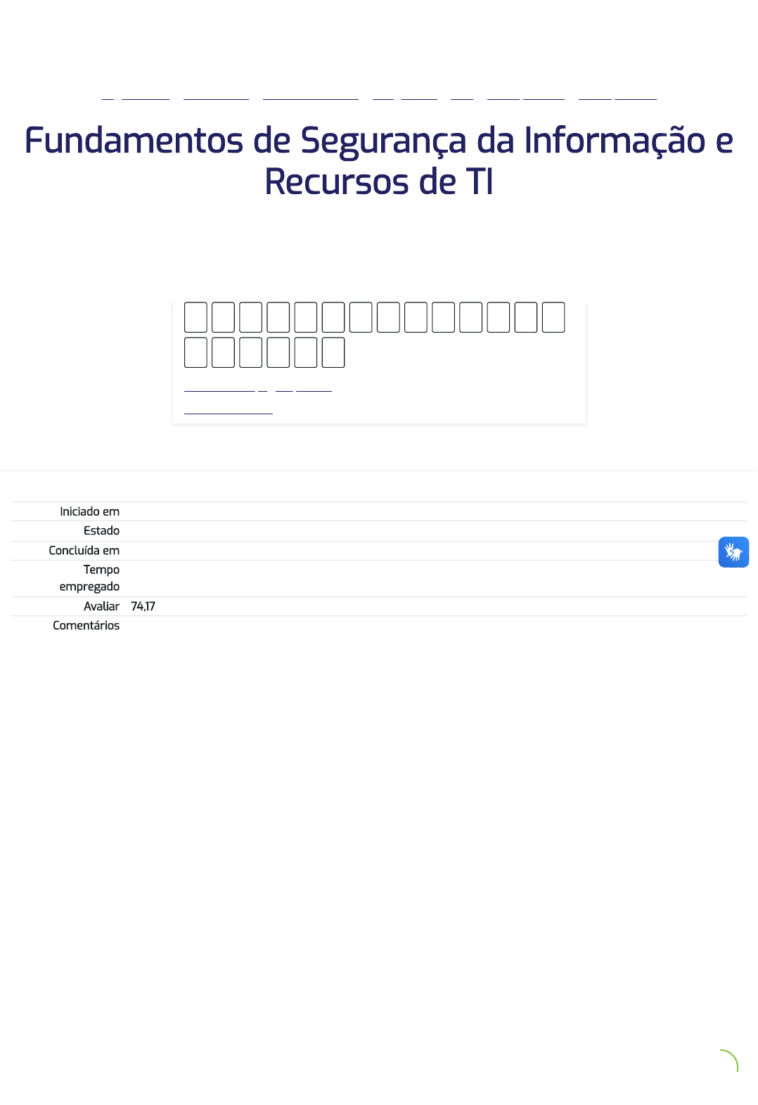 Página inicial / Meus cursos / Cursos a Distância / Obrigatórios / FSTI / Avaliação Final / Avaliação Final Fundamentos de Segurança da Informação e Recursos de TI Mostrar uma página por vez Terminar revisão 1 2 3 4 5 6 7 8 9 10 11 12 13 14 15 16 17 18 19 20 Iniciado em segunda-feira, 12 ago. 2024, 10:45 Estado Finalizada Concluída em segunda-feira, 12 ago. 2024, 11:26 Tempo empregado 40 minutos 34 segundos Avaliar 74,17 de um máximo de 100,00 Comentários Parabéns, você foi aprovado! 12/08/2024, 16:33 Avaliação Final: Revisão da tentativa | EBSERH https://moodle.ebserh.gov.br/mod/quiz/review.php?attempt=372869&cmid=1171 1/12 https://moodle.ebserh.gov.br/ https://moodle.ebserh.gov.br/my/courses.php https://moodle.ebserh.gov.br/course/index.php?categoryid=26 https://moodle.ebserh.gov.br/course/index.php?categoryid=30 https://moodle.ebserh.gov.br/course/view.php?id=100 https://moodle.ebserh.gov.br/course/view.php?id=100#section-6 https://moodle.ebserh.gov.br/mod/quiz/view.php?id=1171 https://moodle.ebserh.gov.br/mod/quiz/review.php?attempt=372869&cmid=1171&showall=0 https://moodle.ebserh.gov.br/mod/quiz/view.php?id=1171 Questão 1 Parcialmente correto Atingiu 2,50 de 5,00 Questão 2 Correto Atingiu 5,00 de 5,00 Os princípios da abrangem basicamente os seguintes aspectos: o conceito de garante que a informação é acessível somente por pessoas autorizadas a terem acesso. O conceito de garante a preservação da exatidão da informação e dos métodos de processamento. O conceito de garante que os usuários autorizados obtenham acesso à informação e aos ativos correspondentes sempre que necessário. Toda ação que possa comprometer um desses princípios pode ser tratada como atentado a sua segurança. A segurança tem como objetivo proteger equipamentos e informações contra usuários não autorizados e prevenção de danos por causas naturais, tais como: controle de acesso, biometria, sistemas de alarmes e CFTV. A segurança aplica-se em casos em que um usuário ou processo da rede tenta obter acesso a um objeto que pode ser um arquivo ou outro recurso de rede (estação de trabalho, impressora etc.), sendo assim, um conjunto de medidas e procedimentos adotados com o objetivo de proteger os dados, programas e sistemas contra tentativas de acessos não autorizados, feitas por usuários ou outros programas. segurança da informação disponibilidade con�dencialidade integridade física lógica Sua resposta está parcialmente correta. Você selecionou corretamente 3. Considere a barra de endereços do navegador, abaixo, exibida no Google Chrome: O ícone do cadeado fechado serve para mostrar que o site da EBSERH: Escolha uma opção: a. está bloqueado para acesso b. permite acesso às con�gurações do navegador c. é seguro d. está indisponível para acesso e. permite adicionar este portal aos favoritos Sua resposta está correta. 12/08/2024, 16:33 Avaliação Final: Revisão da tentativa | EBSERH https://moodle.ebserh.gov.br/mod/quiz/review.php?attempt=372869&cmid=1171 2/12 Questão 3 Correto Atingiu 5,00 de 5,00 Questão 4 Incorreto Atingiu 0,00 de 5,00 Na maioria dos navegadores de internet, quando alguém está visitando um site seguro, ele apresenta um ícone no formato de cadeado. Quando a cor do cadeado é verde, isso signi�ca que não há erros no certi�cado digital do site e que todo o conteúdo transmitido entre o computador e o site está seguro contra interceptação. Quando há erros no certi�cado digital, o navegador informa o problema e permite que o usuário decida se aceita ou não o certi�cado do site antes de iniciar a navegação. Existem ainda sites que não possuem nenhum tipo de segurança; consequentemente os dados trafegados entre esses sites e o computador podem ser facilmente interceptados. Nesse último caso, como os dados podem ser facilmente interceptados, é recomendado apenas: Escolha uma opção: a. informar dados bancários ou de cartões de crédito. b. navegar pelo site c. preencher formulários de cadastro. d. fazer download de arquivos Sua resposta está correta. São boas práticas de segurança ao utilizar um serviço Webmail, exceto: Escolha uma opção: a. criar uma senha com letras, números e caracteres especiais b. con�gurar um e-mail alternativo para recuperação de senha c. manter o sistema operacional atualizado d. acessar o Webmail por um site de buscas conhecido e. evitar clicar em links recebidos por e-mail Sua resposta está incorreta. 12/08/2024, 16:33 Avaliação Final: Revisão da tentativa | EBSERH https://moodle.ebserh.gov.br/mod/quiz/review.php?attempt=372869&cmid=1171 3/12 Questão 5 Correto Atingiu 5,00 de 5,00 Questão 6 Correto Atingiu 5,00 de 5,00 Arquivos anexados a mensagens de e-mail podem conter vírus, que só contaminarão a máquina se o arquivo anexado for executado. Portanto, antes de se anexar um arquivo a uma mensagem para envio ou de se executar um arquivo que esteja anexado a uma mensagem recebida, é recomendável alguns procedimentos de segurança. Escolha a melhor resposta: Escolha uma opção: a. solicitar orientações do setor de TI para cada e-mail recebido ou enviado b. atualizar o sistema operacional do computador c. sempre apagar mensagens recebidas com anexos d. executar um antivírus para identi�car possíveis contaminações e. nunca enviar mensagens com anexos Sua resposta está correta. É importante manter os sistemas antimalwares atualizados e ativos de forma online, ou seja, veri�cando automaticamente os e-mails e arquivos "baixados" para o computador. A qualquer momento, pode-se executar manualmente as ferramentas de defesa. Ao se deparar com uma tela de login em um sistema web, o usuário notou que o acesso não ocorria por um canal seguro (site seguro). Nessa situação, o usuário deve: Escolha uma opção: a. executar imediatamente a veri�cação de antivirus do sistema b. trocar a senha imediatamente, pois suas credenciais foram comprometidas c