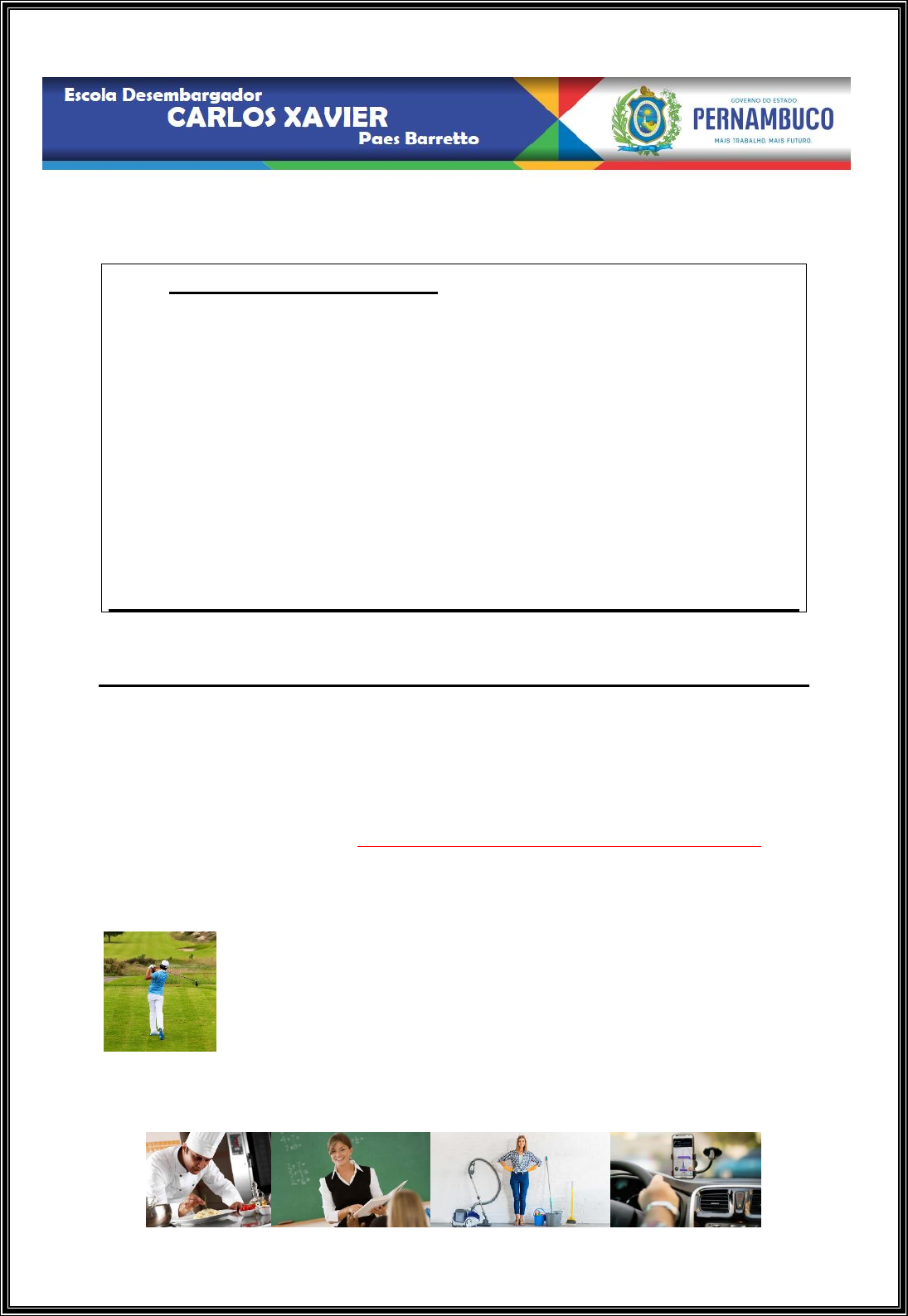 APOSTILA DE ESTUDOS PARA AULAS NÃO-PRESENCIAS (EJA MOD 1 – SEMANA 04 – 06 A 07/04/2020) Orientações aos alunos: 1.Resolver as atividades no caderno com perguntas e respostas (para as disciplinas de exatas, os cálculos quando necessário). 2. Resolver as atividades de cada disciplina separadamente, para entregar ao Professor da disciplina correspondente. 3. Antes de responder as atividades propostas, o(a) aluno(a) deve escrever o seguinte cabeçalho: ATIVIDADE DE REPOSIÇÃO – SEMANA 06/04 – 07/04 DISCIPLINA: escrever o nome da disciplina correspondente a atividade PROFESSOR: escrever o nome do professor da disciplina correspondente ALUNO: escrever seu nome EDUCAÇÃO FÍSICA TEMA: NÍVEIS DE ATIVIDADE FÍSICA: LEVE, MODERADA OU INTENSA? VÍDEO AULA DE APOIO: 1 - https://www.youtube.com/watch?v=tpvD997PzUo 2 - https://fredericoporto.com.br/atividade-fisica-e-o- coracao/ Atividade Física Leve 75% do tempo sentado ou de pé e 25% do tempo de pé e movendo-se. Ex.: motorista, trabalho em laboratório, cozinheiro, tocador de instrumento musical, pintor, datilógrafo, passadeira, manobrista, eletricista, carpinteiro, faxineira, babá, golfista, navegador, tenista de mesa, funcionário de restaurante, executivo, professor, dona de casa com aparelhos domésticos. https://www.youtube.com/watch?v=tpvD997PzUo Atividade Física Moderada 25% do tempo sentado ou de pé e 75% do tempo gasto em atividade ocupacional específica: caminhada a 5,6 a 6,4Km/h (devagar), carregando peso, ciclista, esquiador, dançarino, tenista de quadra, motorista, estudantes, trabalho em indústria leve. Atividade Física Intensa 40% do tempo sentado ou de pé e 60% do tempo gasto em atividade ocupacional específica e mais intensa que as anteriores: caminhar (subir) carregando peso, lavrador, atletas, alpinistas, soldados. 4 dicas para a prática de atividade física regular 1. Encontre um local adequado para praticar as atividades físicas, como parques, praças e similares; 2. Comece com uma atividade que não exige alto preparo físico; 3. Praticar atividade física perto de casa não exigindo grandes deslocamentos, o que ajuda na manutenção desse hábito; 4. Procure atividades realizadas por várias pessoas, inclusive do seu círculo de amizade, o que poderá ser um estímulo a mais. ATIVIDADE EXTRA 1. Sobre a quantidade de tempo sentado ou em pé, que classifica o nível de esforço de determinada atividade física, responda segundo a porcentagem: a. Atividade física leve: _________________________________________ ______________________________________________________________________ ______________________________________________________________________ b. Atividade física moderada: ____________________________________ ______________________________________________________________________ ______________________________________________________________________ c. Atividade física intensa: _______________________________________ ______________________________________________________________________ ______________________________________________________________________ 2. Pesquise e cite 7 exemplos de atividade física nos seus respectivos níveis. a. Atividade física leve: _________________________________________ ______________________________________________________________________ ______________________________________________________________________ b. Atividade física moderada: ____________________________________ ______________________________________________________________________ ______________________________________________________________________ c. Atividade física intensa: _______________________________________ ______________________________________________________________________ ______________________________________________________________________ 3. A respeito das 4 dicas para a prática de atividade física regular, cite qual seria a mais difícil de se adaptar e o que você poderia fazer para romper essa barreira? ______________________________________________________________________ ______________________________________________________________________ ______________________________________________________________________ ______________________________________________________________________ ______________________________________________________________________ ______________________________________________________________________