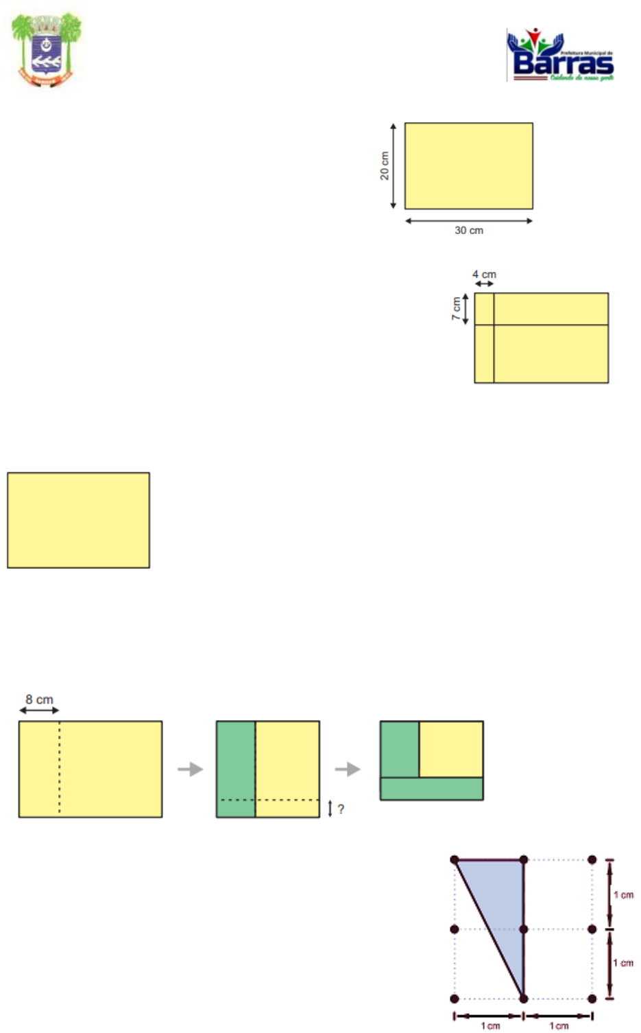 Prefeitura Municipal de Barras Secretaria Municipal de Educação – SEMED Coordenação de matemática Atividade de reforço para OBMEP 2º FASE – NIVEL 2 1 -Lucinha tem três folhas retangulares iguais, cujos lados medem 20 cm e 30 cm. a) Lucinha fez dois traços retos na primeira folha, um a 4 cm da margem esquerda e outro a 7 cm dá margem superior, dividindo-a em quatro retângulos. um desses retângulos têm a maior área. Qual é o valor dessa área? b) Ajude Lucinha a dividir a segunda folha em quadrados iguais, desenhando traços paralelos às margens, de modo que esses quadrados tenham a maior área possível. c) Lucinha pegou a terceira folha, amarela na frente e verde no verso, e fez duas dobras: a primeira a 8 cm da margem esquerda e a segunda a uma certa distância da margem inferior, de forma que o perímetro da região não coberta da folha (contorno da região amarela da última figura) fosse de 54 cm. Qual é a distância da segunda dobra à margem inferior? 2. Em um quadrado de lado 2 cm foram marcados nove pontos, conforme a figura. Triângulos podem ser desenhados com seus vértices nesses pontos. A figura mostra um deles, com área igual a 1 cm2 a) Quantos triângulos congruentes ao da figura possuem seus vértices nos pontos marcados? b) Desenhe outros dois triângulos com seus vértices nos pontos marcados, ambos com área igual a 1 cm2, que não sejam congruentes entre si, nem congruentes ao triângulo da figura c) Quantos triângulos com área igual a 1 cm2 possuem seus vértices nos pontos marcados? 3. Janaína tem três folhas de papel quadradas: uma verde de área 64 cm2, uma amarela de área 36 cm2 e uma azul de área 18 cm2. a) Janaína colocou a folha amarela sobre a folha verde, e a folha azul sobre a folha amarela, como na figura abaixo. Dentre as regiões verde, amarela ou azul da figura, qual tem a maior área? Explique sua resposta. b) Em seguida, Janaína colocou as folhas azul e amarela sobre a verde como na figura abaixo, determinando novas regiões coloridas. Qual é a soma das áreas das regiões verdes e amarela? c) Finalmente Janaína colocou as folhas como na figura abaixo. Qual é a área da nova região amarela? 4. Pedrinho juntou quatro quadrados, sem sobreposição, e obteve o retângulo de contorno destacado em vermelho na fi gura. A área do quadrado sombreado é 4 cm2. a) Qual é a área do retângulo de contorno destacado em vermelho? b) Pedrinho juntou mais um quadrado à fi gura, também sem sobreposição, e obteve um novo retângulo de maior área possível. Qual é a área desse novo retângulo? c) Pedrinho quer obter outro retângulo igual ao retângulo do enunciado (destacado em vermelho e reproduzido abaixo), mas agora juntando nove quadrados em vez de quatro. Desenhe, na figura, como ele pode fazer isso. 5 - Uma folha retangular de 20 cm por 30 cm foi cortada ao longo das linhas tracejadas AC e BD em quatro pedaços: dois triângulos iguais e dois polígonos iguais de cinco lados cada um, como na figura I. Os segmentos AC e BD tem o mesmo comprimento e se encontram no centro do retângulo formando ângulos retos. (a) Qual e o comprimento do segmento AB? (b) Qual e a área de um pedaço triangular? E de um pedaço de cinco lados? (c) Com os quatro pedaços podemos montar um quadrado com um buraco retangular, como na figura II. Qual e a área do buraco? 6 - Na figura, os triângulos ABC e DEF são equiláteros de lados 14 cm e 13 cm, respectivamente, e os lados BC e EF são paralelos. (a) Calcule a medida do angulo EÛT. (b) Calcule o perímetro do polígono PQRSTU. (c) Se o segmento PQ mede 6 cm, qual e a medida do segmento ST? Fonte: Questões 1 e 2, corresponde às questões 1 e 5, prova nível 2 de 2015 Questões 3, corresponde a questão 3, prova nível 2 de 2018. Questões 4 corresponde a questão 2, prova nível 2 de 2017. Questões 5 e 6 corresponde a questão 1 e 4, prova nível 2 de 2006.