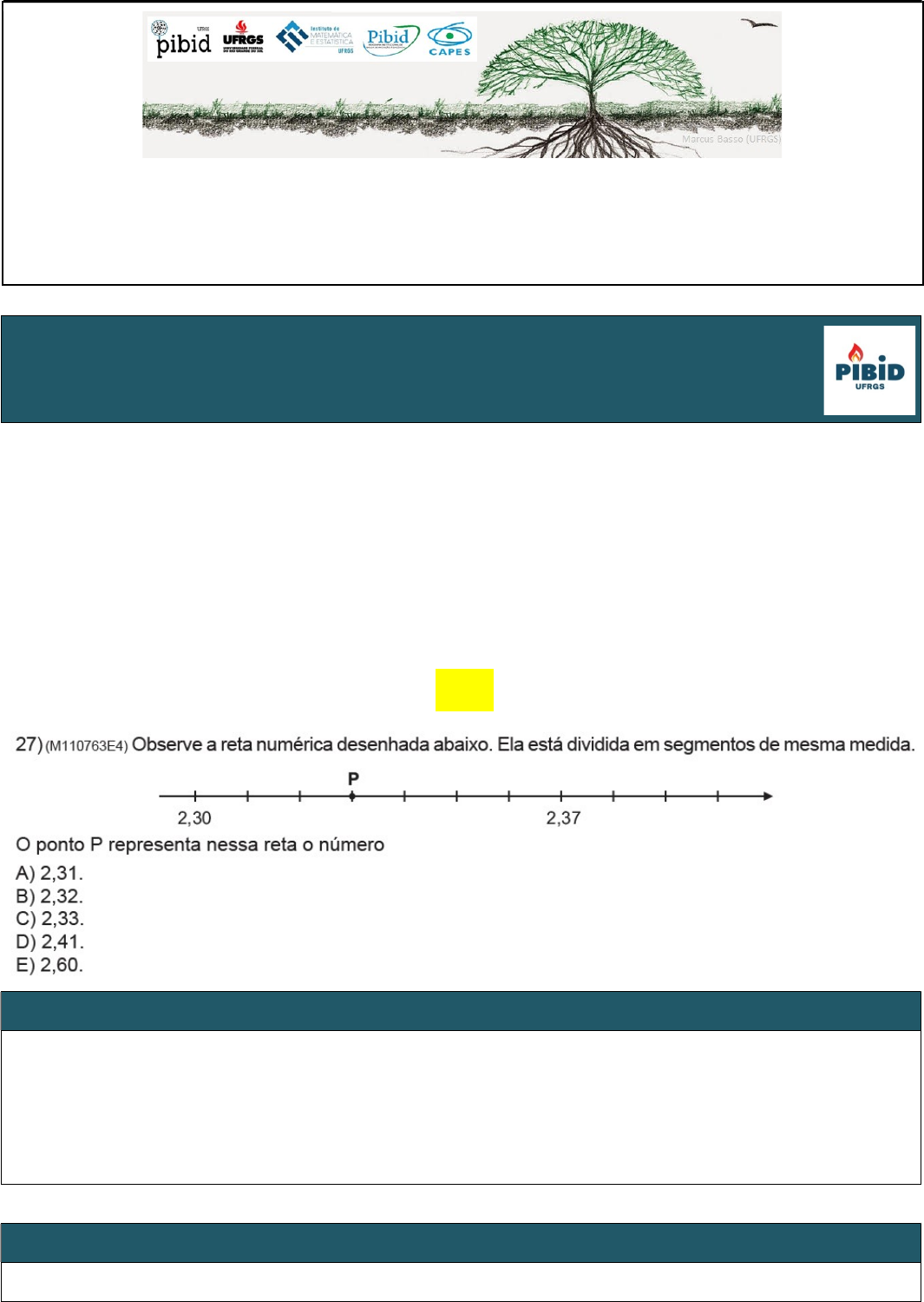 :: PIBID – Matemática – UFRGS :: Universidade Federal do Rio Grande do Sul (UFRGS) Instituto de Matemática e Estatística (IME) Departamento de Matemática Pura e Aplicada (DMPA) Avaliar é TRI! (1º ano – EM) – 2021 – Prova comentada – Período de Realização da Atividade: janeiro/fevereiro/março de 2022 Professor (Bolsista(s)): Sarah Cabral, Luiza Schwambach, Viviane Lima Arquivo com a resolução comentada da avaliação feita nas escolas estaduais do Rio Grande do Sul no ano de 2021. Após a resolução são apresentadas as habilidades da BNCC que são contempladas/exigidas nas questões. [27] Resolução da questão É nos dito no enunciado que os segmentos têm a mesma medida, se contarmos as marcas na reta entre 2,30 e 2,37 perceberemos que a medida de cada segmento é 0,01, portanto é só contar os pontos até chegar no ponto P e perceber que o resultado é 2,33. Resposta: Letra C Habilidades da BNCC contempladas na questão (EF06MA01) Comparar, ordenar, ler e escrever números naturais e números racionais cuja representação decimal é finita, fazendo uso da reta numérica. (EF07MA10) Comparar e ordenar números racionais em diferentes contextos e associá-los a pontos da reta numérica. [28] Resolução da questão Podemos observar que a base é um quadrado, portanto a única alternativa viável seria a letra A, uma vez que as demais apresentam figuras que não são quadrados. Cabe ressaltar que a alternativa (E) mostra a planificação de um sólido que não é uma pirâmide. Resposta: Letra A Habilidades da BNCC contempladas na questão (EF06MA17) Quantificar e estabelecer relações entre o número de vértices, faces e arestas de prismas e pirâmides, em função do seu polígono da base, para resolver problemas e desenvolver a percepção espacial; (EF06MA28) Interpretar, descrever e desenhar plantas baixas simples de residências e vistas aéreas; [29] Resolução da questão Uma função afim pode ser escrita como f(x) = ax + b. Por sabermos dois pontos, podemos descobrir como é a função. Temos o ponto (0,-4) e (4,0). Para descobrirmos a, podemos usar: Já que x2 ≠ x1 e x2 – x1 ≠ 0. Logo ficamos com a = 1. Para calcular b temos: Portanto, f(x) = 1x – 4 ou seja, f(x) = x – 4. Resposta: Letra B Habilidades da BNCC contempladas na questão (EF08MA07) Associar uma equação linear de 1º grau com duas incógnitas a uma reta no plano cartesiano. (EF09MA06) Compreender as funções como relações de dependência unívoca entre duas variáveis e suas representações numérica, algébrica e gráfica e utilizar esse conceito para analisar situações que envolvam relações funcionais entre duas variáveis. (EM13MAT302) Resolver e elaborar problemas cujos modelos são as funções polinomiais de 1º e 2º graus, em contextos diversos, incluindo ou não tecnologias digitais. [30] Resolução da questão O problema aqui envolve principalmente a observação do gráfico e operações básicas. No ano de 2000, podemos observar que o Brasil conseguiu 6 medalhas de prata e 6 medalhas de bronze, totalizando 12 medalhas. No ano de 2004, podemos observar que o Brasil conseguiu 5 medalhas de ouro, 2 medalhas de prata e 3 medalhas de bronze, totalizando 10 medalhas. No ano de 2008, podemos observar que o Brasil conseguiu 3 medalhas de ouro, 4 medalhas de prata e 8 medalhas de bronze, totalizando 15 medalhas. Portanto, 12 + 10 + 15 = 37 Resposta: Letra C Habilidades da BNCC contempladas na questão (EF06MA31) Identificar as variáveis e suas frequências e os elementos constitutivos (título, eixos, legendas, fontes e datas) em diferentes tipos de gráfico. (EF06MA32) Interpretar e resolver situações que envolvam dados de pesquisas sobre contextos ambientais, sustentabilidade, trânsito, consumo responsável, entre outros, apresentadas pela mídia em tabelas e em diferentes tipos de gráficos e redigir textos escritos com o objetivo de sintetizar conclusões. (EF07MA35) Compreender, em contextos significativos, o significado de média estatística como indicador da tendência de uma pesquisa, calcular seu valor e relacioná-lo, intuitivamente, com a amplitude do conjunto de dados. (EM13MAT102) Analisar gráficos e métodos de amostragem de pesquisas estatísticas apresentadas em relatórios divulgados por diferentes meios de comunicação, identificando, quando for o caso, inadequações que possam induzir a erros de interpretação, como escalas e amostras não apropriadas. [31] Resolução da questão Pelas informações do enunciado sabemos que a torneira foi de 250 a 1000 litros em um período de 2,5h de maneira constante. Isso faz com que a quantidade de água na caixa varie de forma linear. Dessa forma a única alternativa que satisfaz todas essas prerrogativas é a letra a. Resposta: Letra A Habilidades da BNCC contempladas na questão (EF06MA32) Interpretar e resolver situações que envolvam dados de pesquisas sobre contextos ambientais, sustentabilidade, trânsito, consumo responsável, entre outros, apresentadas pela mídia em tabelas e em diferentes tipos de gráficos e redigir textos escritos com o objetivo de sintetizar conclusões. (EF06MA33) Planejar e coletar dados de pesquisa referente a práticas sociais escolhidas pelos alunos e fazer uso de planilhas eletrônicas para registro, representação e interpretação das informações, em tabelas, vários tipos de gráficos e texto. (EF08MA07) Associar uma equação linear de 1º grau com duas incógnitas a uma reta no plano cartesiano. (EF08MA08) Resolver e elaborar problemas relacionados ao seu contexto próximo, que possam ser representados por sistemas de equações de 1º grau com duas incógnitas e interpretá-los, utilizando, inclusive, o plano cartesiano como recurso. [32] Resolução da questão Queremos calcular o perímetro, temos duas semicircunferências, então podemos calcular o perímetro de uma circunferência. O diâmetro da circunferência é indicado pelo número 80, faze