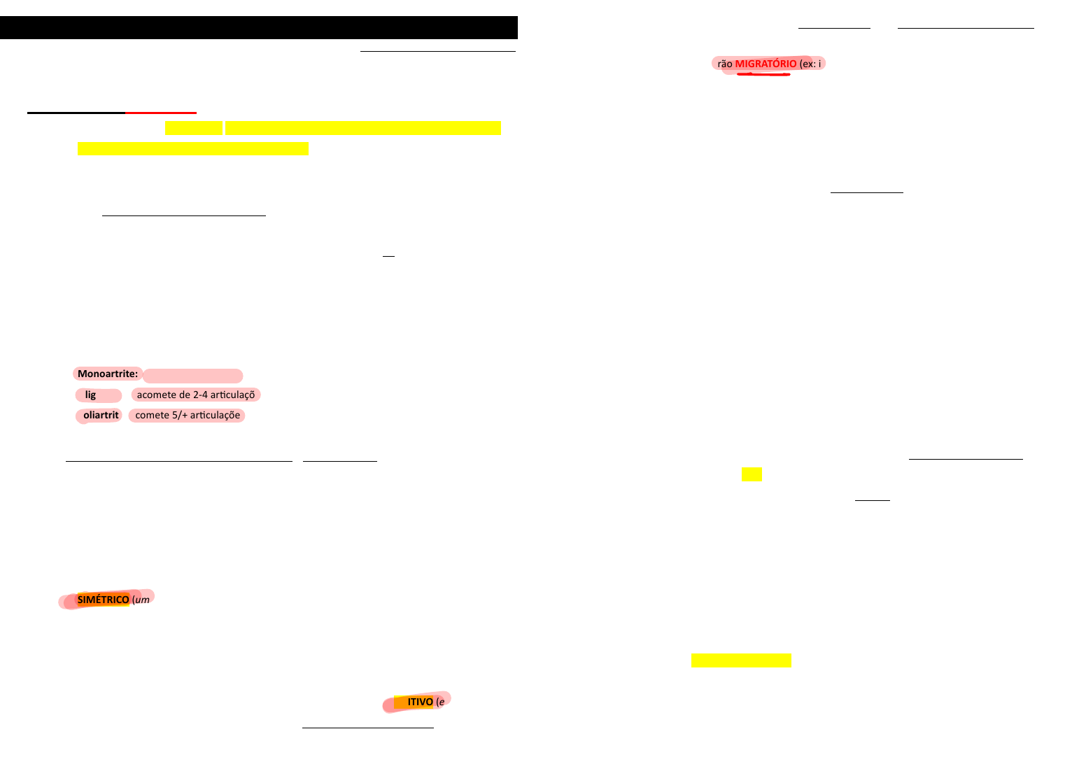 ARTRITE REUMATOIDE AULA 1 – DR. GUILHERME BULBOL CONCEITOS § DOENÇA ARTICULAR INFLAMATÓRIA o Caracteriza-se por: QUADRO DE OLIGO-POLIARTRITE INFLAMATÓRIA COM PREDILEÇÃO POR PEQUENAS ARTICULAÇÕES, SIMÉTRICA E EROSIVA. o Também pode acometer grandes arEculações, mas é caracterísEco da AR “gostar” de pequenas arEculações. o A AR é extremamente erosiva (destru1va), por isso que durante a avaliação os pacientes já apresentam alguma deformidade, principalmente em pacientes mais idosos com uma doença mais anEga, onde não se Enha avanços com relação ao tratamento ou paciente que possui o diagnósEco, mas nunca aderiu ao tratamento. o Na grande maioria dos casos a AR é simétrica. § Quando falamos que o paciente possui ARTRITE (dor, calor, rubor e edema da arEculação), ou seja, ele possui uma arEculação inflamada, temos uma nomenclatura para quanEficar o número de arEculações acomeEdas: o Monoartrite: acomete 1 arEculação; o Oligoartrite: acomete de 2-4 arEculações; o Poliartrite: acomete 5/+ arEculações. § Por que quanKficar o número de arKculações acomeKdas e definir o padrão é importante? o Porque a história clínica do paciente dentro de uma doença reumáEca costuma a nos levar à um possível diagnósEco. o As doenças reumáEcas elas “contam a história”, por exemplo, se o paciente de início apresentava uma monoartrite, e com o passar do tempo evoluiu para uma oligoartrite e posteriormente poliartrite; como que isso foi acontecendo durante o tempo, etc. o Posso ter um paciente seja mono/oligo/poli, porém, apresenta padrão de acomeEmento SIMÉTRICO (uma forma espelhada, ou seja, se o paciente tem acome1mento do punho direito, ele terá acome1mento do punho esquerdo; se o paciente tem acome1mento do joelho direito, consequentemente terá do joelho esquerdo), e isso no início pode começar de forma simétrica e com o passar do tempo fazer uma assimetria das arEculações, mas quando se fala de simétrico o padrão seria esse. o Existem algumas doenças reumáEcas que apresentam acomeEmento ADITIVO (ex: paciente começou a ter febre e dor ar1cular, de início uma Monoartrite no joelho direito, e ele relatou que após 7 dias teve acome1mento do joelho esquerdo, mas permaneceu no joelho direito, ou seja, ele “adicionou” em número de ar1culações acome1das). o Diferente do padrão MIGRATÓRIO (ex: iniciou no joelho direito, após alguns dias passou para o joelho esquerdo, mas “resolveu” a dor no joelho direito, então o acomeEmento “migrou” do joelho direito para o esquerdo). o No decorrer dos estudos iremos ver que existem algumas doenças que possuem mais padrão migratório e outras mais componentes adiEvos. o Algumas doenças possuem mais padrão INFLAMATÓRIO e outras mais EROSIVAS (que também é inflamatória, mas, tem a capacidade de destruir/corroer a arEculação maior do que os outros padrões) § Quando estamos diante de um paciente que possui AR, ou paciente que tem uma Doença ReumáKca (AR, LES, Esclerose sistêmica, SAF, doença mista do tecido conjunEvo, miopaEa inflamatória) ou até mesmo uma artrite (acomeEmento da arEculação), devemos sempre pensar nas causas que podem levar à estas manifestações, ou seja, as doenças que mimeEzam uma doença reumáEca, as quais são diversas. § Ex: Paciente apresentando uma OLIGOARTRITE, o que é mais óbvio? Esse paciente pode ter uma doença reumáEca, mas primeiro deve se invesEgar: o Doenças Infecciosas § Paciente tem febre? § Ele possui Sorologias que possa ser avaliada? – Hepa1te C, Hepa1te B, HIV, VDRL. § Sempre avaliar, pois, muitas vezes o paciente pode estar mimeEzando um quadro de uma doença reumáEca, porém está cursando com um quadro infeccioso. § ATENÇÃO: lembrar dos vírus que possuem uma janela imunológica maior, como: † HIV: o paciente as vezes no início apresenta resultado negaEvo, mas depois de um tempo ele posiEva (principalmente depois de 30 dias do início dos sinais, sendo necessário solicitar um novo exame para avaliar). o Doenças Endócrino Metabólicas § Solicitar exames, a não ser que o paciente já traga o resultados dos exames para avaliação. † Tireoidite de Hashimoto † HipoKreoidismo † HiperKreoidismo † HiperparaKreoidismo bem comum ver quadro arEcular associado. † Doença da Tireoide pode fazer acomeEmento arEcular. † Diabetes pode fazer acomeEmento arEcular. - § ATENÇÃO: durante a invesEgação na suspeita dessas hipóteses, solicitar: taxas hormonais da 1reoide, glicose em jejum, colesterol total e frações (avaliar dislipidemias). o Neoplasias § Pacientes que possuem neoplasia podem fazer acomeEmento arEcular. § ATENÇÃO: geralmente o paciente relata emagrecimento; apresenta uma síndrome consumpEva; apresenta história familiar para a determinada neoplasia. § Não é tão simples para se realizar o diagnósEco de uma doença reumáEca, na maioria dos casos se uElizam critérios de classificação, e geralmente no primeiro tópico desses critérios está descrito que diante do acomeEmento arEcular outras doenças de origem infecciosas, endócrinas e neoplásicas já foram invesEgadas e descartadas para se poder pensar em uma hipótese reumatológica. EPIDEMIOLOGIA § Prevalência de 0,5-1% em caucasianos e 5-6% em índios americanos. o Possui fatores étnicos associados. § Razão homens : mulheres de 1:3 a 4. o Normalmente é uma doença de mulher de meia idade (40-45 anos) o Essa relação homem/mulher é bem diferente no LES e Sjögren, onde há um predomínio muito maior por mulheres, chegando a ser até 15M/1H, e quando acomete homem geralmente é um quadro muito mais grave. § Aumenta com a idade: aos 65 anos é de 2% em homens e 5% em mulheres. § História familiar: risco aumentado de 3-5x. § Se primeiro grau: 50% a mais de RISCO, ou seja, porque não somente ter a parte genéEca faz você desenvolver a doença, sendo necessário também um gaElho ambiental. § Hereditariedade: 