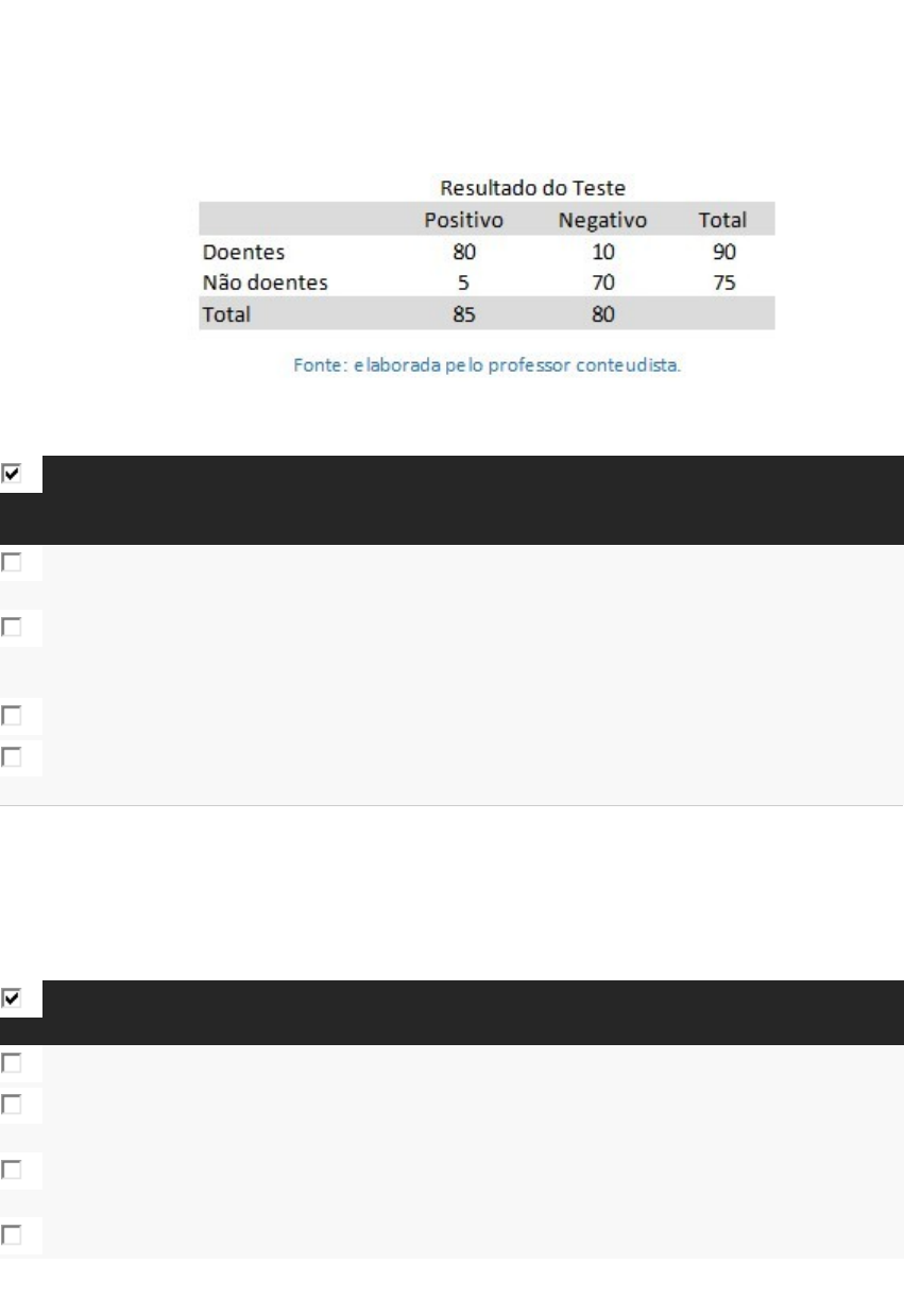 Pergunta 1 0,16 Pontos Um laboratório desenvolveu um teste clínico rápido para detecção de contaminação por Coronavirus Disease 2019 (Covid-19). Para garantir que o teste poderia ser usado com alta confiabilidade foram selecionados 165 pacientes, sendo 90 deles conhecidamente doentes e 75 não doentes. O resultado do teste é apresentado na seguinte Tabela: Analisando os resultados do teste, assinale a alternativa CORRETA: A sensibilidade do novo teste clínico é de 89%, enquanto a especificidade é de 93%, indicando que o teste é mais confiável para a detecção de casos negativos entre os não doentes. Não é possível calcular a sensibilidade e especificidade neste caso por se tratar de teste rápido não confiável. A sensibilidade do novo teste clínico é de 93%, enquanto a especificidade é de 89%, indicando que o teste é mais confiável para detecção de casos positivos entre os doentes. O teste pode ser qualificado como adequado porque acertou em 100% dos casos. O teste pode ser qualificado como adequado para uso, uma vez que a quantidade de acertos positivos entre os doentes é maior que a quantidade de erros. Pergunta 2 0,16 Pontos Em artigos científicos é comum notar que o pesquisador conseguiu verificar o efeito desejado de seu tratamento com p < 5%. Significa que a probabilidade de que haja um erro na pesquisa e que o efeito verificado não seja realmente devido ao tratamento é de 5%. Considerando este cenário, assinale a alternativa CORRETA: Mesmo que o tratamento não seja efetivo, existem 5% de chance de se encontrar resultados que mostrem que o tratamento trouxe de fato alguma melhora. Sempre se trabalha com p < 5% porque é impossível se obter resultados melhores. A pesquisa pode ser sempre considerada como confiável e sem erros quando apresenta p < 5%. A probabilidade de erro na pesquisa científica não existe, uma vez que a estatística é uma ciência exata. 95% dos artigos científicos possuem erros estatísticos. Pergunta 3 0,16 Pontos Uma pesquisa foi realizada entre os alunos moradores do campus de uma universidade para entender se o estresse e o uso excessivo de bebidas alcoólicas tinham alguma correlação. O seguinte diagrama de Venn ilustra o perfil das respostas obtidas: Com base neste diagrama, assinale a alternativa CORRETA: A intersecção entre estudantes que se consideram estressados e fazem uso excessivo de bebidas alcoólicas é de 40%, enquanto a união de estudantes que se consideram estressados ou fazem uso excessivo de bebida alcoólica é de 25%. O uso excessivo de bebidas alcoólicas é mais comum entre os estudantes não estressados. A intersecção entre estudantes que se consideram estressados e fazem uso excessivo de bebidas alcoólicas é de 25%, enquanto a união de estudantes que se consideram estressados ou fazem uso excessivo de bebida alcoólica é de 40%. A maior parte da população dessa universidade faz uso excessivo de bebida alcoólica. A maior parte da população dessa universidade considera-se estressada. Pergunta 4 0,16 Pontos Uma estudante de Farmácia estava com o período menstrual atrasado e resolveu fazer um teste rápido de gravidez para verificar se confirmava ou não a sua suspeita. Antes de fazer o teste, a estudante leu, na especificação do mesmo, que a sensibilidade do teste era de 95%. Considerando este cenário, assinale a alternativa CORRETA: O teste dá resultado negativo quando a mulher não está grávida 95% das vezes. A sensibilidade não é o indicador correto para avaliar a qualidade do teste. O teste dá resultado positivo quando a mulher está grávida 95% das vezes. O teste dá resultado negativo quando a mulher não está grávida 5% das vezes. O teste dá resultado positivo quando a mulher está grávida 5% das vezes. image4.png image1.png image2.wmf image3.wmf