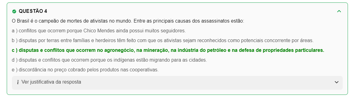 QUESTÃO 4 Brasil é o campeão de mortes de ativistas no mundo. Entre as principais causas dos assassinatos estão: a ) conflitos que ocorrem porque Chico Mendes ainda possui muitos seguidores. b ) disputas por terras entre famílias e herdeiros têm feito com que os ativistas sejam reconhecidos como potenciais concorrente por ) disputas e conflitos que ocorrem no agronegócio, na mineração, na indústria do e na defesa de propriedades particulares. d ) disputas e conflitos que ocorrem porque os indígenas estão migrando para as cidades. e ) discordância no preço cobrado pelos produtos nas cooperativas. i Ver justificativa da resposta