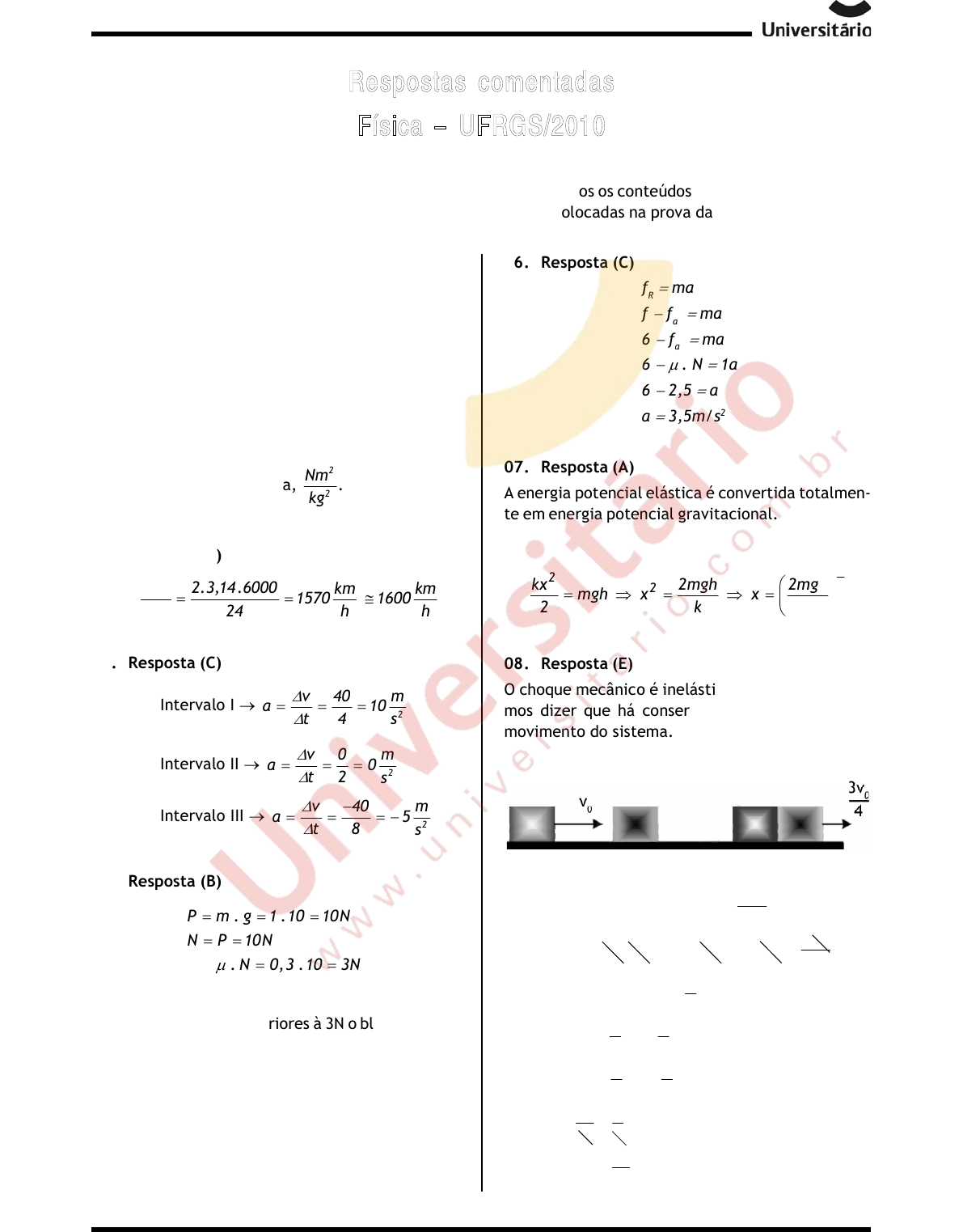 Respostas comentadas Física – UFRGS/2010 01. Resposta (E) I. Correta. II. Correta. III.Correta. 02. Resposta (D) I. Correta. II. Correta. III. Incorreta, 2 2 Nm . kg 03. Resposta (D) 2.3,14.60002 R km km v 1570 1600 T 24 h h π = = = ≅ 04. Resposta (C) Intervalo I → 2 v 40 m a 10 t 4 s ∆ ∆ = = = Intervalo II → 2 v 0 m a 0 t 2 s ∆ ∆ = = = Intervalo III → 2 v 40 m a 5 t 8 s ∆ ∆ − = = = − 05. Resposta (B) P m . g 1 .10 10N N P 10N f . N 0,3 .10 3Nµ = = = = = = = = Portanto para forças inferiores à 3N o bloco se man- terá em repouso, então fR = 0 f − fa = 0 2 − fa = 0 fa = 2N 06. Resposta (C) fR = ma f − fa = ma 6 − fa = ma 6 − µ . N = 1a 6 − 2,5 = a a = 3,5m/s2 07. Resposta (A) A energia potencial elástica é convertida totalmen- te em energia potencial gravitacional. 1 22 2kx 2mgh 2mghmgh x x 2 k k = ⇒ = ⇒ = 08. Resposta (E) O choque mecânico é inelástico, neste caso, pode- mos dizer que há conservação da quantidade de movimento do sistema. ( ) ( ) ( ) 0 1 0 1 2 0 1 1 0 1 1 2 2 1 1 2 1 1 2 1 1 2 1 2 1 2 3v m v 0 m m . 4 3v p .V . v p .V p .V . 4 3 p p p . 4 3 3 p p p 4 4 3 3 p p p 4 4 p 3 p 4 4 p p 3 + = + = + = + = + − = = = Prova com boa distribuição de conteúdos, contemplando todos os conteúdos do ensino médio. Aplicações da física do cotidiano sempre são bem colocadas na prova da UFRGS. 09. Resposta (B) Com o gráfico podemos calcular as densidades ab- solutas dos dois corpos. 3 A 3 m kg P 2 x 10 V m = = 3 B 3 m kg P 1 x 10 V m = = Logo, PA = 2PB Desta forma, podemos dizer que como eles tem o mesmo volume, suas massas se relacionam assim: mA = 2mB Logo, PA = 2PB Sendo os dois corpos mergulhados num líquido, como eles deslocam o mesmo volume de líquido, sofrem o mesmo empuxo. EA = EB 10. Resposta (E) I. Correta. II. Correta. III. Correta. 11. Resposta (C) Baseado nas informações do texto e do gráfico, se o produto p.V dos pontos A e B não forem iguais, te- mos uma transformação ADIABÁTICA. PA . VA = 1 . 2 = 2 pBVB > 2 portanto é ADIABÁTICA e não há troca de calor com a vizinhança. 12. Resposta (E) I. Correta. II. Correta. III. Correta. 13. Resposta (D) cAl = 2 . cFe QAl = QFe ∆TAl = ∆TFe Calculamos a quantidade de calor sensível pela equação: QS = m . c . ∆T Al Fe Al Al Al Al Al Al Al Fe Al Fe Fe Fe Al Fe Q Q m . c . T m . c . T m . 2 . c . T m . c . T 2 . m m ∆ ∆ ∆ ∆ = = = = Fe Al m m 2 = 14. Resposta (B) Corpo neutro: • Número de prótons (+) igual ao de elétrons (−). Corpo carregado positivamente: • PERDE ELÉTRONS! Após o atrito. • Número de prótons (+) maior do que o de elé- trons (−). Corpo carregado negativamente: • RECEBE ELÉTRONS! • Número de prótons (+) menor do que o de elé- trons (−). 15. Resposta (A) Atenção! A carga do próton é designada por +e. 1º. VAB = E . dAB 300 = E . 0,3 VE 100 m= 2º.As linhas de força de um campo elétrico es- tão orientadas no sentido decrescente dos po- tenciais elétricos, logo, da esquerda para a direita. 3º. Trabalho de campo: WFE = VAB . q WFE = 300V . +e WFE = +300eV O mínimo trabalho realizado pelo agente externo tem o mesmo valor numérico e sinal contrário ao do tra- balho realizado pelo campo. externo agenteW 300eV= − 16. Resposta (E) Como os ímãs se repelem os vetores indução do cam- po magnético de cada ímã estarão em sentidos opos- tos e de mesma intensidade. Pela força de Lorentz F = B . v . q . senθ Para atuar uma força magnética sobre o elétron deve haver um campo magnético, como sobre a origem não tem campo a força é zero e a partícula segue sobre o eixo −Z. Sobre os outros pontos do eixo Z existe campo mag- nético, mas na mesma direção do eixo, portanto, a carga que se desloca paralelamente sobre a linha não atua força magnética (senθ = 0). 17. Resposta (B) 2 2 r P R 10 10 10V ∆φε ∆ ε ε ε = − = = = a variação de fluxo no tempo nas 100 espiras é 10V para cada espira temos 10V 0,1V 100 = ou Wb 0,1 s . 18. Resposta (B) Amperímetro em série e voltímetro em paralelo. 19. Resposta (A) A distância do objeto ao espelho é igual a distância da imagem ao espelho e a imagem deve estar na mesma linha reta tomada perpendicularmente a su- perfície do espelho. 20. Resposta (D) Pelo princípio da reversibilidade 21. Resposta (A) Pelas informações o objeto está localizado no 2f. Logo sua imagem é real e de mesmo tamanho do objeto. 22. Resposta (C) I. Incorreta: ocorre com todas as ondas. II. Incorreta: ocorre com todas as ondas. III. Correta. 23. Resposta (B) Duas ondas após o cruzamento mantêm as suas ca- racterísticas. 24. Resposta (D) Pela equação N T T a 1 N N . 2 − ou ocorreram 4 eventos 1280 → 640 →320 → 160 → 80 4 eventos em 5h, como os eventos ocorrem em in- tervalos de tempos iguais 5 1,25h 4 = 25. Resposta (C) Radiação do corpo negro - Lei de Stefan-Boltzmann (1 − b). Efeito Fotoelétrico - Relação de Einstein (2 − c). Onda matéria - Postulado de Louis de Broglie (3 − a ).