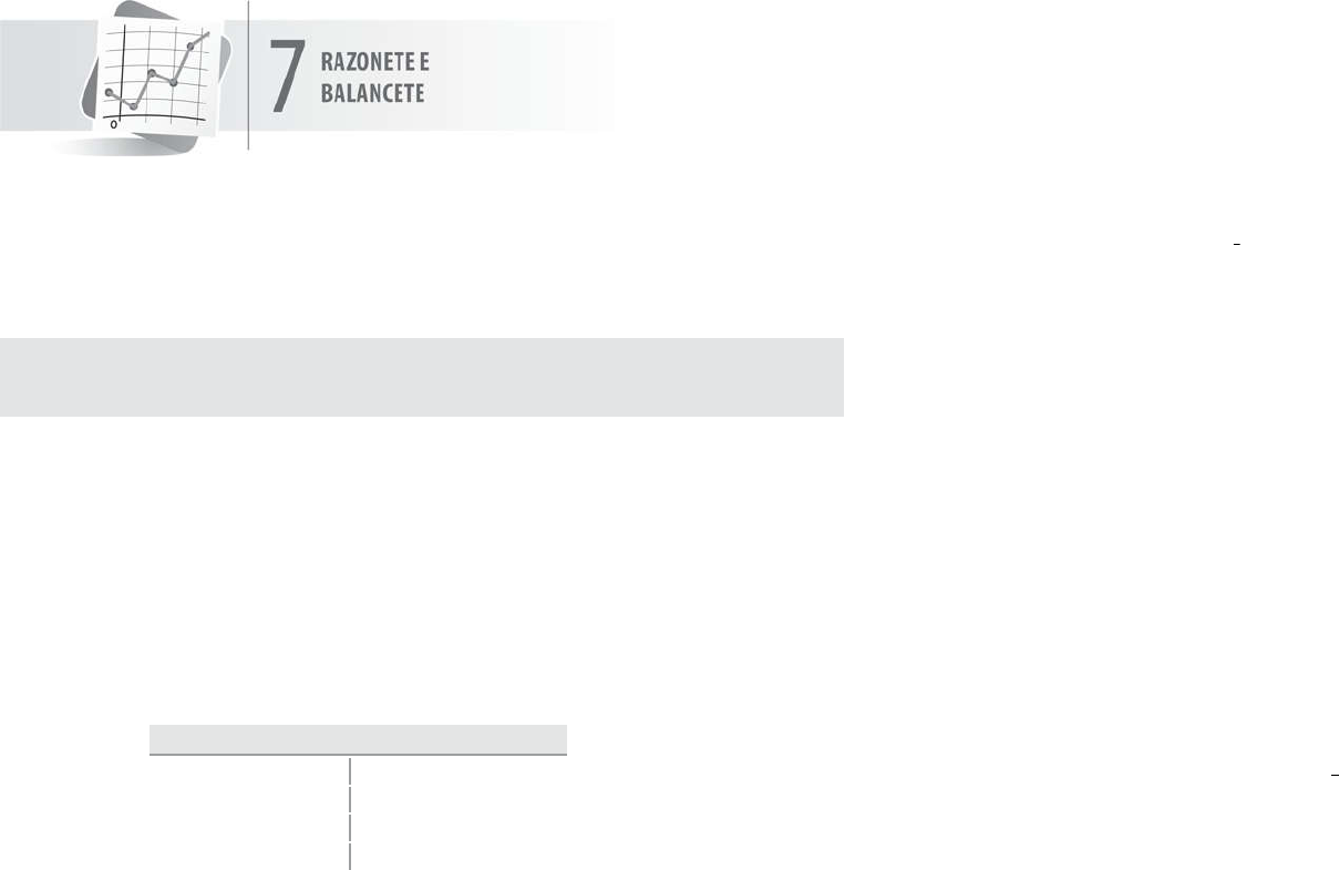 7.1 Razonete Também denominado gráfico em T ou Conta em T, o Razonete nada mais é do que uma versão simplificada do livro Razão. Sob o ponto de vista contábil, o livro Razão, cujo modelo foi apresentado no capítulo anterior, é o mais importante dos livros utilizados pela Contabilidade. Por meio dele é possível controlar, separadamente, o movimento de todas as contas. O controle individualizado das contas é importante para se conhecer os seus saldos, possibilitando a apuração de resultados e a elaboração de demonstrações contábeis, como o Balancete de Verificação do Razão, o Balanço Patrimonial e outras. Para facilitar a aprendizagem do processo contábil, substituiremos o livro Razão pelo Razonete, o qual, por se tratar de versão simplificada, favorecerá a visualização do movimento de débito e de crédito nele lançados. Veja um modelo de Razonete: CAIXA D C Esse é o Razonete da conta Caixa. No lado esquerdo, lado do débito, lançaremos todas as importâncias que representarem entradas de Caixa; no lado direito, lado do crédito, lançaremos todas as importâncias que representarem saídas de Caixa. Sendo assim, para controlar o movimento das contas, em substituição ao livro Razão didaticamente poderemos utilizar gráficos em T, em número igual ao de contas existentes na Escrituração do livro Diário. Esse mesmo gráfico em T já foi utilizado para representar o Balanço Patrimonial, lembra-se? Agora, ele será utilizado para controlar o movimento individualizado das contas. Veja, no Exemplo Prático a seguir, como se deve proceder para lançar valores nos Razonetes. Exemplo Prático: Escriturar, no Diário e em Razonetes, os seguintes eventos: 1. Investimento inicial em dinheiro no valor de $ 50.000. 2. Compra de um automóvel, à vista, por $ 30.000. 3. Depósito efetuado no Banco Urupês S/A, no valor de $ 20.000. 4. Saque efetuado mediante o cheque no 1, de nossa emissão, contra o Banco Urupês S/A, no valor de $ 5.000, para reforço de Caixa. Veja, inicialmente, como esses Fatos serão lançados em partidas de Diário: DIÁRIO (1) Caixa a Capital Investimento inicial 50.000 _________________ _________________ (2) Veículos a Caixa Compra de um automóvel 30.000 _________________ _________________ (3) Bancos conta Movimento Banco Urupês S/A a Caixa N/depósito 20.000 _________________ _________________ (4) Caixa a Bancos conta Movimento a Banco Urupês S/A Saque mediante o n/cheque no 1 5.000 _________________ _________________ Veja, agora, como escriturar nos Razonetes: Orientações Gerais: • Devemos utilizar tantos Razonetes quantas forem as contas utilizadas na Escrituração do Diário; entretanto, cada conta terá um só Razonete. • Lançaremos os valores no débito ou no crédito das contas, conforme estejam debitadas ou creditadas no Diário. • Para evitar enganos, os registros nos Razonetes devem obedecer rigorosamente a ordem em que as contas se encontram escrituradas no livro Diário. Acompanhe, agora, as orientações para registro dos valores referentes ao exemplo em questão: Iniciaremos os registros, obviamente, pelo lançamento 1 do Diário. Observe que neste lançamento consta, em primeiro lugar, no débito, a conta Caixa. Assim, o primeiro registro que faremos nos Razonetes será o débito de $ 50.000, no Razonete da conta Caixa. Veja: CAIXA (1) 50.000 Para facilitar a identificação da origem dos valores lançados nos Razonetes, podemos colocar, à esquerda de cada valor, o número do lançamento de Diário do qual foi extraído o respectivo valor. Por este motivo, colocamos o algarismo 1 à esquerda dos 50.000 lançados no débito de Caixa. Agora que já lançamos $ 50.000 no débito da conta Caixa, o próximo passo será lançar o mesmo valor no Razonete da conta Capital, que é a contrapartida da conta Caixa no lançamento 1. Observe que a conta Capital está creditada, pois vem precedida da preposição a. Veja como ficará o lançamento no Razonete da respectiva conta: CAPITAL (1) 50.000 É fácil, não é mesmo? Como temos duas contas no lançamento 1, registramos o valor de $ 50.000 duas vezes nos Razonetes, ou seja, uma vez no débito do Razonete da conta Caixa e uma vez no crédito do Razonete da conta Capital. Em seguida, passaremos para o lançamento 2 do Diário. Observe que neste lançamento consta, no débito, a conta Veículos. Sendo assim, lançaremos no Razonete da conta Veículos, no lado do débito, a importância de $ 30.000. Veja: VEÍCULOS (2) 30.000 Como a contrapartida da conta Veículos no lançamento 2 é a conta Caixa, a qual está creditada, lançaremos também no Razonete da conta Caixa, no lado do crédito, a importância de $ 30.000. CAIXA (1) 50.000 (2) 30.000 Observe que no Razonete da conta Caixa já havia um débito de $ 50.000, referente ao lançamento 1. Portanto, é assim que procedemos para transcrever os valores do Diário para os Razonetes: primeiro lançamos o valor da conta devedora e, posteriormente, o da conta credora. No lançamento 3 do Diário, a conta Bancos conta Movimento possui um débito de $ 20.000. Veja como ficará esse registro: BANCOS CONTA MOVIMENTO (3) 20.000 Como a contrapartida da conta Bancos conta Movimento, neste mesmo lançamento 3, é a conta Caixa, que possui um crédito de $ 20.000, veja como ficará o Razonete: CAIXA (1) 50.000 (2) 30.000 (3) 20.000 Vamos, finalmente, transcrever o lançamento 4. Neste lançamento, a conta Caixa é debitada por $ 5.000. Veja: CAIXA (1) 50.000 (2) 30.000 (4) 5.000 (3) 20.000 Como a contrapartida da conta Caixa, neste lançamento 4, é a conta Bancos conta Movimento, temos: BANCOS CONTA MOVIMENTO (3) 20.000 (4) 5.000 Lembre-se que, no lançamento de Diário, uma conta é contrapartida da outra. Assim, no lançamento 1 do nosso exemplo, a conta Caixa é contrapartida da conta Capital e vice-versa. Pronto, já explicamos como se transferem valores do Diário para os Razonetes e temos certeza de que você entendeu o proces
