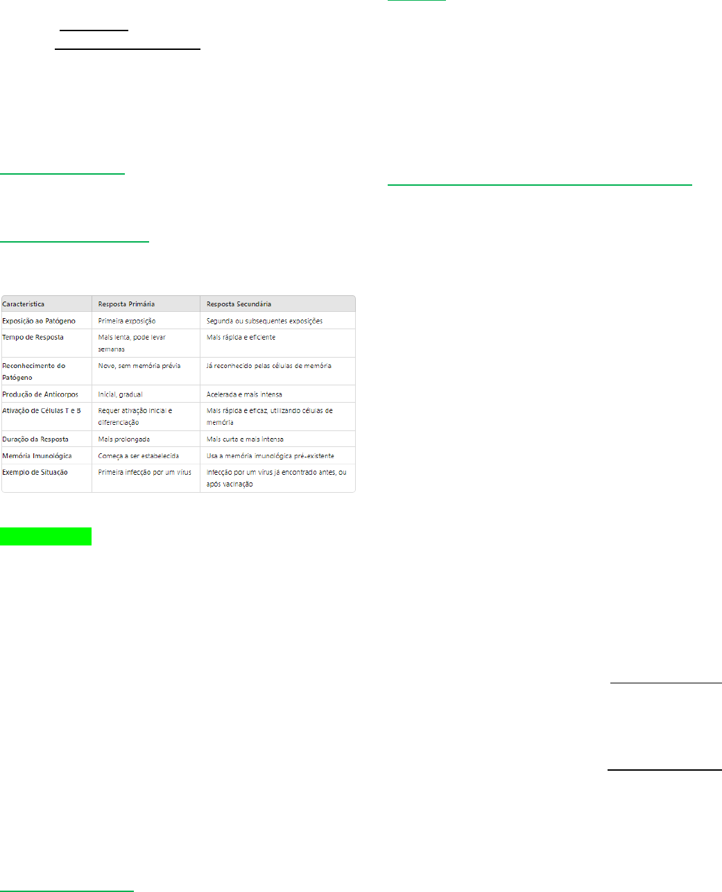 IMUNOLOGIA IMUNIDADE ADQUIRIDA A imunidade adquirida, também conhecida como adaptativa, reconhece cada patógeno e age de maneira específica para combatê-los. Além disso, ela cria memória imunológica, para que haja uma memória de defesa para saber como destruir aquele patógeno específico em caso de invasões futuras. Existem duas fases principais dessa resposta: a resposta primária e a resposta secundária. Resposta primária: é a resposta imunológica que ocorre quando o corpo encontra um patógeno pela primeira vez. Resposta Secundária: é a resposta imunológica que ocorre quando o corpo encontra o mesmo patógeno novamente. LINFÓCITOS Os linfócitos são um tipo de glóbulo branco (ou leucócito) que desempenham um papel crucial no sistema imunológico. Eles são responsáveis por reconhecer e combater patógenos, como vírus e bactérias, bem como células anormais, como as células cancerosas. Linfócitos B: são responsáveis pela produção de anticorpos, que são proteínas que se ligam a patógenos específicos, marcando-os para destruição por outras células do sistema imunológico. Linfócitos T: participam na resposta imunológica celular. Eles ajudam a destruir células infectadas ou anormais e também coordenam a resposta de outros elementos do sistema imunológico. Local de maturação • Linfócitos B: maturam na medula óssea, onde aprendem a distinguir entre antígenos próprios e não próprios. • Linfócitos T: maturam no timo, onde também aprendem a reconhecer antígenos estranhos e a não reagir contra antígenos próprios. Funções • Linfócitos B: produzem anticorpos que neutralizam ou marcam patógenos para destruição. • Linfócitos T: coordenam a resposta imunológica, ajudando outras células (T auxiliares) ou destruindo diretamente células infectadas ou cancerosas (T citotóxicos). Receptores de reconhecimento de antígenos • Linfócitos B: possuem receptores de células B (BCRs), que são anticorpos na superfície celular que reconhecem antígenos diretamente em sua forma nativa. Os linfócitos B têm na superfície de suas membranas receptores chamados BCRs. Esses receptores reconhecem antígenos diretamente, ou seja, sem a necessidade de processamento prévio por outras células. Quando um BCR se liga a um antígeno, o linfócito B pode ser ativado, levando à sua proliferação e diferenciação em células plasmáticas, que são células especializadas na produção de anticorpos. Esses anticorpos são versões solúveis dos BCRs e circulam no sangue, ligando-se ao mesmo antígeno que ativou o linfócito B. • Linfócitos T: possuem receptores de células T (TCRs), que reconhecem fragmentos de antígenos apresentados por moléculas do Complexo Principal de Histocompatibilidade (MHC) na superfície de outras células: ○ T Citotóxicos (CD8⁺): reconhecem antígenos apresentados por moléculas MHC Classe I. Ativados, eles destroem a célula que está apresentando o antígeno. ○ T Auxiliares (CD4⁺): reconhecem antígenos apresentados por moléculas MHC Classe II. Ativados, eles ajudam a coordenar a resposta imune, ativando outras células do sistema imunológico. Os linfócitos T possuem receptores chamados TCRs, que são específicos para fragmentos de antígenos, conhecidos como peptídeos. Diferente dos linfócitos B, os linfócitos T não reconhecem os antígenos diretamente. Em vez disso, os antígenos precisam ser processados e apresentados na superfície de outras células do corpo por moléculas chamadas MHC. As moléculas de MHC estão localizadas na membrana (superfície) de várias células do corpo. Dentro da célula, os antígenos são processados em pequenos fragmentos (peptídeos). Esses peptídeos são então carregados e apresentados na superfície da célula pelo MHC, onde fica exposto para reconhecimento pelos linfócitos T. ✦ Complexo receptor TCR O complexo do receptor de células T (TCR) é uma estrutura crucial para a ativação dos linfócitos T, permitindo que essas células reconheçam antígenos apresentados pelas moléculas de MHC. A estrutura do TCR é composta por várias subunidades que trabalham juntas para reconhecer o antígeno e transmitir sinais ao interior da célula, ativando a resposta imune. ✧ O TCR é composto principalmente por duas cadeias de proteínas chamadas TCRα (cadeia alfa) e TCRβ (cadeia beta). ✧ Cada uma dessas cadeias tem uma região variável (V) e uma região constante (C). A região variável é a que confere especificidade ao TCR, permitindo o reconhecimento de diferentes antígenos. Tais regiões variáveis das cadeias formam o local de ligação ao antígeno, que se liga ao complexo peptídeo-MHC na superfície de outra célula. ✧ As cadeias α e β atravessam a membrana plasmática do linfócito T, ancorando o TCR na superfície da célula. ✧ As porções intracelulares das cadeias α e β do TCR são curtas e não participam diretamente da sinalização intracelular. Para que a sinalização ocorra, o TCR depende de outras proteínas associadas, conhecidas como os marcadores CD (CD3). Marcadores CD Os marcadores CD são moléculas de superfície que ajudam a identificar diferentes tipos de células imunológicas e desempenham funções específicas que ajudam as células a interagir com seu ambiente ou com outras células. • CD3: presente em todos os linfócitos T, faz parte do complexo TCR e é essencial para a sinalização após o reconhecimento do antígeno. • CD4: presente nos linfócitos T auxiliares, facilita a ligação do TCR ao MHC Classe II. • CD8: presente nos linfócitos T citotóxicos, facilita a ligação do TCR ao MHC Classe I. PROCESSAMENTO E APRESENTAÇÃO DE ANTÍGENOS (linfócitos T) Células apresentadoras de antígenos profissionais (APCs) São aquelas que têm a capacidade de processar e apresentar antígenos aos linfócitos T de maneira eficiente e especializada. Células Dendríticas: capturam e apresentam antígenos d
