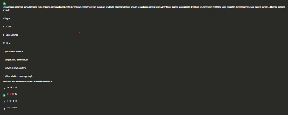 8 começam as ocasionadas ação Essas mudanças resultarão nas das aparecimento de eo aumento órgãos do sistema associe seguir. Vagina Tubas uterinas IV ( da ( Assinate que apresentaa sequência CORRETA: A B -IV I-IL