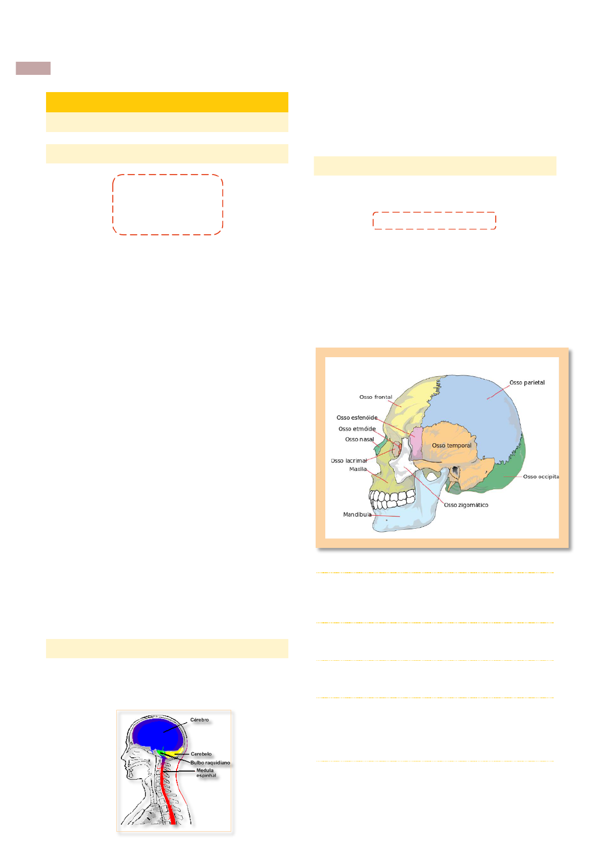 Impresso por Mísia Helena, CPF 161.877.967-21 para uso pessoal e privado. Este material pode ser protegido por direitos autorais e não pode ser reproduzido ou repassado para terceiros. 19/04/2022 13:28:58 1 Gabriela Gomes – Resumo NP1 NEURO– RESUMO NP1 NEUROCIÊNCIAS OSSOS E SUAS FUNÇÕES 1- Sustentação 2- Locomoção 3- Proteção 4- Fabricação de sangue 1- Crânio 2- Calota craniana 3- Osso frontal 4- Osso occipital 5- Osso parietal direito 6- Osso parietal esquerdo 7- Osso temporal direito 8- Osso temporal esquerdo 9- Suturas denteadas 10- Meato acús�co 11- Osso esfenoide 12- Osso etmoide 13- Placa clivada 14- Sela turca 15- Maxilar superior 16- Maxilar inferior 17- Zigomá�ca - maçãs 18- Vértebras cervicais (7) 19- Vértebras torácicas (11) 20- Vértebras lombares (5) 21- Vértebras sacrais (5) 22- Vértebras cóccix (4) 23- Canal raquiano - medula 24- Discos intervertebrais 25- Sinos 26- Vômer - base do nariz 27- Forame magno 28- Vértebras do corpo 29- Processos espinais 30- Canal vertebral 31- Coluna vertebral MEDULA A medula óssea vermelha está dentro dos ossos e é um tecido hematopoié�co (células renovadas a cada 3 meses). A medula é guardada no canal raquiano, dentro do crânio, que é guardado no encéfalo. A par�r do bulbo em diante é a que medula espinal, passa pelo canal raquiano - empilhamento de vértebras. A medula é um cordão que passa pelo corpo vertebral. Corpo vertebral processos espinais medula. – – ENTENDENDO A CABEÇA O cérebro é só uma das partes do encéfalo, a maior de todas. Encéfalo é “toda a estrutura” dentro da cabeça. Encéfalo + medula = SNC Enquanto bebês, o crânio é uma junção de peças, para que assim o bebê possa passar pela vagina ao nascer. Posteriormente essas peças se juntam em suturas denteadas. Os são cavidades nos ossos sinos responsáveis por deixar o crânio mais leve. Sinusite: obstrução dos sinos (não passa oxigênio - sensação de “cabeça pesada”). A calota craniana é a parte de cima do crânio. OSSO FRONTAL Fica na parte da frente, por cima do lobo frontal (motricidade somática movimentos e cognição). – OSSOS PARIETAIS Por cima dos lobos parietais (sensibilidade geral). OSSO OCCIPITAL Na parte de trás, por cima do lobo occipital (visão). OSSOS TEMPORAIS * T Ê M P O R A Nas laterais, em cima dos (audição lobos temporais e memória). É na que fica o fossa temporal meato acús�co onde começa o ouvido. OSSO ETMOIDE Forma o teto do globo ocular, e no centro dele tem a placa clivada que separa os dois nervos olfa�vos. Impresso por Mísia Helena, CPF 161.877.967-21 para uso pessoal e privado. Este material pode ser protegido por direitos autorais e não pode ser reproduzido ou repassado para terceiros. 19/04/2022 13:28:58 2 Gabriela Gomes – Resumo NP1 NEURO– Tecido lipoproteico OSSO ESFENOIDE No centro dele tem a que abriga a hipó�se. sela turca FOSSA CEREBELAR Forma duas cavidades que guardam o cerebelo. VÉRTEBRAS Entre uma vértebra e outra tem um disco intervertebral - coxim. Os nervos passam pelos coxins, e com o avançar da idade eles se desgastam, pressionando os nervos. Nervos sobem a informação para o AFE R E N T E S cérebro (estou com fome, estou ouvindo); nervos EFE R E N T E S descem a informação do cérebro para o corpo (estou escrevendo, estou comendo). C1 A C7 Pescoço (cervicais). O SN visceral está aqui. T1 A T12 Caixa torácica (caixa torácica/costela). L1 A L5 Lombares (a medula termina na 5). OSSO SACRAL 5 vértebras sacrais CÓCCIX 4 pequenas vértebras Nesses dois úl�mos não tem medula já FIM DA AULA (13/08) SISTEMA NERVOSO E NEURÔNIOS O sistema nervoso é formado por dois grupos de células, os neurônios e as gliais. Neurônios são células nervosas diferenciadas, considerados unidades básicas do sistema nervoso. Diferenciadas porque são células que não se reproduzem, têm formas variadas, são insensíveis à dor e precisam de glicose e oxigênio para sobreviver. A linguagem deles é química e eles andam em cadeia. Gliais sustentação têm a função de dos neurônios (que são gela�nosos) e de (porque o sangue não nutrição pode penetrá-los diretamente para levar nutrientes, pois eles morreriam). O acúmulo delas que gera os tumores cerebrais. Ao nascer, temos cerca de 80 bilhões de neurônios e 20 bilhões de . Ao longo dgliais a vida o número de neurônios decai, enquanto que o de gliais vai aumentando até que se equilibram. HISTOLOGIA (TECIDOS) O cérebro é composto por: H2O (80%) Proteínas (15%) Lipídeos (3%) Sais minerais (2%) O NEURÔNIO CorpCorpCorpCorpCorpo celo celo celo celo celularularularularular Ax Ax Ax Ax Axônioônioônioônioônio11111 22222 TeTeTeTeTeledledledledledendoendoendoendoendo Se houver morte em 1, morre todo o restante; se houver morte em 2, há regeneração. Dendritos: captam es�mulos exógenos (de fora - som) e endógenos (de dentro - fome) que chegam até eles. Corpo celular: pega esses es�mulos e decodi�ca, fazendo uma discriminação (pensa, elabora e decide). A junção de todos os corpos celulares forma a massa cinzenta (córtex). O pensar acontece aqui. Axônios: conduzem os es�mulos para fora até um efetor qualquer. A junção de todos os axônios forma a massa branca Cérebro Medula Massa cinzenta externa Massa cinzenta interna Massa branca interna Massa branca externa MAS COMO FUNCIONA? Neurônio pré sináp�co|Fenda sináp�ca|Neurônio pós sináp�co Quando um es�mulo chega ao pré sináp�co, movimenta os íons (que ao reagirem, criam uma diferença de potencial, gerando uma corrente elétrica) até que ele �ca eletricamente carregado ( ) e gera um ++ impulso nervoso que percorre o axônio, chega nos botões terminais e os rompe, “derrubando” na fenda um neurotransmissor, passando a corrente elétrica para o pós sináp�co e �cando (o pré) descarregado novamente. Uma acontece quando todos os convulsão neurônios de alguém estão c