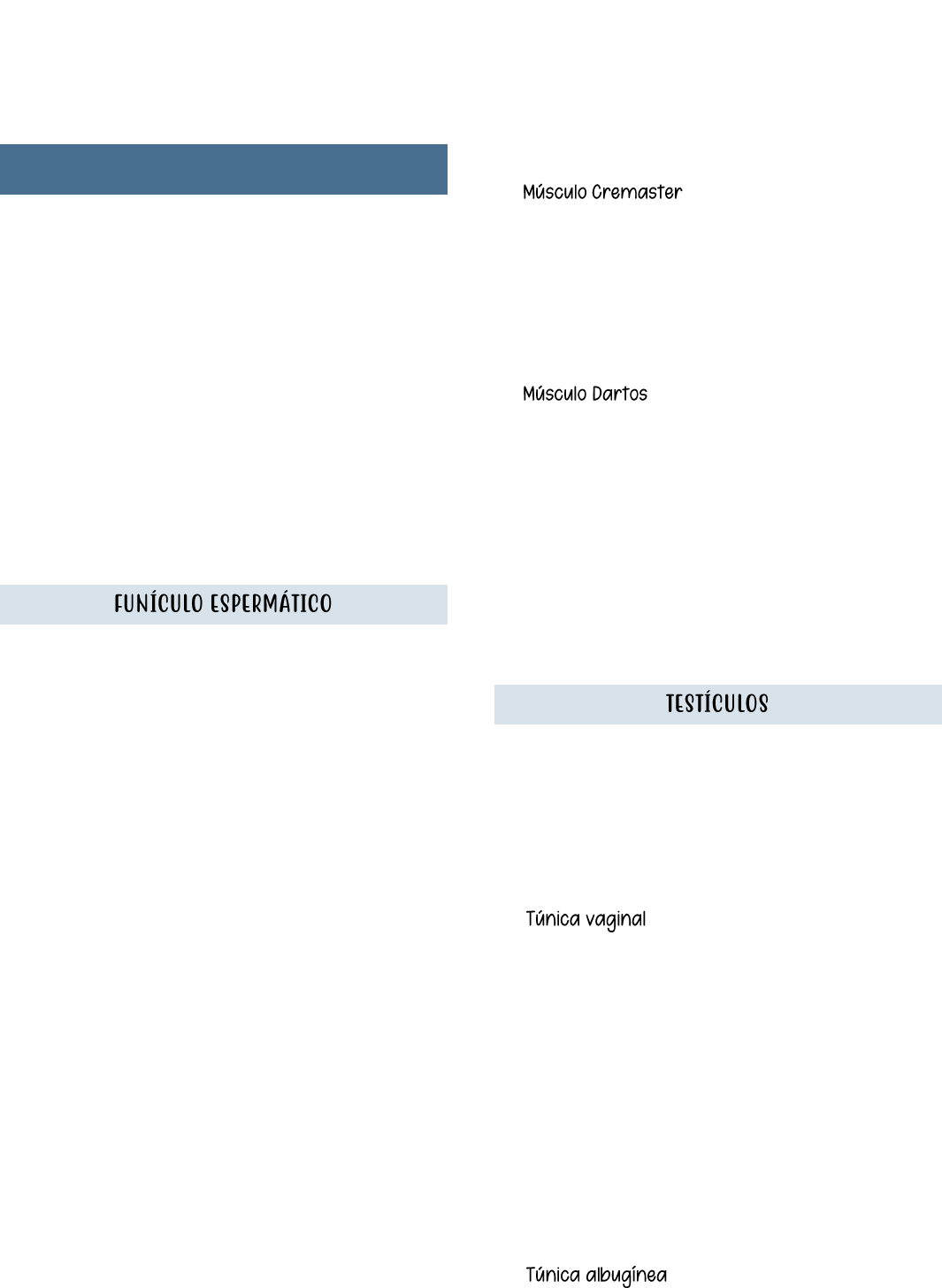 ÓRGÃOS GENITAIS INTERNOS Testículos, epidídimo, ductos deferentes, glândulas seminais, ductos ejaculatórios, próstata e glândulas bulbouretrais. ► Testículos e epidídimo: localizados no períneo após o nascimento, porém são formados (período embriológico) no abdome. A migração para o períneo ocorre através do canal inguinal, portanto, são estudados em relação à parede anterior do abdome (região inguinal). São considerados órgãos genitais internos por causa da sua posição no desenvolvimento e homologia com os ovários, que são internos. Contém estruturas que entram e saem do testículo e suspende o testículo no escroto (estrutura de apoio). ► Começa no anel inguinal profundo, atravessa o canal inguinal, sai no anel inguinal superficial e termina no escroto na margem posterior do testículo. ▶ Constituintes do funículo espermático: • Ducto deferente; • Artéria testicular; • Artéria do ducto deferente; • Artéria cremastérica; • Plexo venoso pampiniforme; • Fibras simpáticas; • Ramo genital do nervo genitofemoral; • Vasos linfáticos; ▶ Revestimento do funículo espermático: • Fáscia espermática interna; • Fáscia cremastérica; • Fáscia espermática externa; Os revestimentos são derivados da parede anterolateral do abdome durante o desenvolvimento pré-natal. ▶ : músculo estriado formado pelos fascículos inferiores do músculo oblíquo interno do abdome. Possui suas alças na fáscia cremastérica. Traciona o testículo para cima no escroto, principalmente em resposta ao frio e costuma atuar junto com o músculo dartos. ▶ : músculo liso da tela subcutânea do escroto, que se insere na pele, ajudando na elevação do testículo enquanto causa a contração da pele do escroto, também em resposta ao frio. ➣ O músculo cremaster é inervado pelo ramo genital do nervo genitofemoral – derivado do plexo lombar (inervação somática). O músculo dartos recebe inervação autônoma. São as gônadas masculinas – pares de glândulas ovais que produzem espermatozoides e testosterona. Estão suspensos no interior do escroto pelos funículos espermáticos, e o testículo esquerdo normalmente se localiza em posição mais baixa. ► : é um saco peritoneal que circunda parcialmente o testículo. O recesso da túnica vaginal forma o seio do epidídimo, entre o corpo do epidídimo e a face posterolateral do testículo. Sua lâmina parietal é adjacente à fáscia espermática interna. A lâmina visceral cobre a superfície de cada testículo, exceto no local onde se liga ao epidídimo e ao funículo espermático. Entre as duas lâminas existe a cavidade da túnica vaginal, o pequeno acúmulo de líquido permite o movimento livre dos testículos no interior do escroto. ► : interna à lâmina visceral da túnica vaginal, é uma membrana fibrosa e resistente que reveste diretamente cada testículo. Sistema Reprodutor Masculino A túnica albugínea se espessa em uma crista na face posterior e forma o mediastino do testículo. A partir do mediastino, septos fibrosos da túnica se estendem e formam os lóbulos do testículo. Cada lóbulo contém túbulos seminíferos espiralados – unidades funcionais do testículo. ► : rede de canais no mediastino do testículo. Os túbulos seminíferos se unem a essa rede por meio dos túbulos seminíferos retos. ► As longas artérias testiculares originam-se da face anterolateral da parte abdominal da aorta, imediatamente abaixo das artérias renais. Elas seguem no retroperitônio (posterior ao peritônio) em direção oblíqua, cruzando sobre os ureteres e as partes inferiores das artérias ilíacas externas para chegar aos anéis inguinais profundos. Entram nos canais inguinais através dos anéis profundos, atravessam os canais, saem deles através dos anéis inguinais superficiais e entram nos funículos espermáticos para irrigar os testículos. A artéria testicular ou um de seus ramos anastomosa-se com a artéria do ducto deferente. As veias que emergem do testículo e do epidídimo formam o plexo venoso pampiniforme, uma rede de 8 a 12 veias situadas anteriormente ao ducto deferente e que circundam a artéria testicular no funículo espermático. O plexo pampiniforme faz parte do sistema termorregulador do testículo (juntamente com os músculos cremaster e dartos), ajudando a manter essa glândula em temperatura constante. As veias de cada plexo pampiniforme convergem superiormente, formando uma veia testicular direita, que entra na veia cava inferior (VCI), e uma veia testicular esquerda, que entra na veia renal esquerda. A drenagem linfática do testículo segue artéria e veia testiculares até os linfonodos lombares direitos e esquerdos (caval/aórtico) e pré-aórticos. ► Os nervos autônomos do testículo originam-se como o plexo nervoso testicular sobre a artéria testicular, que contém fibras simpáticas do segmento T10 (e às vezes de T11) da medula espinal, fibras aferentes viscerais e, talvez, fibras parassimpáticas vagais. Fibras autônomas também chegam ao testículo via plexo deferencial. Estrutura alongada na face posterior do testículo. ► : transportam os espermatozoides recém desenvolvidos da rede do testículo para o epidídimo. ► : suas pequenas alças espiraladas formam o epidídimo. Diminui progressivamente da cabeça até a cauda do epidídimo. Ao longo do trajeto pelo ducto, os espermatozoides são armazenados e continuam a amadurecer. O epidídimo é formado por: • Cabeça: parte superior e expandida, formada pelas extremidades dos ductúlos eferentes; • Corpo: formado pelo enovelamento do ducto do epidídimo; • Cauda: contínua com a porção inicial do ducto deferente; É a continuação da cauda ducto do epidídimo, possui 45 cm de comprimento e conduz os espermatozoides do epidídimo para o ducto ejaculatório. A partir da cauda do epidídimo, o ducto deferente tem o seguinte trajeto: → Ascende ao longo da face posterior do t