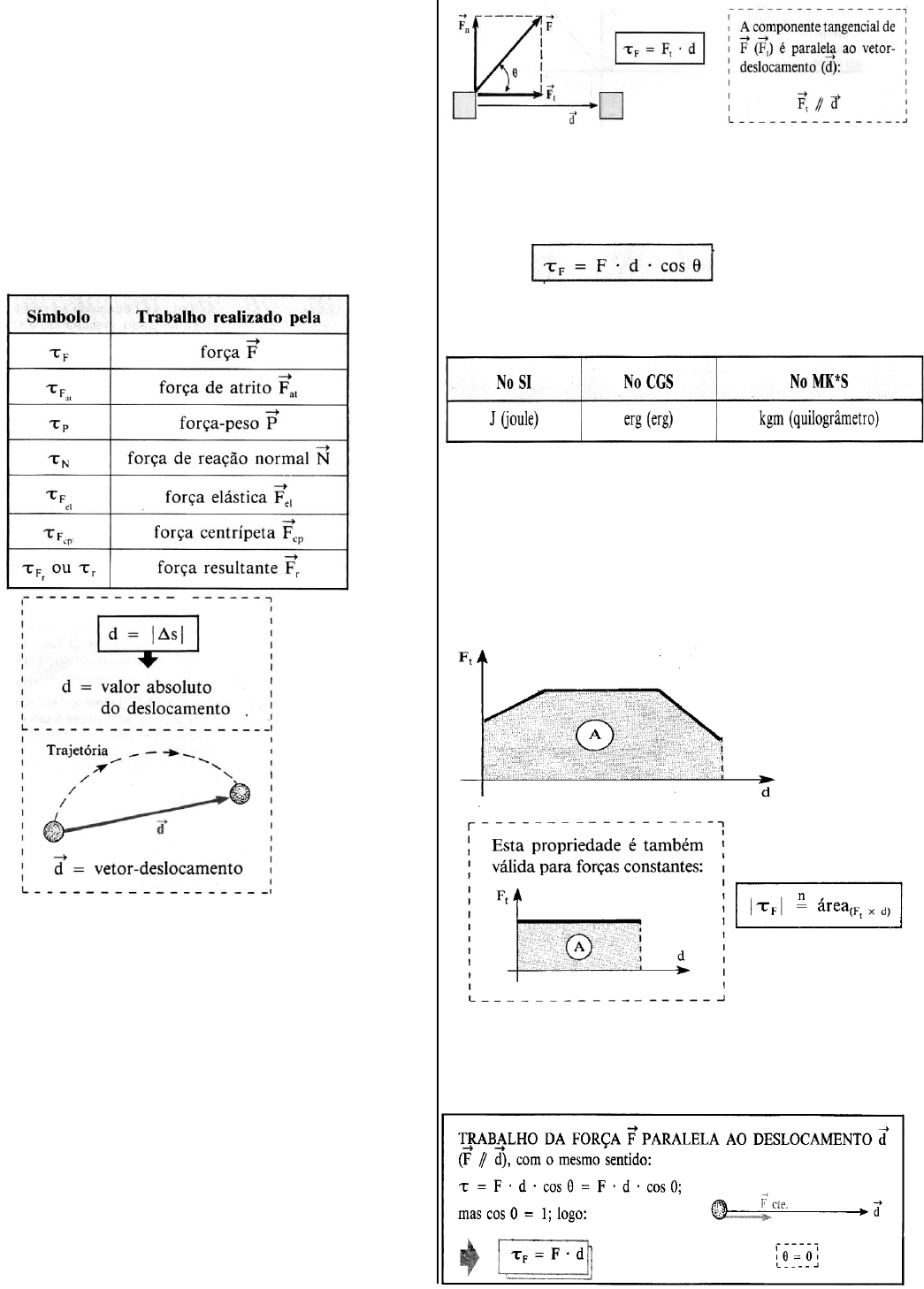Física Fácil – prof. Erval Oliveira Aluno:_______________________________ O termo trabalho utilizado na Física difere em significado do mesmo termo usado no cotidiano. Fisicamente, um trabalho só é realizado por forças aplicadas em corpos que se deslocam. Portanto, deve-se dizer “trabalho realizado pela força aplicada por pessoas, máquinas etc.” e não “trabalho realizado por pessoas, máquina etc.”. serão usadas as notações: Obs.: a) Trabalho motor é o trabalho realizado por uma força que favorece o deslocamento do corpo no qual atua; seu valor é positivo ( 0 ) b) Trabalho resistente é o trabalho da força que se opõe ao deslocamento do corpo no qual age; seu valor é negativo ( 0 ). 2. DEFINIÇÃO MATEMÁTICA DE TRABALHO Considere-se uma força constante atuando numorpo que sofre um deslocamento d. Sendo O o ângulo formado pelos vetores F e d, define-se matematicamente o trabalho da força F ( F ) como sendo o produto da intensidade da componente tangencial de F (F) pela intensidade do deslocamento (d): Mas, sabe-se que Ft = F cos . Portanto, a expressão geral para o cálculo do trabalho de F constante é: As unidades de medida mais importantes do trabalho, que é uma grandeza escalar, são: TRABALHO DE UMA FORÇA VARIÁVEL O cálculo do trabalho realizado por uma força de intensidade variável envolve a utilização de técnicas matemáticas estudadas em cursos superiores. Para simplificar, pode-se calcular tal trabalho através da área do diagrama F x d (intensidade da componente tangencial de F em função dos valores do deslocamento): 4. CASOS PARTICULARES A seguir, serão analisados alguns casos de realização (ou não) de trabalho por forças diversas. POTÊNCIA (Pot) Para se medir a rapidez com que um determinado trabalho é realizado, define-se uma grandeza escalar denominada potência. As unidades de medida de potência são: GRÁFICO POTÊNCIA X TEMPO RENDIMENTO Quando uma máquina está em funcionamento, deve receber uma determinada potência para que possa operar. Essa potência é denominada potência total (Pot). Mas, nos casos reais, a potência total não é aproveitada inteiramente, dividindo-se em duas parcelas: a potência útil (Potu) e a potência dissipada (Potd): Para que se saiba qual é o aproveitamento que a máquina (ou um sistema físico) faz da potência total recebida, define-se o rendimento ( ) através da razão entre as potências útil e total: Note-se que o rendimento é uma grandeza adimensional, não tendo, portanto, unidade de medida. Freqüentemente, indica-se o rendimento percentual (i) multiplicando-se por 100: ENERGIA Um dos conceitos primitivos mais importantes na Física é o da energia — uma grandeza escalar que se manifesta de várias formas no Universo. A energia relaciona-se diretamente com o trabalho. Se um sistema físico possui energia, ele é capaz de realizar trabalho. São conhecidas diversas modalidades de energia, conforme a sua natureza: elétrica, térmica, química, luminosa, nuclear, mecânica etc., podendo ocorrer transformações mútuas entre elas. A energia mecânica é aquela devida a corpos em movimento (energia cinética) e/ou armazenada em sistemas físicos (energia potencial). ENERGIA CINÉTICA (EJ Para que um corpo esteja em movimento em relação a um dado referencial é preciso que haja uma forma de energia denominada energia cinética. A expressão para o cálculo dessa energia aparece num dos mais importantes teoremas da Dinâmica: o Teorema da Energia Cinética (TEC). A grandeza escalar expressa por 2 2vm Ec é a energia cinética de um corpo em relação a um referencial. TEOREMA DA ENERGIA CINÉTICA (TEC) Como foi visto no segmento anterior, o trabalho da força resultante corresponde à diferença entre os valores final e inicial da energia cinética. TEC: “O trabalho da força resultante é medido pela variação da energia cinética.” ENERGIA POTENCIAL (Ep) A energia potencial é a energia armazenada num sistema físico e pode ser transformada em energia cinética. Na Mecânica, são consideradas duas formas de energia potencial: a gravitacional (Epg) e a elástica (Epe) ENERGIA MECÂNICA (Em) A soma das energias cinética e potencial de um sistema físico é chamada de energia mecânica: CONSERVAÇÃO DA ENERGIA MECÂNICA Nos fenômenos mecânicos, pode-se processar a transformação entre as energias cinética e potencial. É importante salientar que, na ausência de forças dissipativas, a energia mecânica é conservada (permanece constante), havendo apenas transformações em suas formas cinética e potencial. Um sistema físico nestas condições é dito sistema conservativo. Desprezando-se as forças dissipativas, como atritos e resistência do ar, um corpo, durante seu movimento, apresenta; Portanto, se a energia mecânica se mantiver constante durante o movimento de um corpo, em quaisquer dos pontos de sua trajetória, esta energia terá o mesmo valor, podendo-se escrever: Caso haja atrito a variação da energia mecânica será igual ao trabalho da força de atrito. momfFat EE EXERCíCIO 1º) Sob a ação de uma força constante, um corpo de massa m=4,0kg adquire, a partir do repouso, a velocidade de 10m/s. a) Qual é trabalho realizado por essa força? b) Se o corpo se deslocou 25m, qual o valor da força aplicada? 2º) Uma criança solta uma pedrinha de massa m=50g, com velocidade inicial nula, do alto de um prédio de 100m de altura. Devido ao atrito com o ar, o gráfico da posição da pedrinha em função do tempo não é mais a parábola y=100-5t 2 , mas sim o gráfico representado adiante. a) Com que velocidade a pedrinha bate no chão (altura=0)? b) Qual é o trabalho realizado pela força de atrito entre t=0 e t=11 segundos? 3º) Uma partícula de massa m=10g se move no plano x, y com uma velocidade tal que sua componente, ao longo do eixo x, é de 4,0m/s e, ao longo do eixo y, é de 2,0m/s. Nessas condições, pode-se afirmar que sua energia cinética