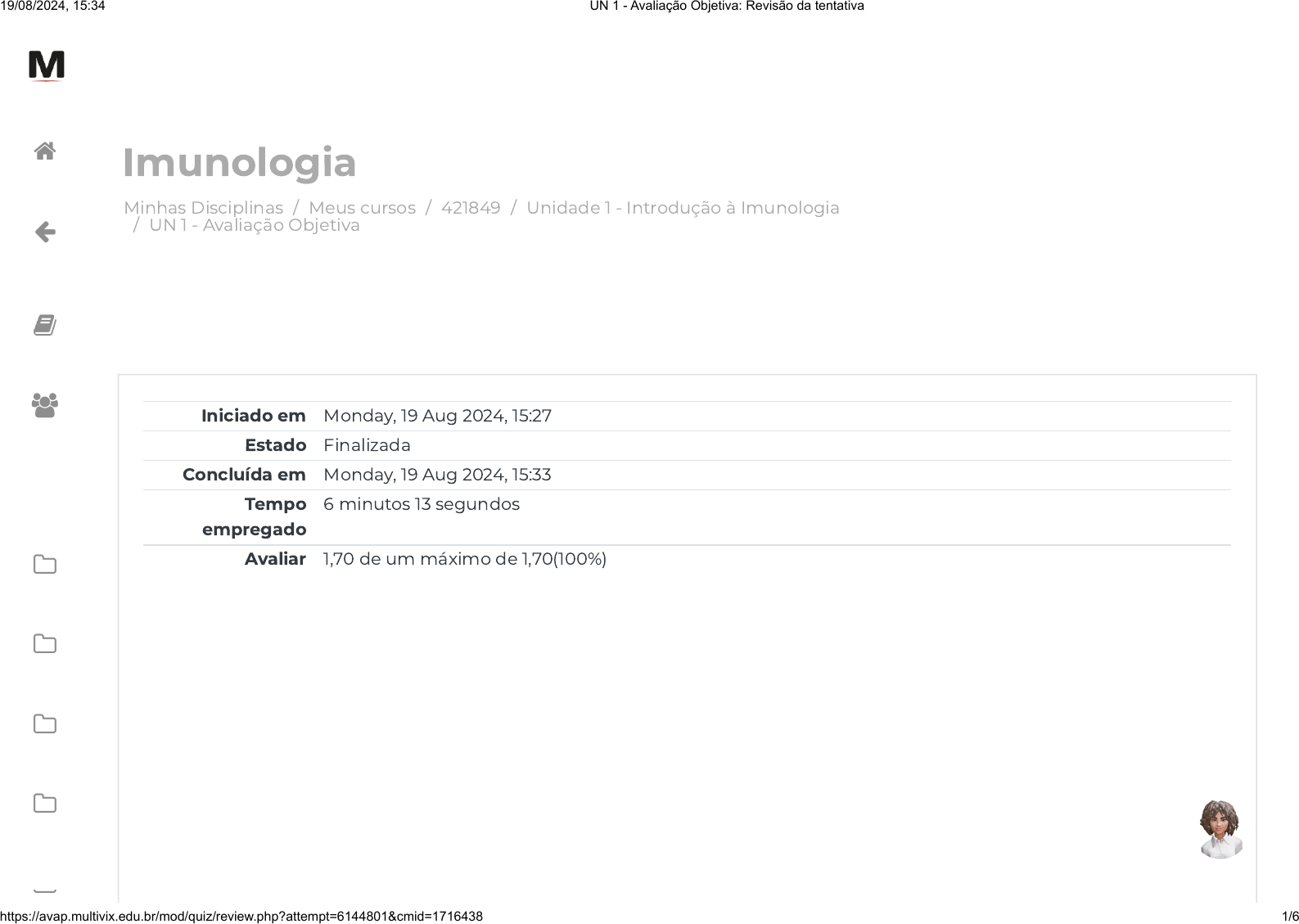 Minhas Disciplinas / Meus cursos / 421849 / Unidade 1 - Introdução à Imunologia / UN 1 - Avaliação Objetiva Imunologia Iniciado em Monday, 19 Aug 2024, 15:27 Estado Finalizada Concluída em Monday, 19 Aug 2024, 15:33 Tempo empregado 6 minutos 13 segundos Avaliar 1,70 de um máximo de 1,70(100%) 19/08/2024, 15:34 UN 1 - Avaliação Objetiva: Revisão da tentativa https://avap.multivix.edu.br/mod/quiz/review.php?attempt=6144801&cmid=1716438 1/6 https://avap.multivix.edu.br/my/ https://avap.multivix.edu.br/course/view.php?id=29397 https://avap.multivix.edu.br/course/view.php?id=29397§ion=2 https://avap.multivix.edu.br/mod/quiz/view.php?id=1716438 https://avap.multivix.edu.br/my/ https://avap.multivix.edu.br/course/view.php?id=29397 https://avap.multivix.edu.br/user/index.php?id=29397 https://avap.multivix.edu.br/course/view.php?id=29397§ion=1 https://avap.multivix.edu.br/course/view.php?id=29397§ion=2 https://avap.multivix.edu.br/course/view.php?id=29397§ion=3 https://avap.multivix.edu.br/course/view.php?id=29397§ion=4 https://avap.multivix.edu.br/course/view.php?id=29397§ion=5 https://avap.multivix.edu.br/ https://avap.multivix.edu.br/ https://avap.multivix.edu.br/ https://avap.multivix.edu.br/ https://avap.multivix.edu.br/ https://avap.multivix.edu.br/ https://avap.multivix.edu.br/ Questão 1 Correto Atingiu 0,34 de 0,34 A maturação celular é uma etapa importante no desenvolvimento de uma resposta efetiva. Onde os linfócitos T sofrem maturação? Escolha uma opção: Na medula óssea. Linfócitos T não sofrem maturação. No local da infecção. No coração. No timo. 19/08/2024, 15:34 UN 1 - Avaliação Objetiva: Revisão da tentativa https://avap.multivix.edu.br/mod/quiz/review.php?attempt=6144801&cmid=1716438 2/6 https://avap.multivix.edu.br/ https://avap.multivix.edu.br/ https://avap.multivix.edu.br/ https://avap.multivix.edu.br/ https://avap.multivix.edu.br/ https://avap.multivix.edu.br/ https://avap.multivix.edu.br/ Questão 2 Correto Atingiu 0,34 de 0,34 Julgue as a�rmações a seguir e assinale a alternativa correta: I – Pele e mucosas consistem em barreiras físicas da imunidade. II – As células NK fazem parte da imunidade adquirida. III – A vacinação é um exemplo de imunização passiva. Escolha uma opção: Apenas o item I está correto. Os itens I e II estão corretos. Nenhum item está correto. Os itens I e III estão corretos. Os itens II e III estão corretos. 19/08/2024, 15:34 UN 1 - Avaliação Objetiva: Revisão da tentativa https://avap.multivix.edu.br/mod/quiz/review.php?attempt=6144801&cmid=1716438 3/6 https://avap.multivix.edu.br/ https://avap.multivix.edu.br/ https://avap.multivix.edu.br/ https://avap.multivix.edu.br/ https://avap.multivix.edu.br/ https://avap.multivix.edu.br/ https://avap.multivix.edu.br/ Questão 3 Correto Atingiu 0,34 de 0,34 Julgue as a�rmações a seguir e assinale a alternativa correta: I – A imunidade inata é responsável por uma resposta mais especí�ca e individualizada. II – Os linfócitos T e B são elementos da imunidade adquirida. III – A resposta primária contra uma infecção é feita pela imunidade adquirida por meio de células NK, macrófagos e células dendríticas. IV – As vacinas geram uma imunidade de memória por meio da imunidade adquirida. Escolha uma opção: Os itens I, II e IV estão corretos. Os itens II, III e IV estão corretos. Os itens I e III estão corretos Os itens II e IV estão corretos. O item IV está correto. 19/08/2024, 15:34 UN 1 - Avaliação Objetiva: Revisão da tentativa https://avap.multivix.edu.br/mod/quiz/review.php?attempt=6144801&cmid=1716438 4/6 https://avap.multivix.edu.br/ https://avap.multivix.edu.br/ https://avap.multivix.edu.br/ https://avap.multivix.edu.br/ https://avap.multivix.edu.br/ https://avap.multivix.edu.br/ https://avap.multivix.edu.br/ Questão 4 Correto Atingiu 0,34 de 0,34 Relacione a primeira coluna com a segunda e assinale a alternativa que apresenta a sequência numérica correta: 1 – Não reatividade ao próprio ( ) Melhora a capacidade de o organismo combater infecções recorrentes. 2 – Memória ( ) Gera respostas individuais a cada microrganismo. 3 – Especialização ( ) Previne que o sistema imune gere danos a tecidos saudáveis. 4 – Expansão clonal ( ) Aumenta o número de linfócitos especí�cos frente a um antígeno. Escolha uma opção: 3, 2, 1, 4 2, 3, 4, 1 1, 3, 2, 4 4, 2, 1, 3 2, 3, 1, 4 19/08/2024, 15:34 UN 1 - Avaliação Objetiva: Revisão da tentativa https://avap.multivix.edu.br/mod/quiz/review.php?attempt=6144801&cmid=1716438 5/6 https://avap.multivix.edu.br/ https://avap.multivix.edu.br/ https://avap.multivix.edu.br/ https://avap.multivix.edu.br/ https://avap.multivix.edu.br/ https://avap.multivix.edu.br/ https://avap.multivix.edu.br/ Questão 5 Correto Atingiu 0,34 de 0,34 Nem todas as células do sistema imune conseguem produzir anticorpos. A célula especializada nessa produção é: Escolha uma opção: um fagócito. um antígeno. a célula T efetora. o linfócito B. o linfócito T. ◄ Conteúdo Online Seguir para... Conteúdo Online ► 19/08/2024, 15:34 UN 1 - Avaliação Objetiva: Revisão da tentativa https://avap.multivix.edu.br/mod/quiz/review.php?attempt=6144801&cmid=1716438 6/6 https://avap.multivix.edu.br/mod/scorm/view.php?id=1716437&forceview=1 https://avap.multivix.edu.br/mod/scorm/view.php?id=1716439&forceview=1 https://avap.multivix.edu.br/ https://avap.multivix.edu.br/ https://avap.multivix.edu.br/ https://avap.multivix.edu.br/ https://avap.multivix.edu.br/ https://avap.multivix.edu.br/ https://avap.multivix.edu.br/