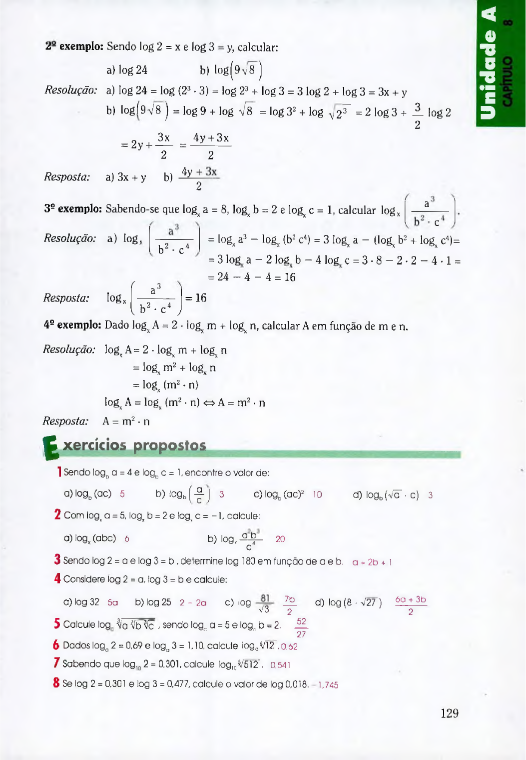 2- exemplo: Sendo log 2 = x e log 3 - y, calcular: a ) log24 b) log^9 v'8 ) Resolução: a) log 24 = log (23 • 3) = log 23 + log 3 = 3 log 2 + log 3 = 3x + y b) logÍ9V8 ) = log 9 + log V ã = log 32 + log V 2̂ - 2 log 3 + A log 2 2 „ 3x 4y + 3x - 2y + ----- = — ------- 2 2 Resposta: a) 3x + y b) ^ + 2 3Q exemplo: Sabendo-se que logx a = 8, logx b = 2 e logs c = 1, calcular logx Resolução: a) log* b2 c 4 = logx a3 - logx (b2 c4) = 3 Ioĝ a - (logx b2 + logx c4)= = 3 log a - 2 log b - 4 log c = 3 • 8 - 2 • 2 - 4 • 1 = a c Resposta: logx 49 exemplo: Dado / a 3 = 24 - 4 - 4 = 16 - 1 6 lb 2-c4 J logx A = 2 • logs m + logx n, calcular A em função de m e n. Resolução: log.( A = 2 logx m + logx n = logx m2 + logx n - logx (m2 • n) Iogx A - logx (m2 • n) <=> A = m2 n Resposta: A = m2 • n £xercícios propostos 1 Sendo logb a = 4 e logc c = 1, encontre o valor de: a)logb(ac) 5 b )!o gh [-g-j 3 c) logb(ac)2 10 d) logb (Vã- c) 3 2 Com log, a = 5, log, b = 2 e log, c = - 1, calcule: a) !ogx (abc) ó b) log, -S-Ç- 20 c 3 Sendo log 2 = a e log 3 = b , determine log 180 em função de a e b. a + 2 b + l 4 Considere log 2 = a, log 3 = b e calcule: a) log 32 5a b) log 25 2 - 2a c) log ZÜ1 d) log (8 V27~) 60 + 3b ___ V3 2 2 5 Calcule log ^ ¡ a % ^ c . sendo logr a = 5 e logr b = 2. I L 27 6 Dados logo 2 = 0,69 e loga 3 = 1,10, calcule loga VT2", 0,62 7 Sabendo que log,0 2 = 0,301, calcule Íogl0V512". 0.541 8 Se log 2 = 0,301 e log 3 = 0,477, calcule o valor de log 0,018. 1,745 129 U n id a d e A