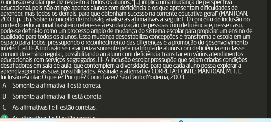 A inclusão escolar que diz respeito a todos os alunos, implica uma mudança de perspectiva educacional, pois não atinge apenas alunos com deficiência e os que apresentam dificuldades de aprender, mas todos os demais, para que obtenham sucesso na corrente educativa geral" (MANTOAN, 2003, 16). Sobre conceito de inclusão, analise as afirmativas a conceito de inclusão no contexto educacional brasileiro refere-se à escolarização de pessoas com deficiência e, nesse caso, pode-se defini-lo como um processo amplo de mudança do sistema escolar para propiciar um ensino de qualidade para todos os alunos. Essa mudança desestabiliza concepções e transforma a escola em um espaço para todos, pressupondo reconhecimento das diferenças e a promoção do desenvolvimento intelectual. II- A inclusão se caracteriza somente pela matrícula de alunos com deficiência em classe comum do ensino regular, possibilitando ao aluno com deficiência transitar em vários atendimentos educacionais com serviços segregados. III- A inclusão escolar pressupõe que sejam criadas condições desafiadoras em sala de aula, que contemplem a diversidade, para que cada aluno possa explorar a aprendizagem e as suas possibilidades. Assinale a alternativa CORRETA: FONTE: MANTOAN, M. T. E. Inclusão escolar: que é? Por quê? Como fazer? São Paulo: Moderna, 2003. A Somente a afirmativa II está correta. B Somente a afirmativa III está correta. As afirmativas I e estão corretas.