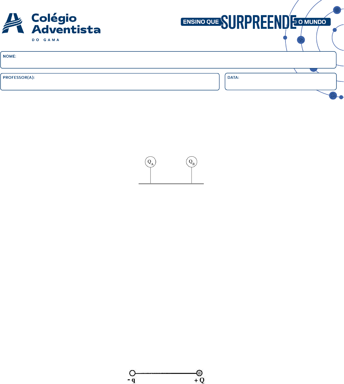 EXERCÍCIOS – CAMPO E POTENCIAL ELÉTRICO 01 - Duas cargas puntiformes negativas, QA e QB, estão fixadas a certa distância uma da outra. Em ambas, os vetores força elétrica e campo elétrico, exercidos mutuamente sobre cada carga, possuem, respectivamente, as características de a) repulsão e afastamento. b) atração e aproximação. c) atração e afastamento. d) repulsão e aproximação. e) repulsão e inexistente. 02 - (UERJ) Duas cargas pontuais -q e +Q estão dispostas como ilustra a figura. Se |Q| > |-q|, o campo elétrico produzido por essas cargas se anula em um ponto situado: a) à direita da carga positiva b) à esquerda da carga negativa c) entre as duas cargas e mais próximo da carga positiva d) entre as duas cargas e mais próximo da carga negativa 03 - (UFV MG) A figura abaixo representa a configuração de linhas de campo elétrico produzida por três cargas puntuais, todas com o mesmo módulo Q. Os sinais das cargas A, B e C são, respectivamente: ( A B C ) a) negativo, positivo e negativo. b) positivo, negativo e positivo. c) positivo, positivo e positivo. d) negativo, negativo e negativo. e) negativo, negativo e positivo. 04 - (UFLA MG) As esferas na figura abaixo estão suspensas por fios isolantes. A carga elétrica da esfera A é negativa. ( - - - - - - A - - - B )/////// /////// /////// P Supondo que as esferas não interajam entre si, as cargas elétricas da placa P e da esfera B são, respectivamente a) positiva e negativa. b) negativa e positiva. c) positiva e neutra. d) negativa e negativa. e) positiva e positiva. 05 - (UNIFOR CE) Considere cada um dos quatro pares de cargas elétricas, representados nos esquemas 1, 2, 3 e 4, distantes e independentes, um do outro. Em cada esquema, o campo elétrico gerado pelas duas cargas ao longo da reta que as une é nulo em um ponto. Esse ponto fica à esquerda das cargas nos esquemas a) I e II b) I e III c) I e IV d) II e III e) III e IV 06 - (UFMS) Seja um ponto tomado sobre a mediatriz do segmento que une as duas cargas elétricas puntiformes (Q) e (-Q) (vide figura abaixo). Sendo Q < 0, considere o vetor campo elétrico resultante, gerado pelas duas cargas no ponto citado. Assim, é correto afirmar que esse vetor a) é nulo. b) tem o sentido 1. c) tem o sentido 2. d) tem o sentido 3. e) tem o sentido 4. 07 - (FEEVALE RS) Uma carga elétrica puntiforme gera um campo elétrico de módulo 8x105 N/C em um ponto situado a 2 cm desta carga. O campo elétrico gerado por esta mesma carga em um ponto situado a 4 cm de distância desta carga será a) 16x105 N/C b) 8x105 N/C c) 4x105 N/C d) 2x105 N/C e) 1x105 N/C 08 - (FMTM MG) Duas placas planas, verticais e paralelas, encontram-se separadas a uma distância d uma da outra e estão submetidas a uma diferença de potencial constante. Um feixe de prótons penetra perpendicularmente à placa positiva, por meio de um orifício, no interior do campo elétrico formado por essas placas, com energia cinética E0. Desprezando-se as ações gravitacionais, a variação da energia cinética dos prótons, ao atravessarem as placas, está corretamente representada no diagrama a) b) c) d) e) 09 - (UNIRIO RJ) A figura abaixo mostra como estão distanciadas, entre si, duas cargas elétricas puntiformes, Q e 4Q, no vácuo. Pode-se afirmar que o módulo do campo elétrico (E) é NULO no ponto: ( ...... ) ( C A B D E )1.c.m. 1cm +Q +4Q a) A. b) B. c) C. d) D. e) E. 10 - (PUC RS) A figura abaixo representa um campo elétrico não uniforme, uma carga de prova q+ e cinco pontos quaisquer no interior do campo. O campo elétrico é mais intenso no ponto a) 1. b) 2. c) 3. d) 4. e) 5. 11 - (ESCS DF) Considere uma carga puntiforme positiva q fixa num ponto do espaço. Verifica-se que o campo elétrico em um ponto P1, a uma distância R dessa carga, tem módulo E1 = 1000 V/m. Verifica-se, também, que a diferença entre os valores dos potenciais eletrostáticos gerados por essa carga no ponto P1 e num ponto P2, situado a uma distância 2R da carga, é V1 – V2 = 225 V. A figura mostra a carga e os pontos P1 e P2. Considerando que 1 40 9,010 9 Nm2 C2 , a distância R e a carga q são dadas, respectivamente, por: a) R = 0,45 m e q = 2,25 x 1010 C b) R = 0,23 m e q = 1,13 x 1010 C c) R = 0,45 m e q = 2,25 x 108 C d) R = 0,23 m e q = 2,25 x 1010 C e) R = 0,45 m e q = 4,50 x 105 C 12 - (FAMECA SP) Uma carga puntiforme q = 4 C é abandonada do repouso no ponto A, dentro de um campo elétrico uniforme horizontal de intensidade 100 V/m. Devido à ação da força elétrica que a partícula recebe, ela é acelerada até atingir o ponto B, a 20 cm de A. No trajeto entre A e B, a partícula eletrizada sofreu uma redução de energia potencial elétrica, em joules, igual a a) 2 x 10–5. b) 4 x 10–5. c) 8 x 10–5. d) 5 x 10–4. e) 6 x 10–4. 13 - (UNIFOR CE) Suponha que uma nuvem possui carga elétrica de 40C e potencial elétrico de 6,0 106 V em relação ao solo. Se ocorresse uma descarga elétrica dos 40C entre a nuvem e a Terra, a energia liberada, em joules, seria igual a a) 2,4 108. b) 2,4 107. c) 1,5 106. d) 2,4 105. e) 1,5 103. 14 - (Mackenzie SP) Ao abandonarmos um corpúsculo, eletrizado positivamente com carga elétrica de 2,0 C, no ponto A de um campo elétrico, ele fica sujeito a uma força eletrostática que o leva para o ponto B, após realizar o trabalho de 6,0 mJ. A diferença de potencial elétrico entre os pontos A e B desse campo elétrico é: a) 1,5 Kv. b) 3,0 Kv. c) 4,5 Kv. d) 6,0 Kv. e) 7,5 Kv. 15 - (PUC MG) As configurações A, B e C, que representam quatro cargas de mesmo valor, situadas nos vértices de um quadrado, conforme a figura abaixo, A B C ( + )+ + + + + Escolha a opção que contenha a configuração ou configurações em que o potencial elétrico no centro do quadrado tenha o MENOR VALOR: a) A b) B c) C d) B e C e) A, B e C image6.png image7.png image8.png image9.png image10.png image11.png image12.png image13.png image14.png image15.png image16.png image17.png image