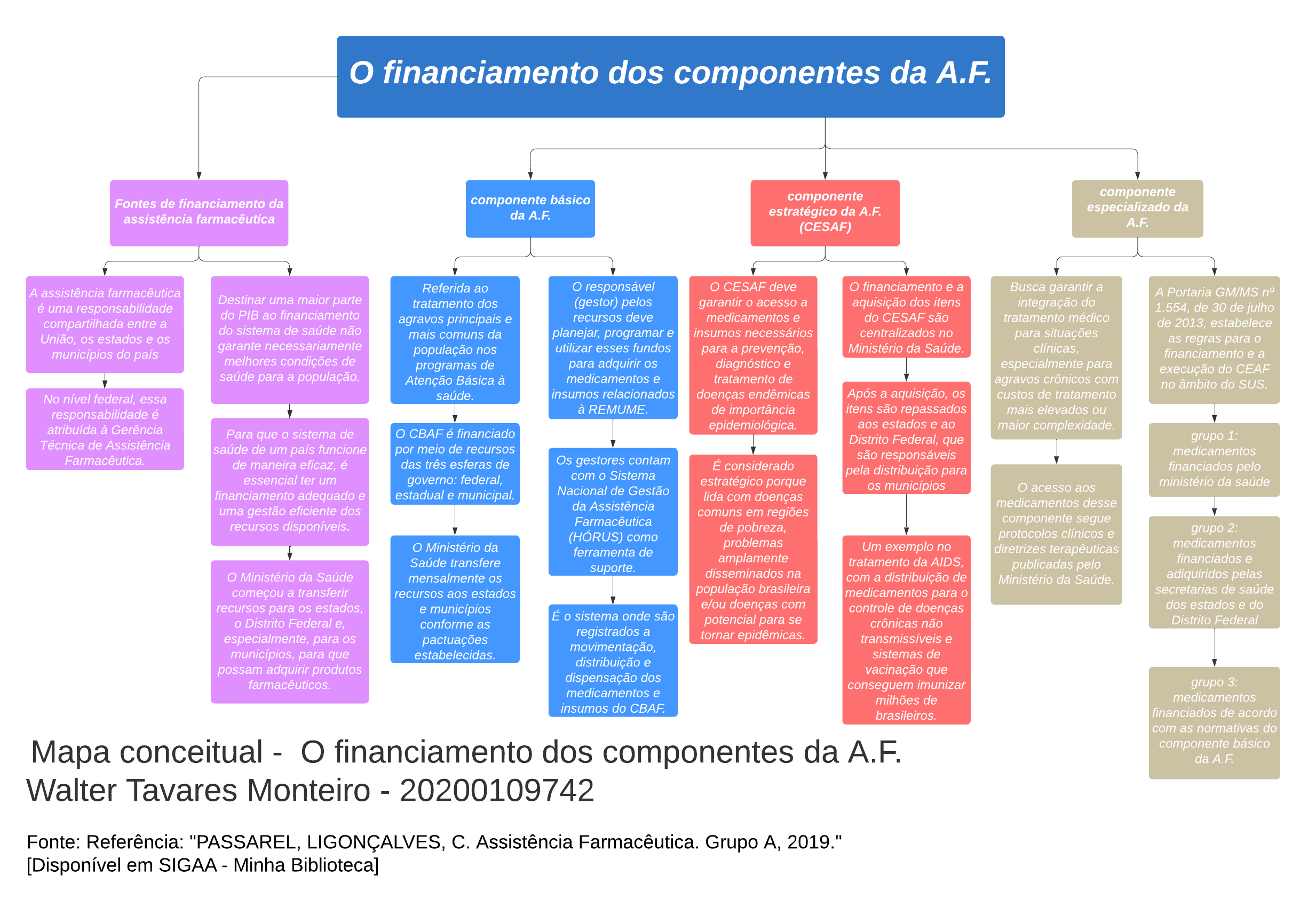 componente básico da A.F. O financiamento dos componentes da A.F. Fontes de financiamento da assistência farmacêutica A assistência farmacêutica é uma responsabilidade compartilhada entre a União, os estados e os municípios do país No nível federal, essa responsabilidade é atribuída à Gerência Técnica de Assistência Farmacêutica. Referida ao tratamento dos agravos principais e mais comuns da população nos programas de Atenção Básica à saúde. O CBAF é financiado por meio de recursos das três esferas de governo: federal, estadual e municipal. O Ministério da Saúde transfere mensalmente os recursos aos estados e municípios conforme as pactuações estabelecidas. componente estratégico da A.F. (CESAF) componente especializado da A.F. Mapa conceitual - O financiamento dos componentes da A.F. Walter Tavares Monteiro - 20200109742 Fonte: Referência: "PASSAREL, LIGONÇALVES, C. Assistência Farmacêutica. Grupo A, 2019." [Disponível em SIGAA - Minha Biblioteca] Destinar uma maior parte do PIB ao financiamento do sistema de saúde não garante necessariamente melhores condições de saúde para a população. Para que o sistema de saúde de um país funcione de maneira eficaz, é essencial ter um financiamento adequado e uma gestão eficiente dos recursos disponíveis. O Ministério da Saúde começou a transferir recursos para os estados, o Distrito Federal e, especialmente, para os municípios, para que possam adquirir produtos farmacêuticos. O responsável (gestor) pelos recursos deve planejar, programar e utilizar esses fundos para adquirir os medicamentos e insumos relacionados à REMUME. Os gestores contam com o Sistema Nacional de Gestão da Assistência Farmacêutica (HÓRUS) como ferramenta de suporte. É o sistema onde são registrados a movimentação, distribuição e dispensação dos medicamentos e insumos do CBAF. O financiamento e a aquisição dos itens do CESAF são centralizados no Ministério da Saúde. O CESAF deve garantir o acesso a medicamentos e insumos necessários para a prevenção, diagnóstico e tratamento de doenças endêmicas de importância epidemiológica. É considerado estratégico porque lida com doenças comuns em regiões de pobreza, problemas amplamente disseminados na população brasileira e/ou doenças com potencial para se tornar epidêmicas. Um exemplo no tratamento da AIDS, com a distribuição de medicamentos para o controle de doenças crônicas não transmissíveis e sistemas de vacinação que conseguem imunizar milhões de brasileiros. Após a aquisição, os itens são repassados aos estados e ao Distrito Federal, que são responsáveis pela distribuição para os municípios Busca garantir a integração do tratamento médico para situações clínicas, especialmente para agravos crônicos com custos de tratamento mais elevados ou maior complexidade. O acesso aos medicamentos desse componente segue protocolos clínicos e diretrizes terapêuticas publicadas pelo Ministério da Saúde. A Portaria GM/MS nº 1.554, de 30 de julho de 2013, estabelece as regras para o financiamento e a execução do CEAF no âmbito do SUS. grupo 1: medicamentos financiados pelo ministério da saúde grupo 2: medicamentos financiados e adiquiridos pelas secretarias de saúde dos estados e do Distrito Federal grupo 3: medicamentos financiados de acordo com as normativas do componente básico da A.F. Mapa conceitual - Planejamento estratégico Mapa conceitual