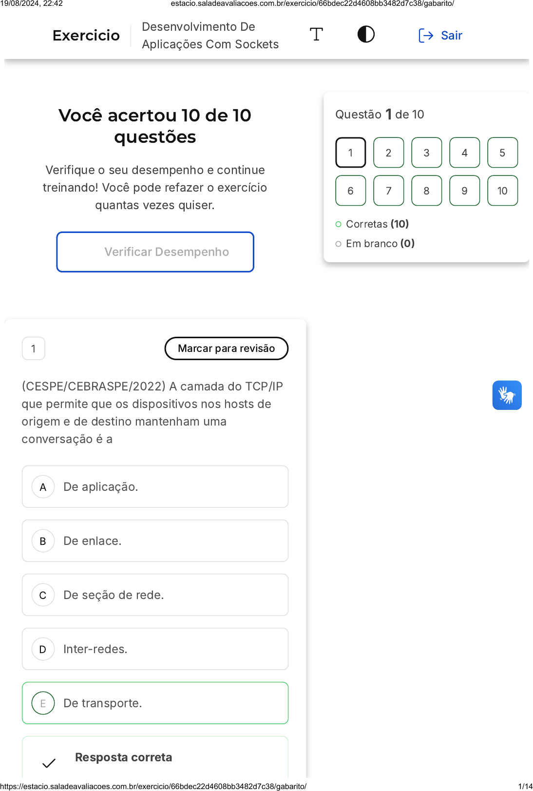 Você acertou 10 de 10 questões Verifique o seu desempenho e continue treinando! Você pode refazer o exercício quantas vezes quiser. Verificar Desempenho A B C D E 1 Marcar para revisão �CESPE/CEBRASPE/2022� A camada do TCP/IP que permite que os dispositivos nos hosts de origem e de destino mantenham uma conversação é a De aplicação. De enlace. De seção de rede. Inter-redes. De transporte. Resposta correta Questão 1 de 10 Corretas �10� Em branco �0� 1 2 3 4 5 6 7 8 9 10 Exercicio Desenvolvimento De Aplicações Com Sockets Sair 19/08/2024, 22:42 estacio.saladeavaliacoes.com.br/exercicio/66bdec22d4608bb3482d7c38/gabarito/ https://estacio.saladeavaliacoes.com.br/exercicio/66bdec22d4608bb3482d7c38/gabarito/ 1/14 A B C Parabéns, você selecionou a alternativa correta. Confira o gabarito comentado! Gabarito Comentado A camada de transporte do TCP/IP é a responsável por permitir que os dispositivos nos hosts de origem e de destino mantenham uma conversação. Isso ocorre porque essa camada é responsável por estabelecer, manter e encerrar conexões entre aplicações em hosts diferentes. Portanto, é nessa camada que ocorre a comunicação direta entre os dispositivos, permitindo a troca de informações de maneira eficiente e confiável. 2 Marcar para revisão Na programação TCP, é possível ao servidor saber o endereço do cliente ao qual um soquete conectado está vinculado, executando um método a qualquer momento. Dentre as opções a seguir, marque aquela que possui esse método. getaddr(). getclient(). getpeername(). 19/08/2024, 22:42 estacio.saladeavaliacoes.com.br/exercicio/66bdec22d4608bb3482d7c38/gabarito/ https://estacio.saladeavaliacoes.com.br/exercicio/66bdec22d4608bb3482d7c38/gabarito/ 2/14 D E getcliinfo(). servermethod(). Resposta correta Parabéns, você selecionou a alternativa correta. Confira o gabarito comentado! Gabarito Comentado O método socket.getpeername() é utilizado para retornar o endereço remoto ao qual o soquete está conectado. Este método é especialmente útil em situações onde é necessário descobrir o número da porta de um soquete IPv4/v6 remoto. Portanto, a alternativa correta é a "C", que menciona o método getpeername(). 3 Marcar para revisão Uma porta lógica é um ponto virtual onde começam e terminam as conexões de rede. As portas lógicas são baseadas em software e gerenciadas por um sistema operacional de computador. Cada porta lógica está associada a um processo ou serviço específico, permitindo que os computadores diferenciem facilmente entre diferentes tipos de tráfego, por exemplo: os e- mails vão para uma porta lógica diferente daquela das páginas web, mesmo que ambas cheguem a um computador por meio da mesma conexão com a internet. 19/08/2024, 22:42 estacio.saladeavaliacoes.com.br/exercicio/66bdec22d4608bb3482d7c38/gabarito/ https://estacio.saladeavaliacoes.com.br/exercicio/66bdec22d4608bb3482d7c38/gabarito/ 3/14 A B C D E Disponível em: https://www.cloudflare.com/pt- br/learning/network-layer/what-is-a-computer- port/. Acesso em: 02 dez. 2022. Dentre as opções a seguir, o número de porta que corresponde ao intervalo de portas gratuitas é: 490 9574 1 40122 50008 Resposta correta Parabéns, você selecionou a alternativa correta. Confira o gabarito comentado! Gabarito Comentado As portas lógicas são classificadas em três categorias: portas bem conhecidas, portas registradas e portas gratuitas. As portas bem conhecidas variam entre 0 e 1023, as portas registradas variam entre 1024 e 49151, e as portas gratuitas variam entre 49152 e 65535. Portanto, a alternativa correta é a alternativa E, que apresenta o 19/08/2024, 22:42 estacio.saladeavaliacoes.com.br/exercicio/66bdec22d4608bb3482d7c38/gabarito/ https://estacio.saladeavaliacoes.com.br/exercicio/66bdec22d4608bb3482d7c38/gabarito/ 4/14 A B C D E número 50008, pois este número está dentro do intervalo de portas gratuitas. 4 Marcar para revisão Um script escrito em Python pode ser criado e editado com um editor de texto, mas requer um interpretador Python para ser executado. Você pode abrir e editar scripts Python com qualquer editor de texto ou código-fonte. Os editores de código-fonte fornecem ferramentas úteis de realce de sintaxe e edição de código que facilitam a revisão e edição de scripts Python. Um arquivo que contém um script Python, tipicamente, possui a extensão: .c .phy .jar .py .xml Resposta correta Parabéns, você selecionou a alternativa correta. Confira o gabarito comentado! 19/08/2024, 22:42 estacio.saladeavaliacoes.com.br/exercicio/66bdec22d4608bb3482d7c38/gabarito/ https://estacio.saladeavaliacoes.com.br/exercicio/66bdec22d4608bb3482d7c38/gabarito/ 5/14 Gabarito Comentado Arquivos que contêm scripts Python geralmente têm a extensão .py. Esta extensão é usada para identificar o arquivo como um script Python, permitindo que o interpretador Python o execute corretamente. As outras opções listadas, como .c, .phy, .jar e .xml, são extensões de arquivo usadas para outros tipos de linguagens de programação ou formatos de arquivo, e não são típicas para scripts Python. 5 Marcar para revisão O Python já há algum tempo ganhou uma posição como uma das linguagens de programação mais populares do mundo. A aprendizagem de máquina, o design de site e o teste de software são, de fato, algumas das várias áreas de aplicação nas quais ele é usado. É excelente tanto para quem já trabalha com programação, quanto para quem programa esporadicamente. Disponível em: https://datamites.com/blog/why- is-python-an-interpreted-programming- language/. Acesso em: 16 nov. 2022. Adaptado. Dentre as opções a seguir, marque aquela na qual possui um recurso que faz parte do Python: 19/08/2024, 22:42 estacio.saladeavaliacoes.com.br/exercicio/66bdec22d4608bb3482d7c38/gabarito/ https://estacio.saladeavaliacoes.com.br/exercicio/66bdec22d4608bb3482d7c38/gabarito/ 6/14 A B C D E É uma linguagem de programaç