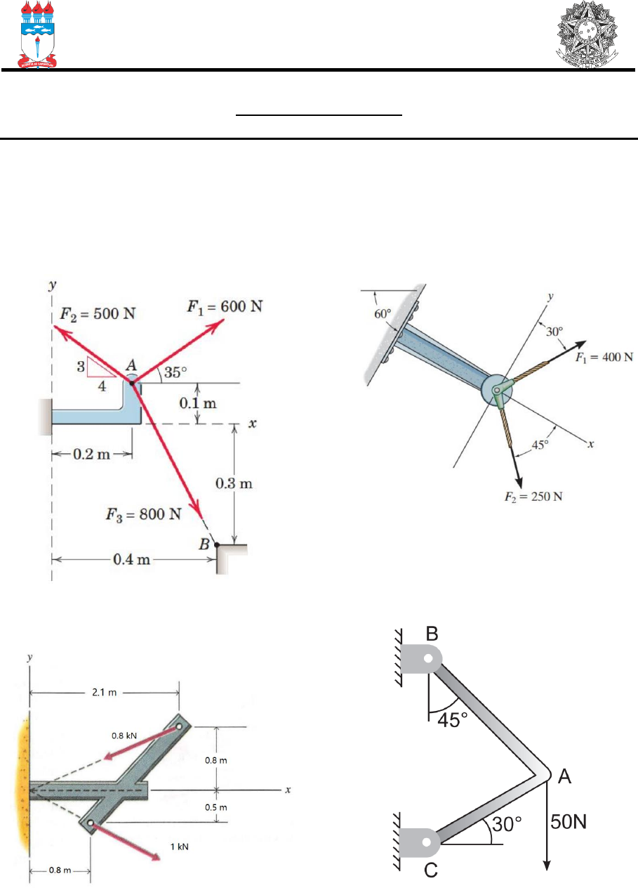 Centro de Tecnologia - UFAL EPET023 – Mecânica dos Solidos 1 1 Lista de exercícios Prof. Jonathan C. Teixeira Exercício 1.1 - Determine as componentes em relação aos eixos x e y das forças �⃗�1, �⃗�2 e �⃗�3. [Resposta: 𝐹1,𝑥 = 491 N, 𝐹1,𝑦 = 344 N, 𝐹2,𝑥 = −400 N, 𝐹2,𝑦 = 300 N, 𝐹3,𝑥 = 358 N, 𝐹3,𝑦 = −716 N] Exercício 1.2 - Determine o vetor resultante 𝑟 em coordenadas polares das duas forças ilustradas as seguir. [Resposta: 𝑟 = 821 ∡ − 83°] Exercício 1.3 - Determine a magnitude da força resultante e sua direção no sentido anti-horário, a partir do eixo x positivo. [Resposta: 𝑟= 413 N; 𝜃= 24.2°] Exercício 1.4 – Uma força vertival de 50 N atua sobre o ponto A, como ilustrado na figura abaixo. Determine a magnitude da duas componentes da força ao longo de AB e AC. [Resposta:𝑃𝐴𝐵 = 44.82 N; 𝑃𝐴𝐶 = 36.6 N] Centro de Tecnologia - UFAL EPET023 – Mecânica dos Solidos 1 2 Exercício 1.5 - Determine as componentes x, y e z das forças de (a) 750 N e (b) 900 N. [Resposta: (a) 390 N, 614 N, 181.8 N; (b) −130.1 N, 816 N, 357 N] Exercício 1.6 - Determine a magnitude e os ângulos diretores da força resultante. [Resposta: |𝑟| = 485.30 N; α = 104°, β =15.1°; γ = 83.3°] Exercício 1.7 - Determine os ângulos formados entre �⃗⃗� = {−160𝑖̂ + 40𝑗̂ + 60�̂�}N, na extremidade da haste, e (a) o eixo x positivo e (b) o plano (x, z). [Resposta: (a) θx =155.7°, (b) θxz = 13.17°] Exercício 1.8 - Se a força resultante dos dois rebocadores tiver de ser direcionada para o eixo x positivo, e 𝐹𝐵 tiver a mínima intensidade, determine as intensidades de 𝐹𝑅 e 𝐹𝐵 e o ângulo 𝜃. [Resposta: 𝜃 = 90° , 𝐹𝐵 = 1 kN, 𝐹𝑅 = 1,73 kN] Sharma-Engineering-mechanics-Ex.11 Exercício 1.9 - Uma viga de aço deve ser içada usando duas correntes, conforme mostrado na figura abaixo. Se a força resultante for de 1200 N na direção vertical ascendente, determine os módulos de 𝑃1 e 𝑃2 atuando em cada corrente e o ângulo θ de 𝑃2 de modo que o módulo de 𝑃2 seja mínimo. [Resposta: 𝑃1 = 1039.23 N, 𝑃2 = 600 N, 𝜃 = 60°] Hibbeler, 2.77 Exercício 1.10 - Os cabos conectados ao olhal estão sujeitos às três forças mostradas na figura. Expresse cada força na forma de vetor cartesiano e determine a intensidade e os ângulos diretores coordenados da força resultante. [Resposta: 𝐹1 = {225j + 268k}N, F2 = {70,7i + 50,0j − 50,0k}N, F3 = {125i − 177j + 125k}N, FR = 407 N θ𝑥 = 61,3° θy = 76° θz = 32,5°] Centro de Tecnologia - UFAL EPET023 – Mecânica dos Solidos 1 3 Exercício 1.11 - Dois cabos são usados para segurar a lança do gancho na posição e sustentar a carga de 1500 N. Se a força resultante é direcionada ao longo da lança de A para O, determine os valores de x e z para as coordenadas do ponto C e a intensidade da força resultante. Considere 𝐹𝐵 = 1610 N e 𝐹𝐶 = 2400 N. [Resposta: 𝑥 = 1,248 𝑚, 𝑧 = 2,197 𝑚, 𝐹𝑅 = 3591,85 𝑁] Exercício 1.12 - Determine a magnitude das componentes do vetor F atuando ao longo e perpendicular à linha AO. [Resposta: 𝜃 = 33,2°; 𝐹𝐴𝑂 = 46,9𝑘𝑁; 𝐹⊥,𝐴𝑂 = 30,7𝑘𝑁] Exercício 1.13 - Determine as intensidades das componentes de F = 600 N que atuam ao longo e perpendicularmente ao segmento DE do encanamento. [Resposta: 𝐹∥,𝐸𝐷 = 334𝑁; 𝐹⊥,𝐸𝐷 = 498𝑁] Exercício 1.14 - Três forças são aplicadas com cabos ao bloco de ancoragem mostrado na Figura abaixo. Determine: (a) O módulo e os cosenos diretores da resultante, 𝐹𝑅, das três forças. (b) O módulo da componente da força 𝐹1 ao longo da linha de ação da força 𝐹2. (c) O ângulo a entre as forças 𝐹1 e 𝐹3. [Resposta: (a) 𝐹𝑅 = 1158.80𝑁; cos(𝜃𝑥) = 0,7067; cos(𝜃𝑦) = −0,2837; cos(𝜃𝑧) = 0,6481; (b) 50,9N (c) 𝛼 = 64,3°] Exercício 1.15 - A junção abaixo está sujeita a forças de quatro membros. O membro OA está localizado no plano xy e o membro OB, no plano yz. Determine as forças requeridas para o equilíbrio estático da junção. [Resposta: : 𝐹1 = 0; 𝐹2 = 311 N; 𝐹3 = 328 N] Exercício 1.16 - Determine o máximo peso do motor que pode ser suportado sem que exceda a tração de 450 N na corrente AB e 480 N na corrente AC. [Resposta: : 𝑃 = 240 N] Centro de Tecnologia - UFAL EPET023 – Mecânica dos Solidos 1 4 Exercício 1.17 - Cada corda pode admitir uma tração máxima de 500 N. Determine a maior massa do tubo que pode ser suportada. [Resposta: : 𝑚 = 26, kg] Exercício 1.18 - Determinar a força em cada cabo de forma que uma máquina de 8 toneladas seja mantida suspensa.. [Resposta: : 𝐹𝐴𝐵 = 𝐹𝐴𝐶 = 16,6𝑘𝑁, 𝐹𝐴𝐷 = 55,2𝑘𝑁] Exercício 1.19 – Calcular a tensão em cada cabo de forma que o sistema suporte um bloco de 100kg (ADOTAR aceleração da gravidade de 9,81 m/s²) em equilíbrio. [Resposta: : 𝐹𝐴𝐵 = 𝐹𝐴𝐶 = 1,96𝑘𝑁, 𝐹𝐴𝐷 = 2,94𝑘𝑁] Exercício 1.20 - Dado o sistema de suspensão de rede de pesca, calcular as forças compressivas nas barras AB e CB e a força de tração no cabo BD, considerando que a rede pesa 200 kg (ADOTAR aceleração da gravidade de 9,81 m/s²) em equilíbrio. [Resposta: : 𝐹𝐴𝐵 = 𝐹𝐶𝐵 = 2,52𝑘𝑁; 𝐹𝐵𝐷 = 3,64𝑘𝑁] Exercício 1.21 - Determine o alongamento em cada mola para o equilíbrio da bloco de 2kg. As molas são mostradas na posição de equilíbrio.. [Resposta: : 𝑥𝐴𝐷 = 0,4905 𝑚, 𝑥𝐴𝐶 = 0,793 𝑚, 𝑥𝐴𝐷 = 0,467 𝑚 ] Exercício 1.22 - Determine a magnitude dso momento resultante produzido pelas forças em relação ao ponto O.. [Resposta: : ↺ +(𝑀𝑅)𝑂 = 1254 𝑁 ⋅ 𝑚] Centro de Tecnologia - UFAL EPET023 – Mecânica dos Solidos 1 5 Exercício 1.23 - Determine o momento produzido pela força em relação ao pont