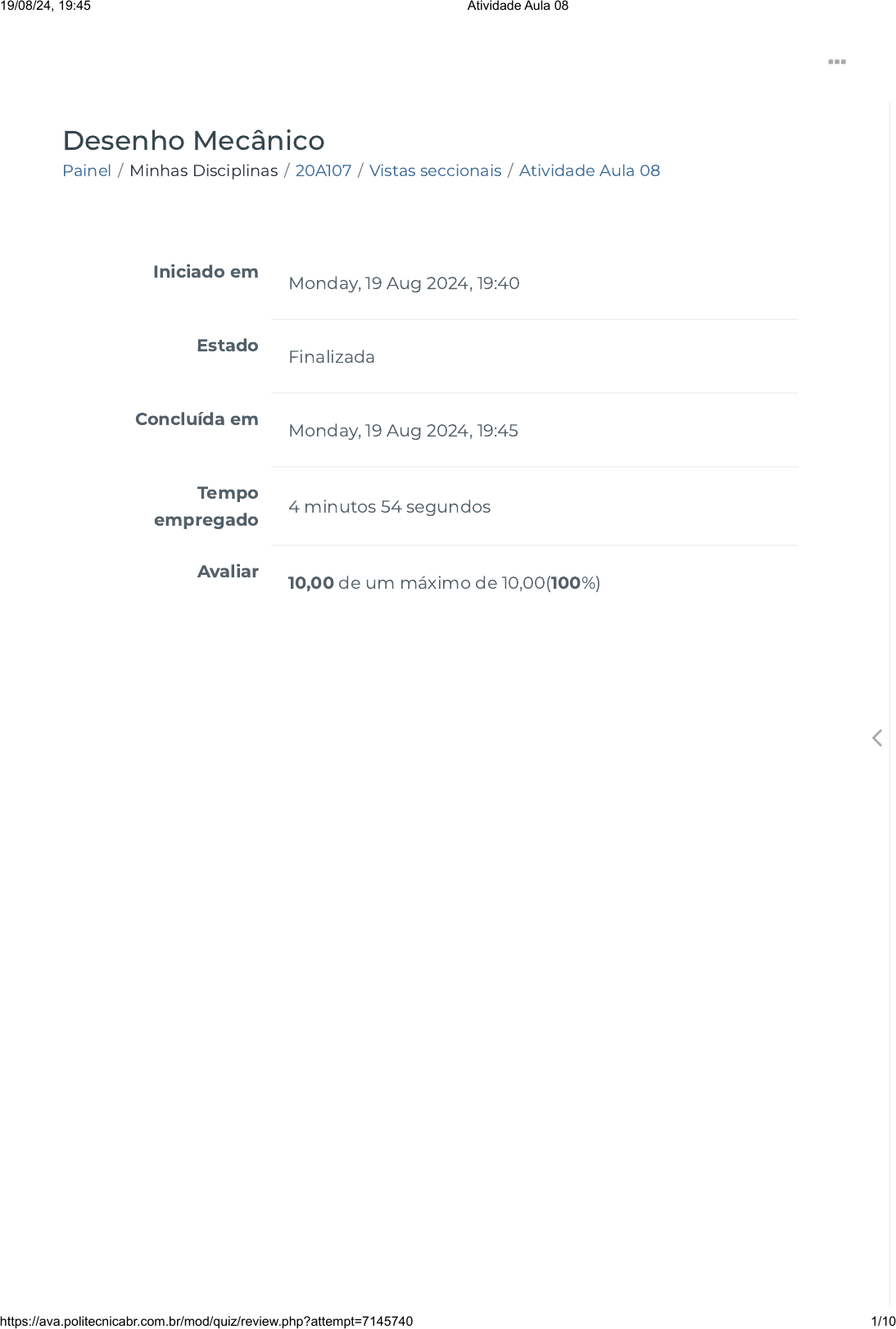 Painel / Minhas Disciplinas / 20A107 / Vistas seccionais / Atividade Aula 08 Desenho Mecânico Iniciado em Monday, 19 Aug 2024, 19:40 Estado Finalizada Concluída em Monday, 19 Aug 2024, 19:45 Tempo empregado 4 minutos 54 segundos Avaliar 10,00 de um máximo de 10,00(100%) 19/08/24, 19:45 Atividade Aula 08 https://ava.politecnicabr.com.br/mod/quiz/review.php?attempt=7145740 1/10 https://ava.politecnicabr.com.br/my/ https://ava.politecnicabr.com.br/my/ https://ava.politecnicabr.com.br/course/view.php?id=942 https://ava.politecnicabr.com.br/course/view.php?id=942#section-9 https://ava.politecnicabr.com.br/mod/quiz/view.php?id=26305 https://ava.politecnicabr.com.br/ Questão 1 Correto Atingiu 1,00 de 1,00 As vistas seccionais objetivam basicamente detalhar as partes ocas das peças, mostrar o tipo de material e facilitar a cotagem. Uma vista seccional deve cortar o maior número de partes ocas possíveis. Dentre as alternativas a seguir, qual está correta em relação às vistas seccionais? Escolha uma opção: a. Cada peça deverá indicar quais serão as vistas seccionais. b. Uma vista seccional deve cortar o maior número de partes maciças possíveis. c. As vistas seccionais são divididas em corte e hachuras. d. As vistas seccionais são divididas em corte e seção. e. As vistas seccionais compreendem unicamente as projeções axonométricas. 19/08/24, 19:45 Atividade Aula 08 https://ava.politecnicabr.com.br/mod/quiz/review.php?attempt=7145740 2/10 https://ava.politecnicabr.com.br/ Questão 2 Correto Atingiu 1,00 de 1,00 Eixos isométricos: corresponde à �gura geométrica formada por duas semirretas de mesma origem. A medida do ângulo é dada pela abertura entre seus lados. Escolha uma opção: Questão 3 Correto Atingiu 1,00 de 1,00 A projeção sobre o plano vertical chama-se de vista de frente, projeção vertical ou elevação. Escolha uma opção: Verdadeiro Falso Verdadeiro Falso 19/08/24, 19:45 Atividade Aula 08 https://ava.politecnicabr.com.br/mod/quiz/review.php?attempt=7145740 3/10 https://ava.politecnicabr.com.br/ Questão 4 Correto Atingiu 1,00 de 1,00 Dá-se o nome de ___________ ao conjunto de instruções ou indicações para orientar o corte de um material do qual se pretenda tirar peças. Esse(a) __________ contém instruções práticas e precisas para ganho de tempo com o mínimo de erro no momento do corte. Qual das alternativas a seguir preenche as lacunas de forma correta? Escolha uma opção: a. Plano de corte. b. Dimensões espaciais. c. Projeção ortogonal. d. Vista frontal. e. Perspectiva isométrica. 19/08/24, 19:45 Atividade Aula 08 https://ava.politecnicabr.com.br/mod/quiz/review.php?attempt=7145740 4/10 https://ava.politecnicabr.com.br/ Questão 5 Correto Atingiu 0,50 de 0,50 Podemos a�rmar que a perspectiva isométrica é a mais utilizada dentro das projeções axonométricas, fato explicado principalmente devido à perspectiva isométrica na sua forma simpli�cada, o desenho isométrico ou isometria simpli�cada, que não necessita de coe�cientes de redução. Escolha uma opção: Verdadeiro Falso 19/08/24, 19:45 Atividade Aula 08 https://ava.politecnicabr.com.br/mod/quiz/review.php?attempt=7145740 5/10 https://ava.politecnicabr.com.br/ Questão 6 Correto Atingiu 1,00 de 1,00 Você, como técnico mecânico, recebeu um desenho técnico com uma hachura. Baseado na �gura, pode-se dizer que a hachura representa qual tipo de material? Escolha uma opção: a. Madeira. b. Cerâmica. c. Aço inox. d. Concreto. e. Terra. 19/08/24, 19:45 Atividade Aula 08 https://ava.politecnicabr.com.br/mod/quiz/review.php?attempt=7145740 6/10 https://ava.politecnicabr.com.br/ Questão 7 Correto Atingiu 1,00 de 1,00 Entre as alternativas a seguir, qual está correta em relação às hachuras em desenhos técnicos? Escolha uma opção: a. No caso de peças muito �nas, em vez de hachurar, deve-se enegrecer a seção. b. Para áreas muito grandes, é fundamental hachurar toda a área a �m de não haver erros. c. As hachuras não permitem a inclusão de textos em seu interior. d. O espaçamento de todas as hachuras é sempre igual, indiferentemente do material a ser representado. e. Elas indicam necessariamente as partes ocas das peças. 19/08/24, 19:45 Atividade Aula 08 https://ava.politecnicabr.com.br/mod/quiz/review.php?attempt=7145740 7/10 https://ava.politecnicabr.com.br/ Questão 8 Correto Atingiu 1,00 de 1,00 O corte é um recurso utilizado para a análise e representação da estrutura interna de um objeto e seu funcionamento. Quando um corte atravessa a peça em toda sua extensão, como ele é denominado? Escolha uma opção: Questão 9 Correto Atingiu 0,50 de 0,50 As vistas seccionais objetivam basicamente detalhar as partes ocas das peças, mostrando o tipo de material, e facilitar a cotagem. Uma vista seccional deve cortar o menor número de partes ocas possíveis. Escolha uma opção: a. Corte parcial. b. Corte em desvio. c. Seção. d. Corte total. e. Meio corte. Verdadeiro Falso 19/08/24, 19:45 Atividade Aula 08 https://ava.politecnicabr.com.br/mod/quiz/review.php?attempt=7145740 8/10 https://ava.politecnicabr.com.br/ Questão 10 Correto Atingiu 1,00 de 1,00 Em relação aos tipos de cortes, estes podem ser: corte total, cortes compostos, meio corte e corte parcial. Escolha uma opção: Questão 11 Correto Atingiu 1,00 de 1,00 Angulo: é cada uma das semirretas é um eixo isométrico. Os eixos isométricos podem ser representados em posições variadas, mas sempre formando, entre si, ângulos de 120°. Escolha uma opção: Verdadeiro Falso Verdadeiro Falso Entre em Contato Links Úteis 19/08/24, 19:45 Atividade Aula 08 https://ava.politecnicabr.com.br/mod/quiz/review.php?attempt=7145740 9/10 https://ava.politecnicabr.com.br/ © 2022 - Escola Politécnica Brasileira https://www.politecnicabr.com.br 0800 084 2627 0800 084 2627 Dicas da nossa Diretora Acadêmica Planner de Estudos Declaração de Matrícula Orientações do AVA Abertura de Ticket Fale c