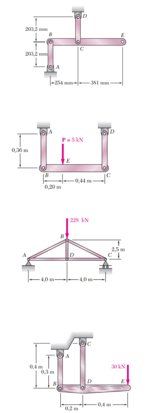 1) Cada uma das hastes AB e CD é feita de aço (200 GPa) e seção transversal retangular e uniforme de 6,35 25,4 mm. Determine a maior carga que pode ser suportada pelo ponto E se seu deslocamento não pode exceder 0,254 mm. 2) Cada uma das barras AB e CD é feita de alumínio (E 75 GPa) e tem uma seção transversal com área de 125mm2. Sabendo que elas suportam a barra rígida BC, determine o deslocamento do ponto E. 3) Para a treliça de aço (E 200 GPa) e o carregamento mostrado, determine as deformações dos componentes AB e AD, sabendo que suas áreas de seção transversal são, respectivamente, 2400 mm2 e 1800 mm2 . 4) A barra rígida BDE é suspensa por duas barras AB e CD. A barra AB é de alumínio (E 70 GPa) e tem uma seção transversal com área de 500 mm2; a barra CD é de aço (E 200 GPa) e tem uma seção transversal com área de 600 mm2. Para a força de 30 kN mostrada na fi gura, determine os deslocamentos dos pontos (a) B, (b) D e (c) E.