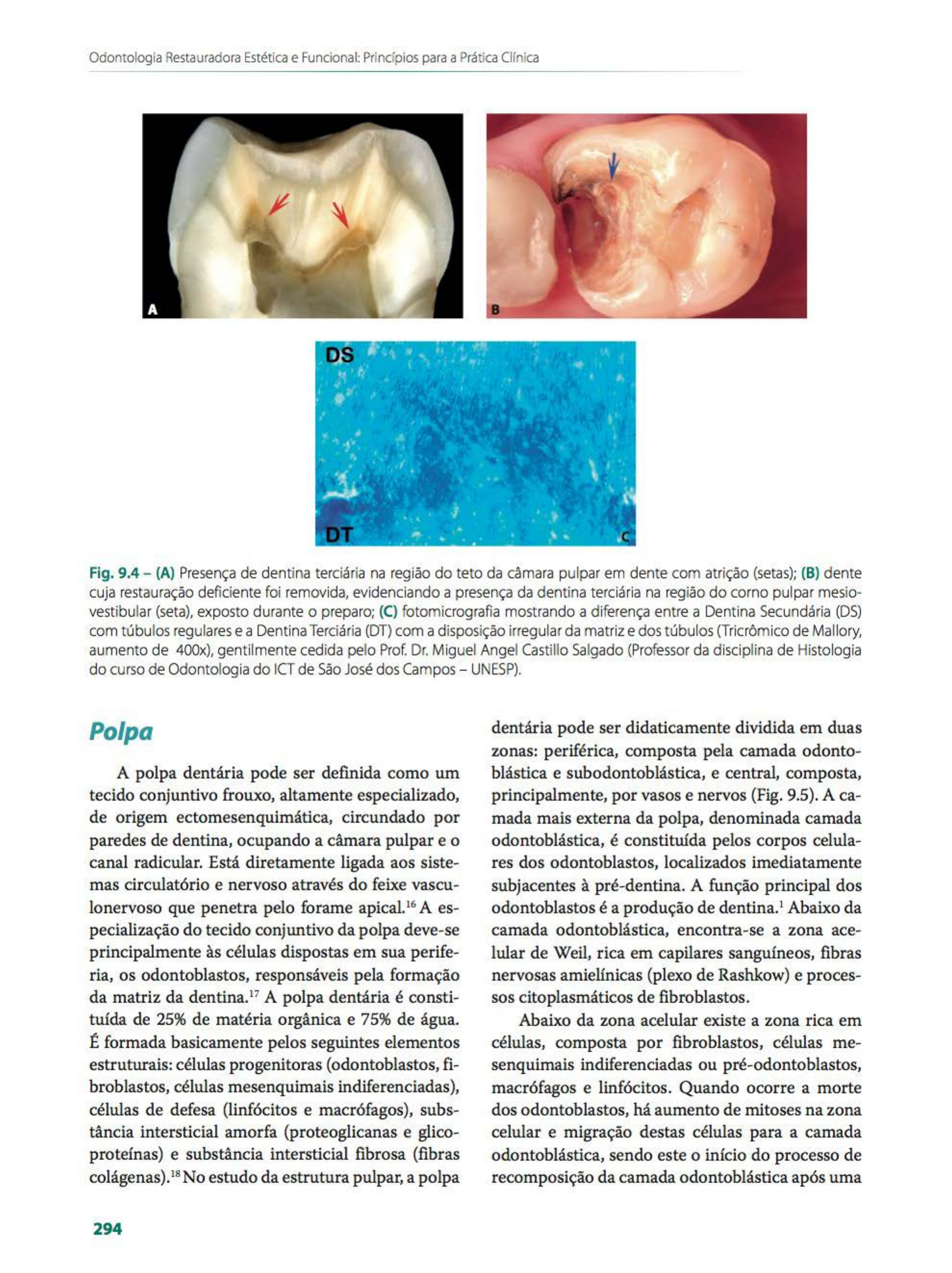 Odontologia Restauradora Estética e Funcional: Princípios para a Prática Clínica • Fig. 9.4 - (A) Presença de dentina terciária na região do teto da câmara pulpar em dente com atrição (setas); (B) dente cuja restauração deficiente foi removida, evidenciando a presença da dentina terciária na reg ião do corno pulpar mesio vestibular (seta), exposto durante o preparo; (C) fotomicrografia mostrando a diferença entre a Dentina Secundária (DS) com túbulos regulares e a Dentina Terciária (DT) com a disposição irregular da matriz e dos túbulos (Tricrómico de Mallory, aumento de 400x), gentilmente cedida pelo Prof. Dr. Miguel Angel Castillo Salgado (Professor da disciplina de Histologia do curso de Odontologia do ICT de São José dos Campos - UNESP). Polpa A polpa dentária pode ser definida como um tecido conjuntivo frouxo, altamente especializado, de origem ectomesenquimática, circundado por paredes de dentina, ocupando a câmara pulpar e o canal radicular. Está diretamente ligada aos siste mas circulatório e nervoso através do feixe vascu lonervoso que penetra pelo forame apicaL 16 A es pecialização do tecido conjuntivo da polpa deve-se principalmente às células dispostas em sua perife ria, os odontoblastos, responsáveis pela formação da matriz da dentina.17 A polpa dentária é consti tuída de 25% de matéria orgânica e 75% de água. É formada basicamente pelos seguintes elementos estruturais: células progenitoras (odontoblastos, fi broblastos, células mesenquimais indiferenciadas), células de defesa (linfócitos e macrófagos), subs tância intersticial amorfa (proteoglicanas e glico proteínas) e substância intersticial fibrosa (fibras colágenas).18 No estudo da estrutura pulpar, a polpa 294 dentária pode ser didaticamente dividida em duas zonas: periférica, composta pela camada odonto blástica e subodontoblástica, e central, composta, principalmente, por vasos e nervos (Fig. 9.5). A ca mada mais externa da polpa, denominada camada odontoblástica, é constituída pelos corpos celula res dos odontoblastos, localizados imediatamente subjacentes à pré-dentina. A função principal dos odontoblastos é a produção de dentina.1 Abaixo da camada odontoblástica, encontra-se a zona ace lular de Weil, rica em capilares sanguíneos, fibras nervosas amielínicas (plexo de Rashkow) e proces sos citoplasmáticos de fibroblastos. Abaixo da zona acelular existe a zona rica em células, composta por fibroblastos, células me senquirnais indiferenciadas ou pré-odontoblastos, macrófagos e linfócitos. Quando ocorre a morte dos odontoblastos, há aumento de mitoses na zona celular e migração destas células para a camada odontoblástica, sendo este o início do processo de recomposição da camada odontoblástica após uma Fig. 9.5 - Fotomicrografia do complexo dentina-polpa mostrando a camada de odontoblastos (CO), zona acelular de Weill (ZA), zona rica em células (ZC) e região central da polpa (RC). Tricómico de Mallory, 200x. Fotografia gentil mente cedida pelo Prof. Dr. Miguel Angel Castillo Salgado (Professor da disciplina de Histologia do curso de Odonto logia do ICT de São José dos Campos - UNESP). injúria pulpar. 3 Este processo é possível devido à capacidade das células mesenquimais de se dife renciarem em células similares aos odontoblastos e, consequentemente, reativarem a capacidade re paradora da polpa na região lesada. 4 Os vasos san guíneos mais calibrosos e nervos circundados por tecido conjuntivo rico em fibroblastos e células mesenquirnais indiferenciadas constituem a por ção central da polpa dentária. As arteríolas e vênulas que entram e saem da cavidade pulpar, através dos forames e das ramifi cações apicais, constituem o rico suprimento vas cular da polpa dentária. Acompanhando o trajeto dos vasos sanguíneos, encontra-se um suprimento nervoso abundante, originário do nervo trigêmeo. As fibras nervosas que penetram na polpa são mie línicas e mediadoras da sensação de dor causada por agentes externos, enquanto as fibras amielíni cas estão associadas aos vasos sanguíneos tendo, entre outras funções, o controle vasomotor. Estas fibras agrupam-se basicamente em dois tipos, de acordo com localização, função, diâmetro e veloci dade de condução do estímulo nervoso: fibras Del ta A e fibras C. Na zona periférica, encontram-se as fibras Delta A, rnielínicas, termorreceptoras para o frio, de rápida velocidade na condução do estímu- 9 Proteção do Complexo Dentina-Polpa lo nervoso e não relacionadas ao dano tecidual. Na zona central, próximo aos vasos sanguíneos, estão as fibras C, amielínicas, termorreceptoras para o calor, de lenta velocidade na condução do estímulo nervoso e relacionadas ao dano tecidual (processo inflamatório). A polpa dentária possui quatro funções bási cas: formativa, nutritiva, sensorial e defensiva. 19 A função formativa relaciona-se à formação de dentina durante toda a vida do dente. É, sem dú vida, a sua principal função. A Ju.nção nutritiva é observada a partir de sua rica vascularização, na entrada de nutrientes e oxigênio pelos vasos e saída de restos metabólicos teciduais. Afu.nção sensorial é caracterizada pela capacidade da pol pa de responder com dor aos diferentes agentes agressores, por meio das fibras nervosas mielíni cas e amielínicas. Afu.nção defensiva pode ser ob servada quando a polpa se defende dos estímulos agressores com formação de esclerose dentinária ou de dentina terciária.18 A polpa dentária sofre alterações com a idade, em função do processo fisiológico de envelheci mento. Estas alterações incluem a modificação de um tecido jovem (rico em células e pobre em fi bras) para um tecido senil (pobre em células e rico em fibras), ou seja, mudança de tecido conjuntivo frouxo para tecido conjuntivo denso. Essas alte rações são importantes do ponto de vista clínico, porque a capacidade de defesa