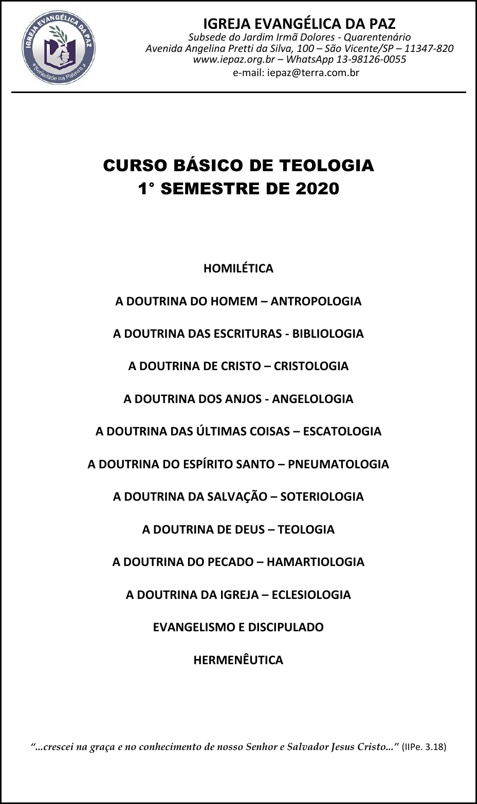 IGREJA EVANGÉLICA DA PAZ Subsede do Jardim Irmã Dolores - Quarentenário Avenida Angelina Pretti da Silva, 100 – São Vicente/SP – 11347-820 www.iepaz.org.br – WhatsApp 13-98126-0055 e-mail: iepaz@terra.com.br CURSO BÁSICO DE TEOLOGIA 1° SEMESTRE DE 2020 HOMILÉTICA A DOUTRINA DO HOMEM – ANTROPOLOGIA A DOUTRINA DAS ESCRITURAS - BIBLIOLOGIA A DOUTRINA DE CRISTO – CRISTOLOGIA A DOUTRINA DOS ANJOS - ANGELOLOGIA A DOUTRINA DAS ÚLTIMAS COISAS – ESCATOLOGIA A DOUTRINA DO ESPÍRITO SANTO – PNEUMATOLOGIA A DOUTRINA DA SALVAÇÃO – SOTERIOLOGIA A DOUTRINA DE DEUS – TEOLOGIA A DOUTRINA DO PECADO – HAMARTIOLOGIA A DOUTRINA DA IGREJA – ECLESIOLOGIA EVANGELISMO E DISCIPULADO HERMENÊUTICA “...crescei na graça e no conhecimento de nosso Senhor e Salvador Jesus Cristo...” (IIPe. 3.18) http://www.iepaz.org.br/ Prof.: Pr. Kenneth Eagleton 2 CURSO BÁSICO DE TEOLOGIA I N D I C E HOMILÉTICA .............................................................................................................. 3 A DOUTRINA DO HOMEM – ANTROPOLOGIA .......................................................... 23 A DOUTRINA DAS ESCRITURAS – BIBLIOLOGIA ........................................................ 31 A DOUTRINA DE CRISTO – CRISTOLOGIA .................................................................. 41 A DOUTRINA DOS ANJOS – ANGELOLOGIA .............................................................. 50 A DOUTRINA DAS ÚLTIMAS COISAS – ESCATOLOGIA ............................................... 57 A DOUTRINA DO ESPÍRITO SANTO – PNEUMATOLOGIA .......................................... 62 A DOUTRINA DA SALVAÇÃO – SOTERIOLOGIA ......................................................... 70 A DOUTRINA DE DEUS – TEOLOGIA .......................................................................... 77 A DOUTRINA DO PECADO – HAMARTIOLOGIA ......................................................... 86 A DOUTRINA DA IGREJA – ECLESIOLOGIA ................................................................ 93 EVANGELISMO E DISCIPULADO ................................................................................ 100 HERMENÊUTICA ........................................................................................................ 105 3 HOMILÉTICA Prof. Pr. Nathanael Rinaldi Filho INTRODUÇÃO Jesus disse: “Ide por todo mundo, pregai o evangelho a toda criatura” (Mc 16.15). Esta foi uma das principais tarefas deixadas pelo Senhor à sua Igreja. Somos chamados a proclamar ao mundo a salvação de Deus. De certo modo, podemos fazer isso de forma natural, sem ter necessidade de ser auxiliado por qualquer tipo de conhecimento técnico. Todavia, quando se trata de um discurso público, em que estaremos entregando a mensagem de Deus a uma audiência específica, cabe-nos fazê-lo da maneira mais eficaz possível, visando fixar nos nossos ouvintes a referida mensagem. Para isso, utilizamos a HOMILÉTICA, ou a arte de fazer homilia. Toda ação a ser realizada pode ser feita de diversas maneiras. Algumas são totalmente erradas; outras, ainda que não completamente, contêm elementos que não são aprováveis ou louváveis. Dentre as maneiras corretas existem muitas, e nosso compromisso é buscar maneiras cada vez mais eficazes. Ao expor uma palavra em uma reunião pública, podemos fazer isso de muitas maneiras diferentes. Se buscamos, porém, a eficácia, não nos contentaremos com formas confusas, vazias e ambíguas de apresentar nosso sermão. Queremos que as pessoas tenham a sua atenção presa. Queremos que elas de fato se interessem por aquilo que está sendo dito. Por isso, não só o que dizemos, mas a forma como dizemos, é importante. Não precisamos de muito esforço para saber que a clareza é melhor que a imprecisão, que algo dito de modo criativo é melhor do que algo dito de modo banal. A estética não é o principal, mas nem por isso deixa de ser importante. Tomemos a própria Bíblia e teremos um claro exemplo disso. Nela temos diversas pregações e proclamações proféticas. A maioria delas era feita de uma forma poética, ritmada, harmoniosa. Muitos profetas bíblicos podem facilmente concorrer com os maiores poetas da história. Os sermões de Moisés, no livro de Deuteronômio, possuem uma beleza e uma harmonia toda especiais. Não é porque algo é belo que é verdadeiro. Não é porque é verdadeiro que não precisa ser belo. A beleza, a clareza e a ordem não são as únicas coisas que bastam em um sermão, mas nem por isso são dispensáveis. A Homilética é uma ferramenta. Ela se destina a facilitar a exposição da mensagem fornecendo um método, isto é, um caminho por onde um determinado conteúdo pode ir do emissor para o receptor sem ruídos. Na verdade ela apresenta caminhos diferentes para variados tipos de mensagem e público. Estabelece certas regras, corrige certos vícios e propõe certas ações na exposição que ajudam o preletor a dizer o que precisa ser dito. Como toda ferramenta, é preciso tempo e continuidade para se aprender a usá-la. As primeiras experiências nem sempre são bem sucedidas, e muitos acabam se sentindo engessados em sua exposição. Isso é normal. Com o passar do tempo, verifica-se que a Homilética é um instrumento muito útil de ordenação do pensamento. Ter uma mensagem é uma coisa. Ter um esboço, um roteiro através do qual a mensagem vai fluir do meu coração para o coração do meu público é outra coisa. Não dispensemos a ferramenta. Ela não é tudo, mas é importante. Na verdade, muito importante. Prof.: Pr. Kenneth Eagleton 4 A Homilética evangélica geralmente procura ir além de uma mera exposição das formas do sermão. Pretende orientar todos os aspectos que envolvem o pregador em seu trabalho de preparar e transmitir sua pregação. Há muita coisa envolvida, desde o seu comportamento no púlpito até seu caráter. Tudo isso precisa ser levado em conta. Muita coisa que em um primeiro m