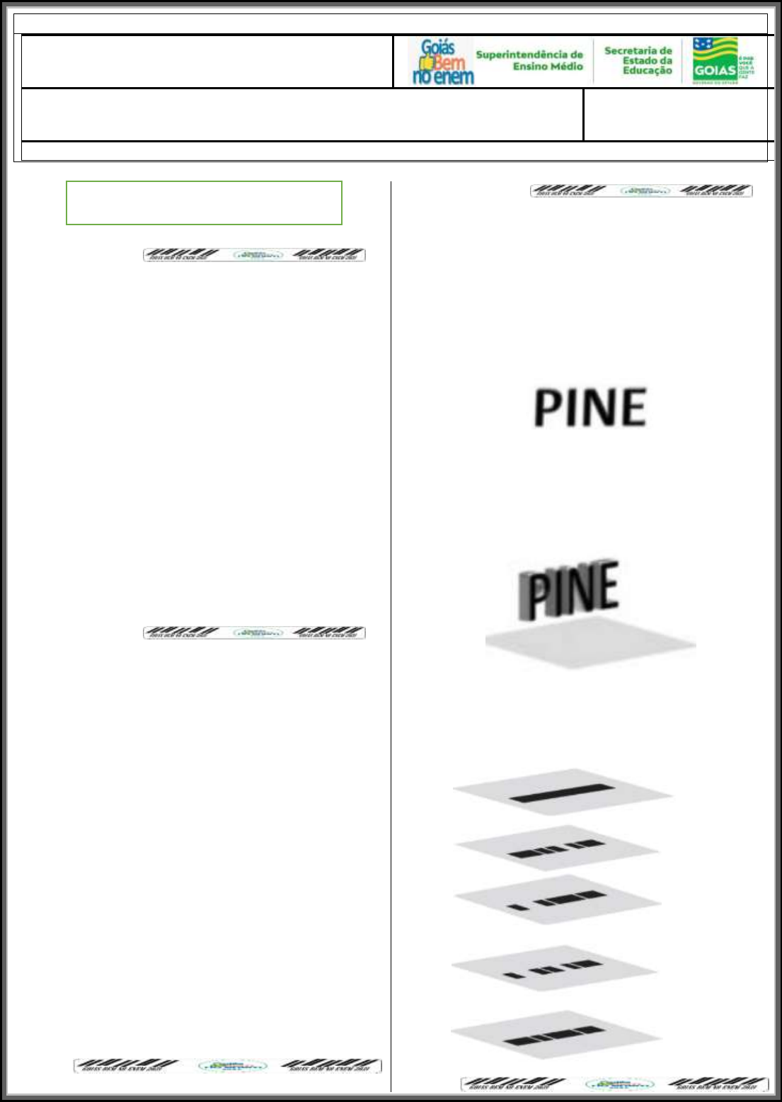 ENEM CONVENCIONAL LISTA 23 DESAFIO WEEKEND TEMA DA AULA: RACIOCÍNIO LÓGICO DATA: ___/____/2021. NOME: QUESTÃO 01 (ENEM/2012) Jogar baralho é uma atividade que estimula o raciocínio. Um jogo tradicional é a Paciência, que utiliza 52 cartas. Inicialmente são formadas sete colunas com as cartas. A primeira coluna tem uma carta, a segunda tem duas cartas, a terceira tem três cartas, a quarta tem quatro cartas, e assim sucessivamente até a sétima coluna, a qual tem sete cartas, e o que sobra forma o monte, que são as cartas não utilizadas nas colunas. A quantidade de cartas que forma o monte é (A) 21. (B) 24. (C) 26. (D) 28. (E) 31. QUESTÃO 02 (ENEM/2019) A Hydrangea macrophylla é uma planta com flor azul ou cor-de-rosa, dependendo do pH do solo no qual está plantada. Em solo ácido (ou seja, com pH < 7) a flor é azul, enquanto que em solo alcalino (ou seja, com pH > 7) a flor é rosa. Considere que a Hydrangea cor-de-rosa mais valorizada comercialmente numa determinada região seja aquela produzida em solo com pH inferior a 8. Sabe-se que pH = - log10x, em que x é a concentração de íon hidrogênio (H+). Para produzir a Hydrangea cor-de-rosa de maior valor comercial, deve-se preparar o solo de modo que x assuma (A) qualquer valor acima de 10−8. (B) qualquer valor positivo inferior a 10−7. (C) valores maiores que 7 e menores que 8. (D) valores maiores que 70 e menores que 80. (E) valores maiores que 10−8 e menores que 10−7. QUESTÃO 03 (ENEM/2019) Um grupo de países criou uma instituição responsável por organizar o Programa Internacional de Nivelamento de Estudos (PINE) com o objetivo de melhorar os índices mundiais de educação. Em sua sede foi construída uma escultura suspensa, com a logomarca oficial do programa, em três dimensões, que é formada por suas iniciais, conforme mostrada na figura. Essa escultura está suspensa por cabos de aço, de maneira que o espaçamento entre letras adjacentes é o mesmo, todas têm igual espessura e ficam dispostas em posição ortogonal ao solo, como ilustrado a seguir. Ao meio-dia, com o sol a pino, as letras que formam essa escultura projetam ortogonalmente suas sombras sobre o solo. (A) (B) (C) (D) (E) MATEMÁTICA 2 QUESTÃO 04 (ENEM/2018-adaptada) Uma torneira do tipo 1/4 de volta é mais econômica, já que seu registro abre e fecha bem mais rapidamente do que o de uma torneira comum. A figura de uma torneira do tipo 1/4 de volta tem um ponto preto marcado na extremidade da haste de seu registro, que se encontra na posição fechado, e, para abri-lo completamente, é necessário girar a haste 1/4 de volta no sentido anti-horário. Considere que a haste esteja paralela ao plano da parede. Disponível em: www.furkin.com.br. Acesso em: 13 nov. 2014. Qual das imagens representa a projeção ortogonal, na parede, da trajetória traçada pelo ponto preto quando o registro é aberto completamente? (A) (B) (C) (D) (E) QUESTÃO 05 (ENEM/2018) Um comerciante abrirá um supermercado, no mês de outubro, e precisa distribuir 5 produtos de limpeza em uma gôndola de cinco prateleiras que estão dispostas uma acima da outra (um tipo de produto por prateleira). Ele sabe que a terceira prateleira oferece uma melhor visibilidade dos produtos aos clientes. Ele fez uma pesquisa sobre o número de vendas desses produtos, nos meses de agosto e setembro, em uma loja da concorrência (mostrada a seguir), e pretende incrementar suas vendas, em relação a seu concorrente, colocando na terceira prateleira de seu supermercado o produto que teve o maior índice de aumento nas vendas no mês de setembro em relação ao mês de agosto, na loja concorrente. O comerciante deve colocar na terceira prateleira o produto número (A) I. (B) II. (C) III. (D) IV. (E) V. http://www.furkin.com.br/ 3 QUESTÃO 06 (ENEM/2018) A rosa dos ventos é uma figura que representa oito sentidos, que dividem o círculo em partes iguais. Uma câmera de vigilância está fixada no teto de um shopping e sua lente pode ser direcionada remotamente, através de um controlador, para qualquer sentido. A lente da câmera está apontada inicialmente no sentido Oeste e o seu controlador efetua três mudanças consecutivas, a saber: • 1ª mudança: 135° no sentido anti-horário; • 2ª mudança: 60° no sentido horário; • 3ª mudança: 45° no sentido anti-horário. Após a 3ª mudança, ele é orientado a reposicionar a câmera, com a menor amplitude possível, no sentido Noroeste (NO) devido a um movimento suspeito de um cliente. Qual mudança de sentido o controlador deve efetuar para reposicionar a câmera? (A) 75° no sentido horário. (B) 105° no sentido anti-horário. (C) 120°no sentido anti-horário. (D) 135° no sentido anti-horário. (E) 165° no sentido horário. QUESTÃO 07 (ENEM/2018) Um edifício tem a numeração dos andares iniciando no térreo (T), e continuando com primeiro, segundo, terceiro, ..., até o último andar. Uma criança entrou no elevador e, tocando no painel, seguiu uma sequência de andares, parando, abrindo e fechando a porta em diversos andares. A partir de onde entrou a criança, o elevador subiu sete andares, em seguida desceu dez, desceu mais treze, subiu nove, desceu quatro e parou no quinto andar, finalizando a sequência. Considere que, no trajeto seguido pela criança, o elevador parou uma vez no último andar do edifício. De acordo com as informações dadas, o último andar do edifício é o (A) 16º. (B) 22º. (C) 23º . (D) 25º. (E) 32º. QUESTÃO 08 (ENEM/2010) Nosso calendário atual é embasado no antigo calendário romano, que, por sua vez, tinha como base as fases da lua. Os meses de janeiro, março, maio, julho, agosto, outubro e dezembro possuem 31 dias, e os demais, com exceção de fevereiro, possuem 30 dias. O dia 31 de março de certo ano ocorreu em uma terça-feira. Nesse mesmo ano, qual dia da semana será o dia 12 de outubro? (A) Domingo. (B) Segunda-feira. (C) Terça-feira. (D) Quarta-feira. (E) Quinta-f