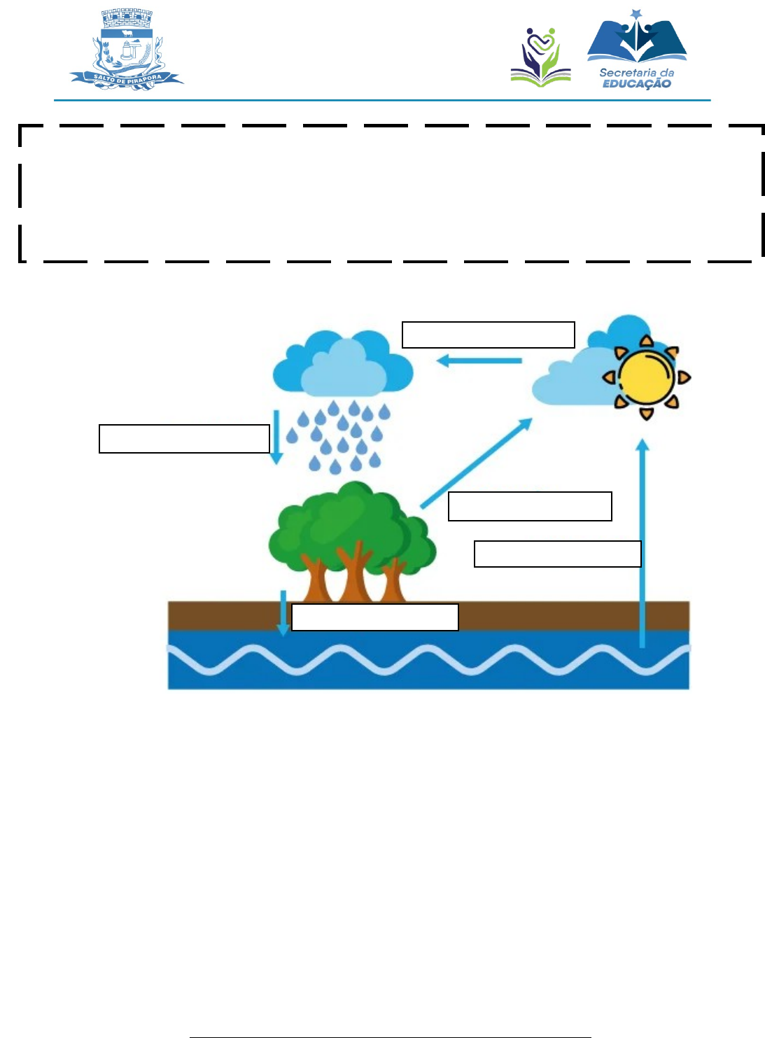 EMEIEF João Fernandes de Andrade R: São Paulo, 85 – Campo Largo Salto de Pirapora – SP, 18160 - 000 AVALIAÇÃO 3º BIMESTRE CIÊNCIAS/ AULAS 1 e 2 ALUNO: ________________________________________________________________________ 5º A DATA: ______ /______/2024 PROFESSORA: ELIANA MENDES 2 1. Observe a ilustração abaixo e escreva as etapas referentes ao ciclo hidrológico. 2. Escreva com suas palavras o que é ciclo hidrológico. ______________________________________________________________________________________________________________________________________________________________________________________________________________________________________________________________________________________________________ 3. Durante o ciclo hidrológico observamos a formação de nuvens, que ocorre graças à transformação do vapor de água em pequenas gotículas. Essa mudança do estado gasoso para o líquido é chamada de: ( ) condensação ( ) sublimação ( ) fusão ( ) evaporação 4. O ciclo da água depende diretamente da energia solar. ( ) verdadeiro ( ) falso 5. Os seres vivos interferem ativamente no movimento do ciclo da água. Qual opção mostra o nome do processo caracterizado pela perda de água pelas plantas na forma de vapor. ( ) respiração ( ) fotossíntese ( ) digestão ( ) transpiração 6. A solidificação é a transformação da água do estado...? ( ) sólido para líquido ( ) gasoso para líquido ( ) líquido para gasoso ( ) líquido para sólido 7. Ao lado de cada imagem indique a atividade econômica (agricultura/pecuária/indústria) a qual pertence e explique a importância da água em cada setor de trabalho. 8. Escreva o nome da imagem abaixo e explique qual é a forma de energia que ela cria. 9. Indique algumas ações que podemos ter para preservar a água. 10. Encontre as palavras que se referem ao ciclo hidrológico. image4.jpeg image5.jpeg image6.png image7.jpeg image8.jpeg image9.jpeg image10.jpeg image11.png image1.png image2.png image3.png image3.gif