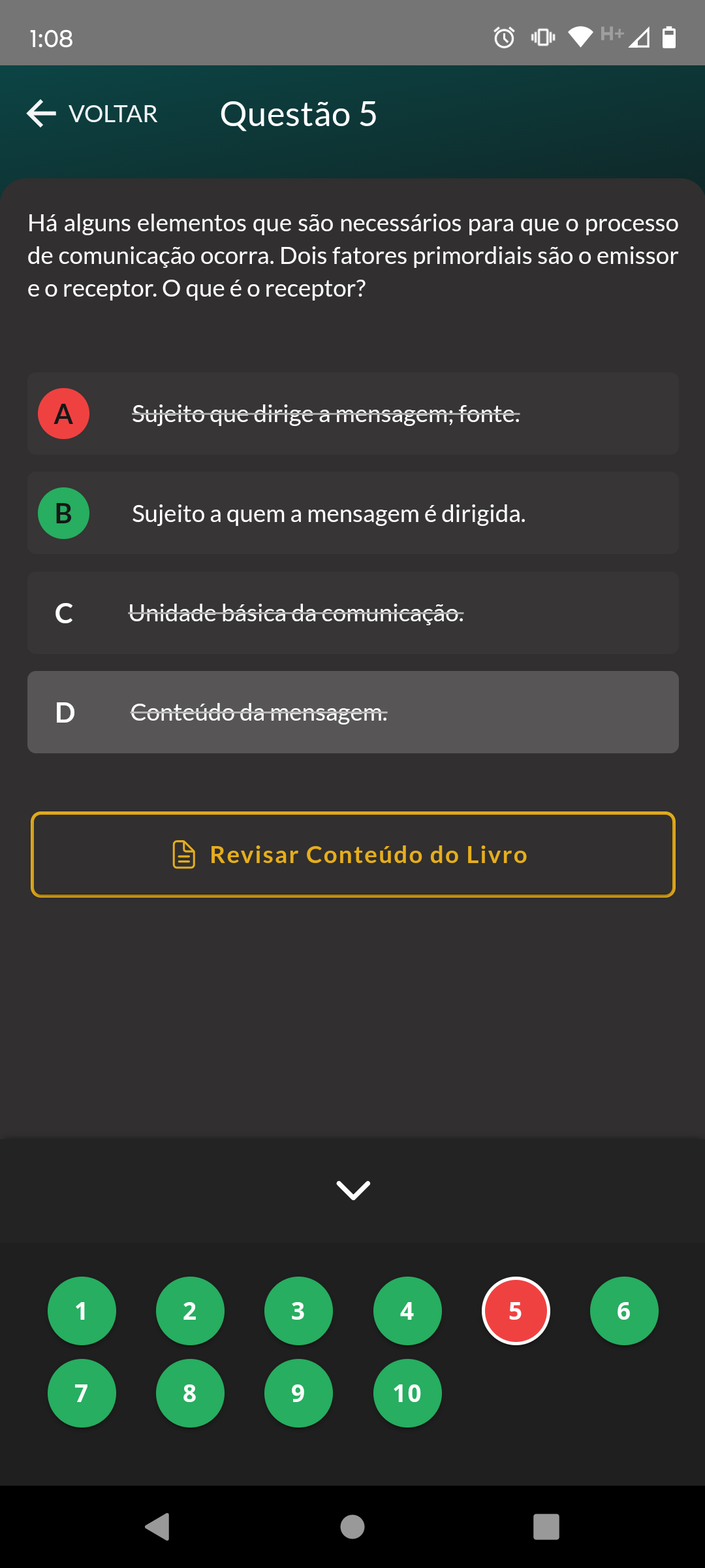 1:08 H+ VOLTAR Questão 5 Há alguns elementos que são necessários para que processo de comunicação ocorra. Dois fatores primordiais são emissor e receptor. O que é receptor? A Sujeito que dirige a mensagem; fonte. B Sujeito a quem a mensagem é dirigida. Unidade básica da comunicação. D da mensagem. Revisar Conteúdo do Livro 1 2 3 4 5 6 7 8 9 10