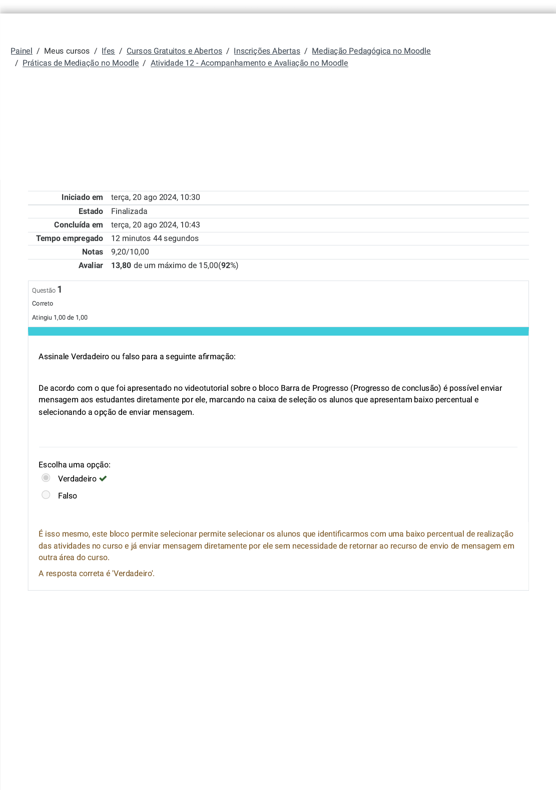 Iniciado em terça, 20 ago 2024, 10:30 Estado Finalizada Concluída em terça, 20 ago 2024, 10:43 Tempo empregado 12 minutos 44 segundos Notas 9,20/10,00 Avaliar 13,80 de um máximo de 15,00(92%) Questão 1 Correto Atingiu 1,00 de 1,00 Assinale Verdadeiro ou falso para a seguinte afirmação: De acordo com o que foi apresentado no videotutorial sobre o bloco Barra de Progresso (Progresso de conclusão) é possível enviar mensagem aos estudantes diretamente por ele, marcando na caixa de seleção os alunos que apresentam baixo percentual e selecionando a opção de enviar mensagem. Escolha uma opção: Verdadeiro Falso É isso mesmo, este bloco permite selecionar permite selecionar os alunos que identificarmos com uma baixo percentual de realização das atividades no curso e já enviar mensagem diretamente por ele sem necessidade de retornar ao recurso de envio de mensagem em outra área do curso. A resposta correta é 'Verdadeiro'. Painel / Meus cursos / Ifes / Cursos Gratuitos e Abertos / Inscrições Abertas / Mediação Pedagógica no Moodle / Práticas de Mediação no Moodle / Atividade 12 - Acompanhamento e Avaliação no Moodle https://mooc.cefor.ifes.edu.br/moodle/course/view.php?id=403 https://mooc.cefor.ifes.edu.br/moodle/course/view.php?id=403 https://mooc.cefor.ifes.edu.br/moodle/my/ https://mooc.cefor.ifes.edu.br/moodle/course/index.php?categoryid=1 https://mooc.cefor.ifes.edu.br/moodle/course/index.php?categoryid=2 https://mooc.cefor.ifes.edu.br/moodle/course/index.php?categoryid=6 https://mooc.cefor.ifes.edu.br/moodle/course/view.php?id=403 https://mooc.cefor.ifes.edu.br/moodle/course/view.php?id=403#section-5 https://mooc.cefor.ifes.edu.br/moodle/mod/quiz/view.php?id=68995 Questão 2 Correto Atingiu 1,00 de 1,00 Questão 3 Correto Atingiu 1,00 de 1,00 Com relação à barra de progresso, NÃO podemos afirmar que: Escolha uma opção: a. Na visão geral dos aluno, é possível selecionar os alunos com pendências e enviar mensagem. b. É uma ferramenta de gerenciamento das atividades útil tanto para os alunos quanto para os professores, pois mostra o progresso nas atividades e recursos de um curso. c. Na página de visão geral, os professores mediadores podem ver o progresso de todos os alunos, possibilitando identificar rapidamente os alunos com muitas pendências. d. A barra de progresso permite ao professor apenas visualizar o progresso de um aluno por vez. e. É um plugin do tipo Bloco. Sua resposta está correta. A resposta correta é: A barra de progresso permite ao professor apenas visualizar o progresso de um aluno por vez. Sobre o acompanhamento e conclusão no Moodle, NÃO podemos afirmar que: Escolha uma opção: a. Quando o acompanhamento de conclusão é ativado no curso, todos recursos e atividades ficam acompanhados da caixa de seleção. Não é possível desabilitar essa opção no caso de recursos como banners, rótulos separadores e outros que não necessitem da caixa de seleção para marcação de conclusão. b. O acompanhamento de conclusão ajuda muito o aluno para que ele possa identificar rapidamente atividades concluídas e as que ainda precisa fazer. c. As atividades que tiverem uma caixa de seleção pontilhada na frente serão marcadas como concluídas automaticamente assim que forem atingidos os requisitos necessários daquela atividade. d. Se o acompanhamento de conclusão estiver ativado, uma caixa de seleção aparecerá próximo a atividade. e. O estudante poderá marcar manualmente a conclusão de atividades que tiverem a caixa de seleção contínua. Sua resposta está correta. A resposta correta é: Quando o acompanhamento de conclusão é ativado no curso, todos recursos e atividades ficam acompanhados da caixa de seleção. Não é possível desabilitar essa opção no caso de recursos como banners, rótulos separadores e outros que não necessitem da caixa de seleção para marcação de conclusão. Questão 4 Correto Atingiu 1,00 de 1,00 Questão 5 Parcialmente correto Atingiu 0,20 de 1,00 Sobre os relatórios disponíveis no Moodle, marque a opção FALSA. Escolha uma opção: a. É possível saber que materiais os alunos tem acessado. b. É possível ter uma visão geral dos alunos, mas não é possível aplicar filtros. c. Existem relatórios que são padrão e outros que podem aparecer ou não de acordo com as configurações da instituição e do curso. d. É possível visualizar os logs dos alunos, que são os registros de todas as ações que o aluno realiza no AVA. e. É possível saber se os alunos realizaram as atividades, se fizeram isso na última hora e se completaram todas as atividades no curso. Sua resposta está correta. Os relatórios permitem muitas possibilidades, seja numa visão geral ou com o uso de filtros. A resposta correta é: É possível ter uma visão geral dos alunos, mas não é possível aplicar filtros. Associe o tipo de avaliação descrito à atividade mais apropriada. É possível visualizar os itens inseridos pelos alunos numa lista ou vendo um item único e, assim, poderá atribuir nota e dar um feedback, porém este é público. Há tipos de questões que não necessitam de correção, pois são corrigidas automaticamente. Outros porém, precisam ser avaliados pelo professor. É possível aprofundar discussões, introduzir novas ideias, estimular debates, bem como atribuir notas e dar feedbacks. Entretanto, é importante observar que em muitas versões os feedbacks ficam públicos. Pode-se analisar a versão final criada pelos alunos ou o histórico, com versões anteriores, inclusive quem criou o que. Mas não permite dar notas diretamente. Pode-ser ver todos os envios e atribuir notas e feedbacks ou clicar em Notas e analisar individualmente cada aluno. Neste caso, é possível analisar na própria tela o arquivo ou texto enviado, dar nota e um feedback privado. Tarefa Questionário Wiki Base de Dados Fórum Sua resposta está parcialmente correta. Você selecionou corretamente 1. A resp