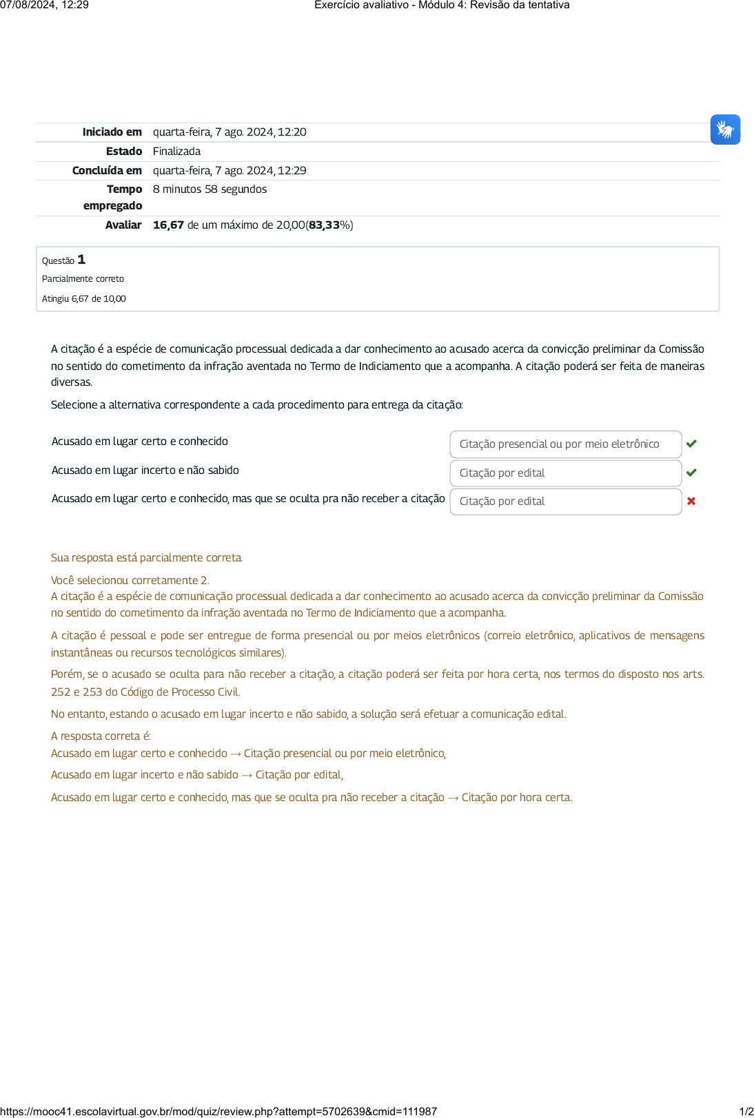 Iniciado em quarta-feira, 7 ago. 2024, 12:20 Estado Finalizada Concluída em quarta-feira, 7 ago. 2024, 12:29 Tempo empregado 8 minutos 58 segundos Avaliar 16,67 de um máximo de 20,00(83,33%) Questão 1 Parcialmente correto Atingiu 6,67 de 10,00 A citação é a espécie de comunicação processual dedicada a dar conhecimento ao acusado acerca da convicção preliminar da Comissão no sentido do cometimento da infração aventada no Termo de Indiciamento que a acompanha. A citação poderá ser feita de maneiras diversas. Selecione a alternativa correspondente a cada procedimento para entrega da citação: Acusado em lugar certo e conhecido Acusado em lugar incerto e não sabido Acusado em lugar certo e conhecido, mas que se oculta pra não receber a citação Citação presencial ou por meio eletrônico Citação por edital Citação por edital Sua resposta está parcialmente correta. Você selecionou corretamente 2. A citação é a espécie de comunicação processual dedicada a dar conhecimento ao acusado acerca da convicção preliminar da Comissão no sentido do cometimento da infração aventada no Termo de Indiciamento que a acompanha. A citação é pessoal e pode ser entregue de forma presencial ou por meios eletrônicos (correio eletrônico, aplicativos de mensagens instantâneas ou recursos tecnológicos similares). Porém, se o acusado se oculta para não receber a citação, a citação poderá ser feita por hora certa, nos termos do disposto nos arts. 252 e 253 do Código de Processo Civil. No entanto, estando o acusado em lugar incerto e não sabido, a solução será efetuar a comunicação edital. A resposta correta é: Acusado em lugar certo e conhecido → Citação presencial ou por meio eletrônico, Acusado em lugar incerto e não sabido → Citação por edital, Acusado em lugar certo e conhecido, mas que se oculta pra não receber a citação → Citação por hora certa. 07/08/2024, 12:29 Exercício avaliativo - Módulo 4: Revisão da tentativa https://mooc41.escolavirtual.gov.br/mod/quiz/review.php?attempt=5702639&cmid=111987 1/2 Questão 2 Correto Atingiu 10,00 de 10,00 Julgue a a�rmativa: Nos processos correcionais as comunicações jamais devem ser enviadas aos destinatários por meio de carta com aviso de recebimento, em razão da ausência de previsão legal. Escolha uma opção: Verdadeiro Falso Você acertou! A a�rmativa é falsa, pois o envio de comunicação processual pode, excepcionalmente, ser realizada por meio de carta com aviso de recebimento. A Lei nº 9.784/99 e o Decreto nº 8.420/15 preveem a possibilidade de remessa da comunicação processual por meio de carta. Tais dispositivos são utilizados de maneira excepcional nos processos correcionais, devendo a correspondência ser enviada com aviso de recebimento e, especi�camente no caso dos processos disciplinares, também com o serviço de “mão própria”. A resposta correta é 'Falso'. 07/08/2024, 12:29 Exercício avaliativo - Módulo 4: Revisão da tentativa https://mooc41.escolavirtual.gov.br/mod/quiz/review.php?attempt=5702639&cmid=111987 2/2