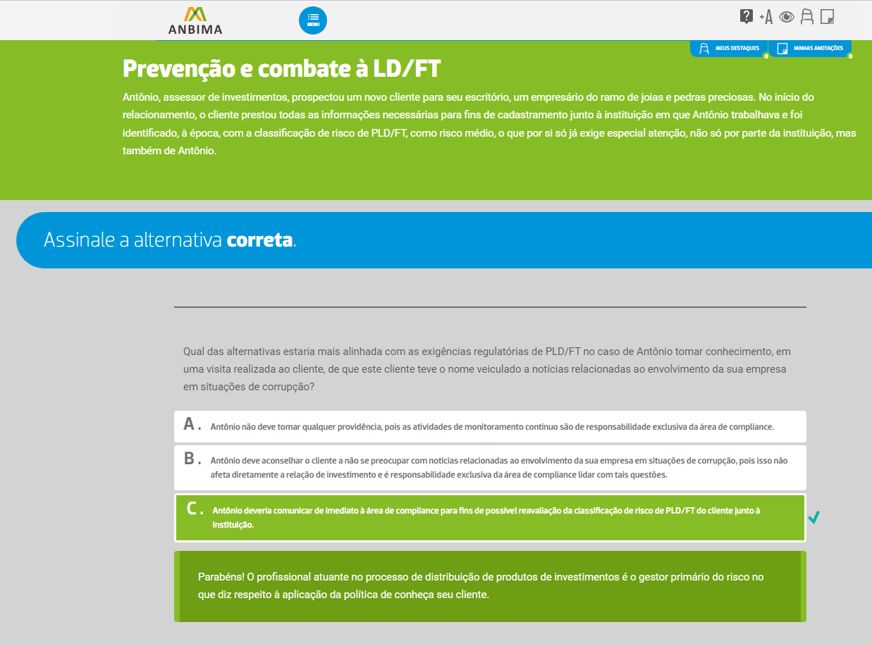 ANBIMA A MEUS DESTAQUES MINHAS ANOTAÇÕES Prevenção e combate à LD/FT Antônio, assessor de investimentos, prospectou um novo cliente para seu escritório, um empresário do ramo de joias e pedras preciosas. No início do relacionamento, o cliente prestou todas as informações necessárias para fins de cadastramento junto à instituição em que Antônio trabalhava e foi identificado, à época, com a classificação de risco de PLD/FT, como risco médio, que por si só já exige especial atenção, não só por parte da instituição, mas também de Assinale a alternativa correta. Qual das alternativas estaria mais alinhada com as exigências regulatórias de PLD/FT no caso de Antônio tomar conhecimento, em uma visita realizada ao cliente, de que este cliente teve o nome veiculado a notícias relacionadas ao envolvimento da sua empresa em situações de corrupção? A. Antônio não deve tomar qualquer providência, pois as atividades de monitoramento contínuo são de responsabilidade exclusiva da área de B Antônio deve aconselhar cliente a não se preocupar com relacionadas ao envolvimento da sua empresa em situações de corrupção, pois isso não afeta diretamente a relação de investimento e é responsabilidade exclusiva da área de compliance lidar com tais questões. C. deverla comunicar de à área de compliance para fins de possível da classificação de risco de PLD/FT do cliente junto à Instituição. Parabéns! profissional atuante no processo de distribuição de produtos de investimentos é gestor primário do risco no que diz respeito à aplicação da política de conheça seu cliente.