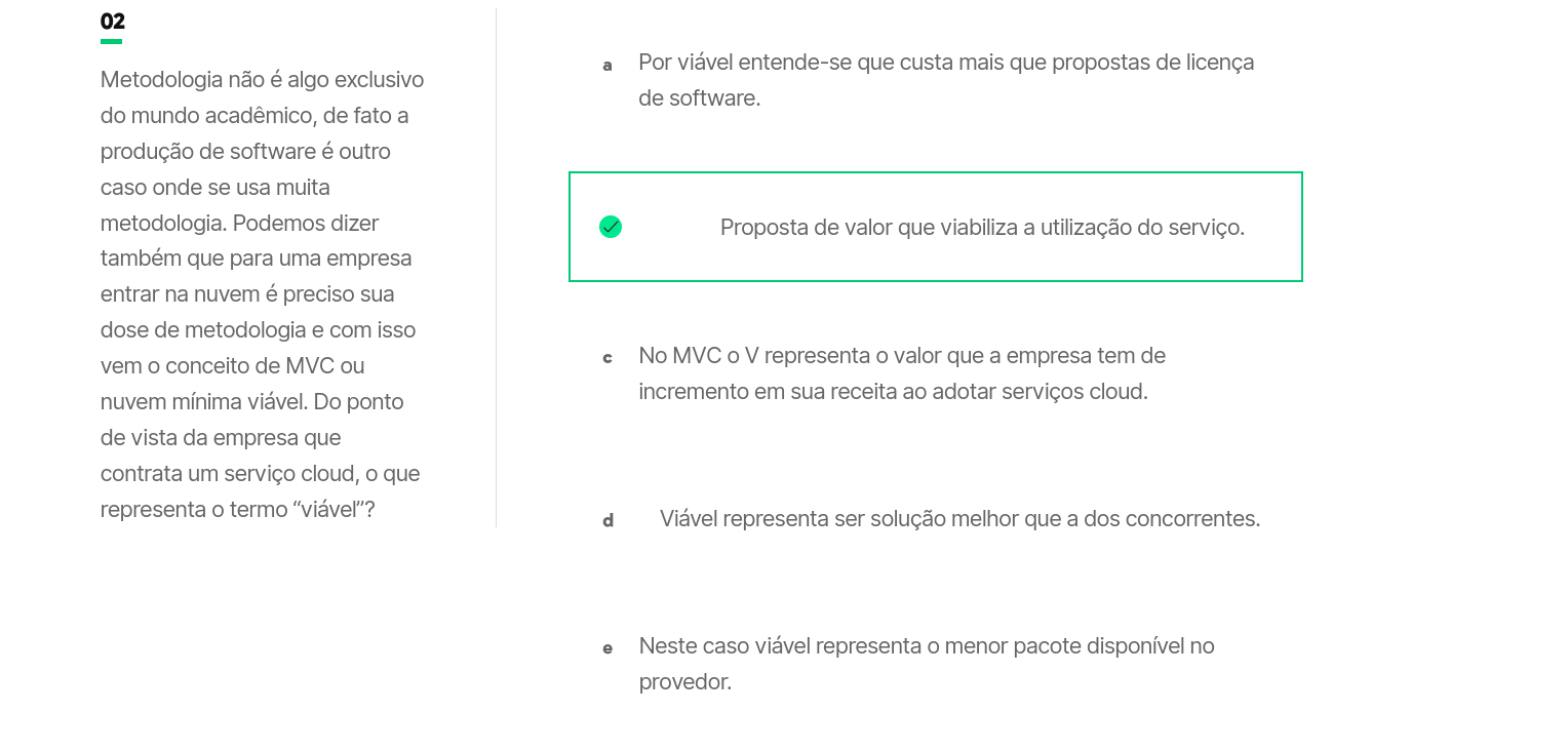 02 a Por viável entende-se que custa mais que propostas de licença Metodologia não é algo exclusivo de software. do mundo acadêmico, de fato a produção de software é outro caso onde se usa muita metodologia. Podemos dizer Proposta de valor que viabiliza a utilização do serviço. também que para uma empresa entrar na nuvem é preciso sua dose de metodologia e com isso vem o conceito de MVC ou No MVC o V representa o valor que a empresa tem de nuvem mínima viável. Do ponto incremento em sua receita ao adotar serviços cloud. de vista da empresa que contrata um serviço cloud, o que representa termo "viável"? d Viável representa ser solução melhor que a dos concorrentes. e Neste caso viável representa menor pacote disponível no provedor.