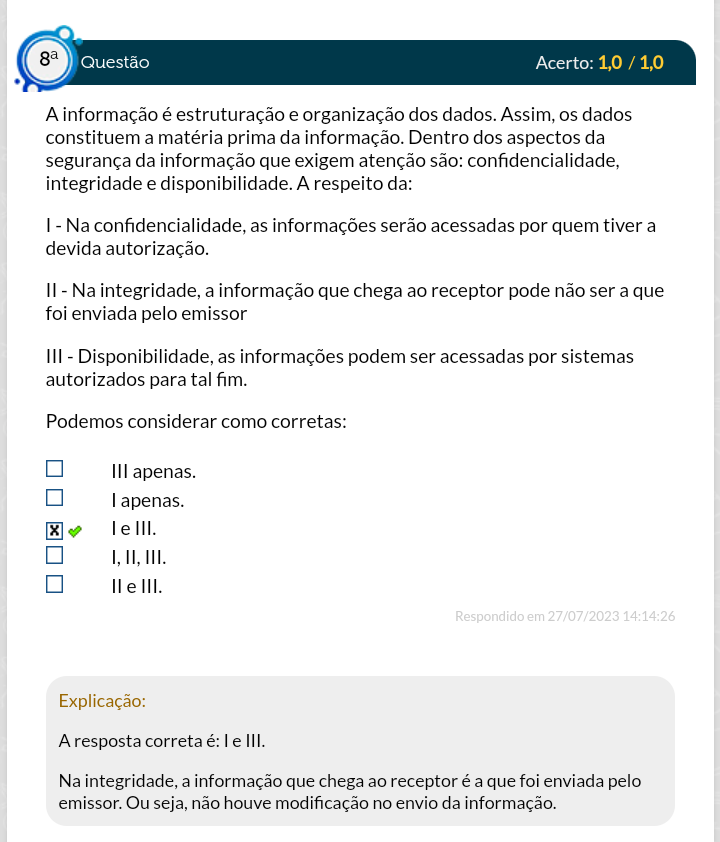 Questão Acerto: 1,0 / 1,0 A informação é estruturação e organização dos dados. Assim, os dados constituem a matéria prima da informação. Dentro dos aspectos da segurança da informação que exigem atenção são: integridade e disponibilidade. A respeito da: - Na confidencialidade, as informações serão acessadas por quem tiver a devida autorização. II - Na integridade, a informação que chega ao receptor pode não ser a que foi enviada pelo emissor III - Disponibilidade, as informações podem ser acessadas por sistemas autorizados para tal fim. Podemos considerar como corretas: III apenas. apenas. e III. Respondido em 27/07/2023 14:14:26 Explicação: A resposta correta é: e III. Na integridade, a informação que chega ao receptor é a que foi enviada pelo emissor. Ou seja, não houve modificação no envio da informação.