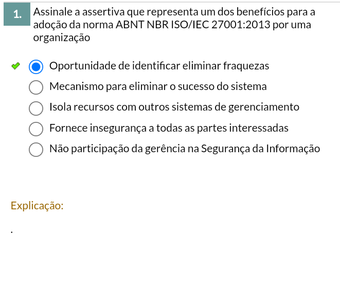 1. Assinale a assertiva que representa um dos benefícios para a adoção da norma ABNT NBR ISO/IEC 27001:2013 por uma organização Oportunidade de identificar eliminar fraquezas Mecanismo para eliminar o sucesso do sistema Isola recursos com outros sistemas de gerenciamento Fornece insegurança a todas as partes interessadas Não participação da gerência na Segurança da Informação Explicação: