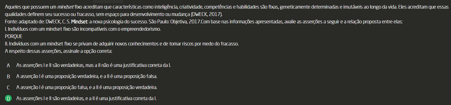 Aqueles que possuem um mindset fixo acreditam que características como inteligência, criatividade, competências e habilidades são fixas, geneticamente determinadas e imutáveis ao longo da vida. Eles acreditam que essas qualidades definem seu sucesso OU fracasso, sem espaço para desenvolvimento ou mudança (DWECK, 2017). Fonte: adaptado de: C.S. Mindset: a nova psicologia do sucesso. São Paulo: Objetiva, 2017 Com base nas informações apresentadas, avalie as asserções a seguir e a relação proposta entre elas: I. Indivíduos com um mindset fixo são incompatíveis com empreendedorismo. PORQUE II. Indivíduos com um mindset fixo se privam de adquirir novos conhecimentos e de tomar riscos por medo do fracasso. A respeito dessas asserções, assinale a opção correta: A As asserções I e II são verdadeiras, mas a II não é uma justificativa correta da I. B A asserção I é uma proposição verdadeira, e a é uma proposição falsa. A asserção I é uma proposição falsa, e a II é uma proposição verdadeira. D As asserções e II são verdadeiras, e a II é uma justificativa correta da I.