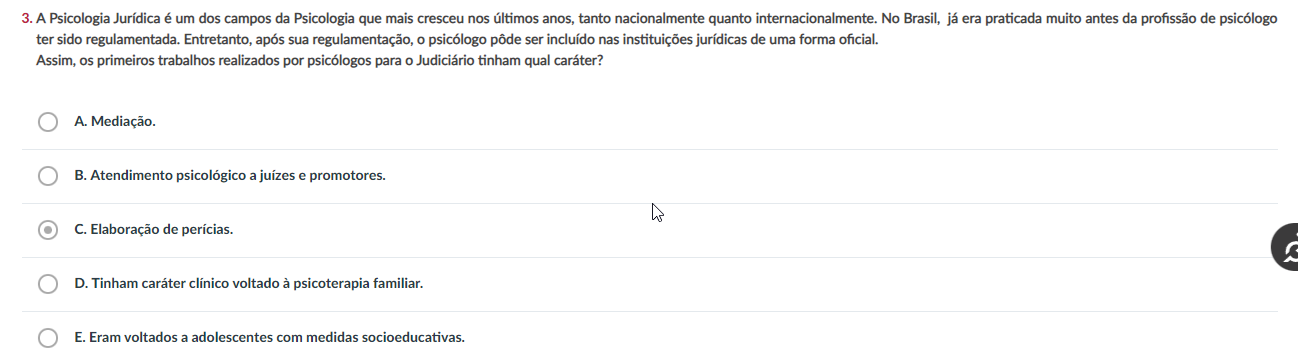 3. A Psicologia Jurídica é um dos campos da Psicologia que mais cresceu nos últimos anos, tanto nacionalmente quanto internacionalmente. No Brasil, já era praticada muito antes da profissão de psicólogo ter sido regulamentada. Entretanto, após sua regulamentação, psicólogo pôde ser incluído nas instituições jurídicas de uma forma oficial. Assim, os primeiros trabalhos realizados por psicólogos para Judiciário tinham qual caráter? A. Mediação. B. Atendimento psicológico a juízes e promotores. C. Elaboração de perícias. D. Tinham caráter clínico voltado à psicoterapia familiar. E. Eram voltados a adolescentes com medidas