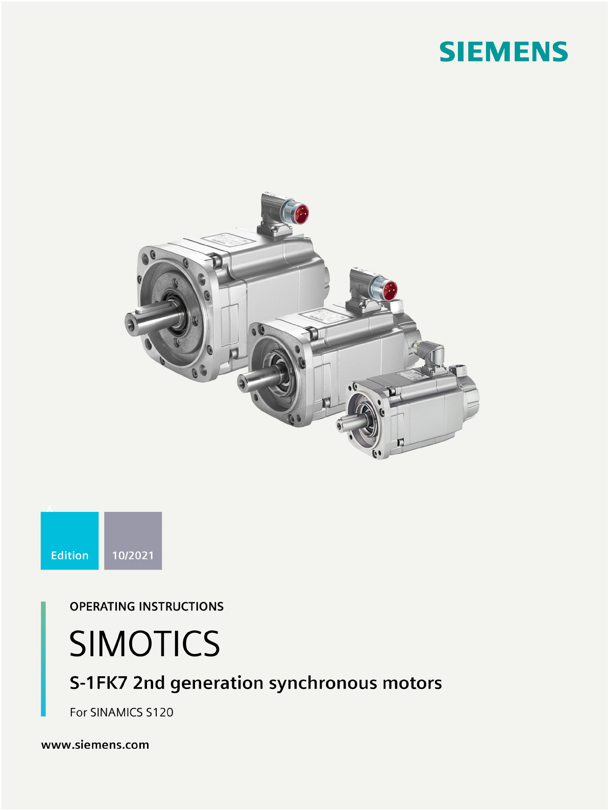 1FK7 G2 synchronous motors SIMOTICS Drive technology 1FK7 G2 synchronous motors Operating Instructions 10/2021 A5E50907562B AB Introduction Fundamental safety instructions 1 Description of the motors 2 Preparing for use 3 Mounting 4 Connecting 5 Commissioning 6 Operation 7 Faults and their rectification 8 Maintenance 9 Decommissioning and disposal 10 Technical data 11 Glossary 12 Appendix A Siemens AG Digital Industries Postfach 48 48 90026 NÜRNBERG GERMANY Document order number: . Ⓟ 10/2021 Subject to change Copyright © Siemens AG 2011 - 2021. All rights reserved Legal information Warning notice system This manual contains notices you have to observe in order to ensure your personal safety, as well as to prevent damage to property. The notices referring to your personal safety are highlighted in the manual by a safety alert symbol, notices referring only to property damage have no safety alert symbol. These notices shown below are graded according to the degree of danger. DANGER indicates that death or severe personal injury will result if proper precautions are not taken. WARNING indicates that death or severe personal injury may result if proper precautions are not taken. CAUTION indicates that minor personal injury can result if proper precautions are not taken. NOTICE indicates that property damage can result if proper precautions are not taken. If more than one degree of danger is present, the warning notice representing the highest degree of danger will be used. A notice warning of injury to persons with a safety alert symbol may also include a warning relating to property damage. Qualified Personnel The product/system described in this documentation may be operated only by personnel qualified for the specific task in accordance with the relevant documentation, in particular its warning notices and safety instructions. Qualified personnel are those who, based on their training and experience, are capable of identifying risks and avoiding potential hazards when working with these products/systems. Proper use of Siemens products Note the following: WARNING Siemens products may only be used for the applications described in the catalog and in the relevant technical documentation. If products and components from other manufacturers are used, these must be recommended or approved by Siemens. Proper transport, storage, installation, assembly, commissioning, operation and maintenance are required to ensure that the products operate safely and without any problems. The permissible ambient conditions must be complied with. The information in the relevant documentation must be observed. Trademarks All names identified by ® are registered trademarks of Siemens AG. The remaining trademarks in this publication may be trademarks whose use by third parties for their own purposes could violate the rights of the owner. Disclaimer of Liability We have reviewed the contents of this publication to ensure consistency with the hardware and software described. Since variance cannot be precluded entirely, we cannot guarantee full consistency. However, the information in this publication is reviewed regularly and any necessary corrections are included in subsequent editions. 1FK7 G2 synchronous motors Operating Instructions, 10/2021, A5E50907562B AB 3 Introduction Keeping the documentation safe This documentation should be kept in a location where it can be easily accessed and made available to the personnel responsible. Target group and benefits Target group These Operating Instructions are intended for installation engineers, commissioners, machine operators, and service and maintenance personnel. Utilization phase Planning and configuration phase, implementation phase, setup and commissioning phase, application phase, maintenance and service phase About these Operating Instructions These Operating Instructions apply to the SIMOTICS S-1FK7 servomotor, 2nd generation, called "1FK7" later. The Operating Instructions provide information about the components that enable the target group to install, set up, test, commission, operate, and troubleshoot the products and systems correctly and safely. These Operating Instructions explain how to handle the 1FK7 from delivery to disposal. You find additional information in the Configuration Manual for the 1FK7. Before you start using the motor, you must read these Operating Instructions to ensure safe, problem-free operation and to maximize the service life. Siemens strives continually to improve the quality of information provided in these Operating Instructions. • If you find any mistakes or would like to offer suggestions about how this document could be improved, contact the Siemens Service Center. • Always follow the safety instructions and notices in this Product Information. The warning notice system is explained on the rear of the inside front. Introduction 1FK7 G2 synchronous motors 4 Operating Instructions, 10/2021, A5E50907562B AB Text features In addition to the notes that you must observe for your own personal safety as well as to avoid material damage, in this document you will find the following text features: Operating instructions Handling instructions with a specified sequence start with the word "Procedure": The individual handling steps are numbered. 1. Execute the operating instructions in the specified sequence. ❒ The square indicates the end of the operating instruction. Operating instructions without a specified sequence are identified using a bullet point: • Execute the operating instructions. Enumerations • Enumerations are identified by a bullet point without any additional symbols. – Enumerations at the second level are hyphenated. Notes Notes are shown as follows: Note A Note is an important item of information about the product, handling of the product or the relevant section of the document. Notes provide you with help or further suggestions/ideas. More information Information on the following topics is available at: 