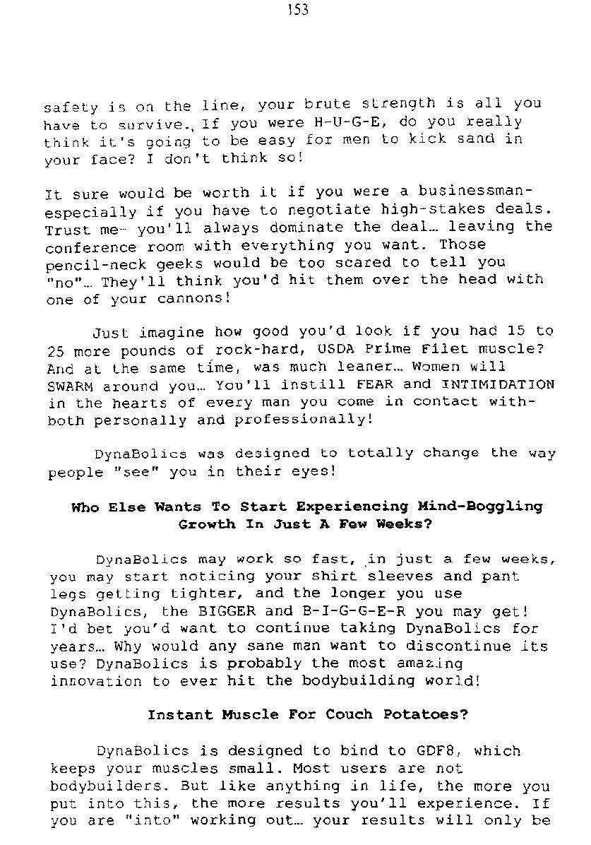 r 153 safety is on the line, your brute strength is all you have to survive., If you were H-U-G-E, do you really think it's going to be easy for men to kick sand in your face? I don't think so! It sure would be worth it if you were a businessman- especially if you have to negotiate high-stakes deals. Trust me-- you'll always dominate the deaL. leaving the conference room with everything you want. Those pencil-neck geeks would be too scared to tell you "no" ...They'll think you'd hit them over the head with one of your cannons! Just imagine how good you'd look if you had 15 to 25 more pounds of rock-hard, USDA Prime Filet muscle? And a L the same time, was much leaner...Women will SWARM around you ...You'll instill FEAR and INTIMIDATION in the hearts of every man you come in contact with- both personally and professionally! DynaBolics was designed to totally change the way people "see" you in their eyes! Who Else Wants To Start Experiencing Mind-Boggling Growth In Just A Few Weeks? DynaBolics may work so fast, .in just a few weeks, you may start noticing your shirt sleeves and pant legs getting tighter, and the longer you use DynaBolics, the BIGGER and B-I-G-G-E-R you may get! I'd bet you'd want to continue taking DynaBolics for years ...Why would any sane man want to discontinue its use? DynaBolics is probably the most amazing innovation to ever hit the bodybuilding world! Instant Muscle For Couch Potatoes? DynaBolics is designed to bind to GDF8, which keeps your muscles small. Most users are not bodybuilders. But like anything in life, the more you put into this, the more results you'll experience. If you are "into" working out...your results will only be r 154 faster. It's possible to gain championship size in about 12 to 16 weeks- instead of the 3 to 5 years it usually takes! Imagine What You May Look Like In Just A Few Months ... Week by week ...you'll be standing in the mirror, tape measure in hand- with a smile on your face that just won't go away. Arms, chest, and stomach so ripped up, you'll think it's not really "your" body ...You'll have to pinch yourself to prove its really "All You"! DynaBolics Was Created To DOUBLE Your Current Strength ...DOUBLE Your Current Size ...and Can Make Your Definition So We~l Chiseled; You'll Look Like A Greek Statue! Take DynaBolics for 16 weeks and if you don't "FEEL" your arms growing ...don't "FEEL" your strength increasing ...and don't "SEE" fat starting to evaporate ... send the empty bottles back for a DOUBLE YOUR MONEY BACK refund of your purchase price. I can offer you such a no-risk guarantee because I KNOW an overwhelming number of men who are using this product are experiencing results that almost defy belief! I challenge you to tell us these pills do not change your life. So what you should do right now is order DynaBolics. We're currently having a special where you can get your first months supply for just $59.95 a bottle. So, have your credit card ready and call 1- 800-123-4567 or send it in the mail. The address is 7500 West Lake Mead Blvd., Suite 9-482, Las Vegas, Nevada 89128. Supplies are limited, and every day that goes by is just one more day you'll have to wait to have that muscular, strong, sexy body you've always craved! And remember, you'll get DOUBLE YOUR MONEY BACK if DynaBolics fails to impress you after 120 days. I55 But you got to hurry- I only have 2384 bottles in stock- that's enough of a supply to last me 7 days or so. And at this low price (65% off), they'll surely be gone in a week. Plus, so you don't get stuck paying our $99.95 retail price on future bottles (if you can even get your hands on them because our supply is so limited), you'll receive FREE membership into our Preferred Customer Club- usually reserved for Professional Bodybuilders, where you'll save $60 on all your future month's supplies. And so you don't go a day without DynaBolics in your system- even when our supplies are sold out to the general public, you're GUARANTEED a fresh 30-day supply every month- sent automatically and you'll pay just $39.95 plus $7 shipping/handling. Cancel shipments anytime . ....-, Id~)~1)~ Benjamin Bergin for MedEx Laboratories To Order Call: 1-800-123-4567 ps: What man wouldn't want DynaBolics? Just a few pills a day and in minimal time you may "OWN" those muscles that were always too darned hard to build- without countless hours in the gym! The bottom line ... if you block the effects of GDF8 long enough, you may literally attain a muscular physique so enormous, it was once impossible to obtain- but The Future Has Arrived! pps: The active ingredient in DynaBolics is a rare sea algae called Cystoseria Canariensis, which was first discovered by researchers at Las Palmas University in Spain. Production of this ingredient is impossible without the use of a precisely controlled, hydroponic farm Lo maintain ideal growing conditions. This means only a small amount of this ingredient can be produced at a time. So to guarantee you'll be able to reserve 156 DynaBolics, you'd better order now. Once we are sold out of DynaBolics we'll be forced to turn away new customers until the next batch is available which may be 120 days from now. So again, our phone number is 1- 800-123-4567 or if you can send your card info in the mail. Our address is 7500 West Lake Mead Blvd., Suite 9-482, Las Vegas, Nevada 89128. And don't forget- you're protected by a full 120-Day DOUBLE YOUR MONEY BACK GUARANTEE. ..so there J s no risk on your part! You have nothing to lose ... it's that plain and simple. PPPS: Make sure to read the CLINICAL STUDY RESULTS from Zakir Ramazanov, PhD, Musa Abidov, MD, and Miguel Jimenez del Rio, PhD. It's SOLID PROOF this is REAL. *** Let me ask you a question ... after reading this, even if you weren't a bodybuilder ... did it stir you up a bit? This was a great example of some killer copy. You should want all your sales letters to sound this compelling. There are a couple of things I want to cover that are "golden rul