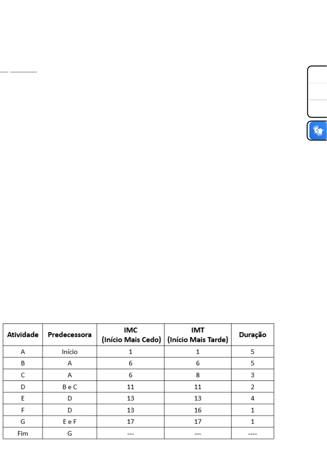 Atividade 3 Iniciado: 12 ago em 6:24 Instruções do teste Pergunta 1 0,2 pts Importante: Caso você esteja realizando a atividade através do aplicativo "Canvas Student", é necessário que você clique em "FAZER O QUESTIONÁRIO", no final da página. Leia o texto a seguir: Historicamente, gerenciar projetos de grande ou média complexidade com vista à redução no consumo de recursos e primando pela otimização do tempo por meio de ferramentas visuais representou uma das maiores mudanças de paradigmas gerenciais no século 20, transformando a arte de administrar em ciência da administração. Hoje, se aplica, para gerenciamento de projetos, técnicas como o Program Evaluation and Review Technique (PERT) e o Critical Path Method (CPM), ou Método do Caminho Crítico, surgidos no final da década de 1950 e no início dos anos 1960. Finalmente, em 1964, surgiu o Diagrama de Precedências (MDP), desenvolvido por Roy no França. Basicamente, esse diagrama representou uma evolução das técnicas anteriores e, devido a sua simplicidade, tem consolidado sua disseminação até os dias de hoje em escritórios de projetos de pequeno, médio e grande porte. Fonte: VICTOR, J. Entendendo o diagrama de redes do seu projeto. Guia da engenharia. 18/01/2019. Disponível em: https://www.guiadaengenharia.com/diagramas-redes-elementos/. Acesso em: 02 de março de 2021. Adaptado. Com relação a Diagrama de Rede observe a tabela abaixo: Considerando a tabela do Diagrama de Rede de um determinado projeto com o sequenciamento de suas atividades apontando como são as atividades predecessoras, seu início mais cedo da A+ A A- 8/12/24, 6:32 AM Teste: Atividade 3 https://famonline.instructure.com/courses/41089/quizzes/196950/take 1/6 Pergunta 2 0,2 pts atividade, seu início mais tarde da atividade e o tempo de duração de cada atividade, analise as afirmativas abaixo: I. O tempo de execução de todo projeto, desde o seu início até o seu final é de total do projeto, do início ao fim, é de 21 dias. II. O caminho crítico do diagrama de Rede é representado pelas atividades A-B-D-E-G. III. A folga das atividades pode ser obtida pela equação: IMT (Início Mais Tarde) - IMC (Início Mais Cedo) ou também pela equação: TMT (Término Mais Tarde) - TMC (Término Mais Cedo). IV. A folga total das atividades A, B, C e E é igual a zero. Estão corretas as afirmativas: II e III, apenas. I, II, III e IV. I e III, apenas. I, III e IV, apenas. I, II e III, apenas. Leia o texto abaixo: Working Breakdown Structure (ou EAP - Estrutura Analítica de Projeto) é uma representação gráfica que apresenta o escopo do projeto de forma visual, hierarquicamente dividida em partes menores, a fim de facilitar o gerenciamento das entregas do projeto. Tem o propósito de dividir uma determinada grande tarefa em tarefas menores que serão mais bem visualizadas pelo gerente de projetos. Essa representação gráfica da EAP auxilia o gerente de projetos a fazer um planejamento com base em uma visão holística do projeto, proporcionando-lhe implementar as ações necessárias para se alcançar os objetivos traçados. Com relação a estrutura EAP, analise as afirmações abaixo: 1. Podemos entender a EAP como um diagrama em formato de árvore, tendo o “tronco” na parte superior e os “galhos” abaixo. 2. A EAP mostra o requisito primário na parte que fica acima, e o seu desmembramento é mostrado na parte de baixo. A+ A A- 8/12/24, 6:32 AM Teste: Atividade 3 https://famonline.instructure.com/courses/41089/quizzes/196950/take 2/6 Pergunta 3 0,2 pts 3. O gerente de projeto, assim que elabora a EAP do projeto, define quais serão as suas fases principais e quais serão as ações necessárias para cumprir essas etapas. Nessas afirmações, é correto o que se afirma em: I, II e III. II e III apenas. I e II apenas. II apenas. I e III apenas. Leia o texto a seguir: Definir o escopo do projeto é essencial para a tomada de decisões futuras e necessárias dentro do projeto. Segundo o PMI, um escopo bem definido é essencial para a realização satisfatória do projeto. Um estudo recente, realizado pelo Standish Group International, apresentou números preocupantes com relação à quantidade de projetos que não cumprem seus objetivos: somente 32% dos projetos iniciados são entregues no prazo estipulado, dentro do orçamento previsto e com recursos e funções planejadas; 44% apresentam atrasos, orçamento estourado e poucas funcionalidades requeridas inicialmente; e que cerca de 20% são cancelados antes de sua conclusão ou quando entregues não são implementados pelas empresas. Percebemos então, a importância de conhecer e implementar o processo de definição do escopo com base no guia PMBOK, fazendo um levantamento sobre as principais entregas, premissas e restrições inerentes ao projeto que será desenvolvido. Fonte: MEDEIROS, A. A. de. O processo de definição do escopo do projeto segundo o PMBOK. Revista de Ciências Gerenciais V. 15, N. 21, 2011. p. 249. O gerenciamento do escopo do projeto inclui os processos necessários para assegurar que o projeto inclui todo o trabalho necessário, e apenas o necessário, para terminar o projeto com sucesso. O gerenciamento do escopo do projeto está relacionado principalmente com a definição e controle do que está e do que não está incluso no projeto. A partir destas informações e de seu conhecimento, analise as afirmações a seguir: I. O gerenciamento do escopo do projeto compreende tanto o escopo do produto quanto o escopo do projeto. A+ A A- 8/12/24, 6:32 AM Teste: Atividade 3 https://famonline.instructure.com/courses/41089/quizzes/196950/take 3/6 Pergunta 4 0,2 pts II. O escopo do produto refere-se às características do produto ou serviço e o escopo do projeto envolve a administração da sua execução. III. O gerenciamento do escopo do projeto deve acompanhar todos os processos que asseguram que todas as atividades do trabalho serão finalizadas com 