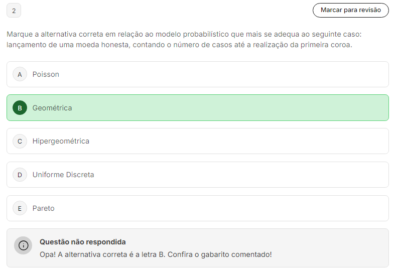 2 Marcar para revisão Marque a alternativa correta em relação ao modelo probabilístico que mais se adequa ao seguinte caso: lançamento de uma moeda honesta, contando o número de casos até a realização da primeira coroa. A Poisson Geométrica C Hipergeométrica D Uniforme Discreta E Pareto Questão não respondida Opa! A alternativa correta é a letra B. Confira gabarito comentado!