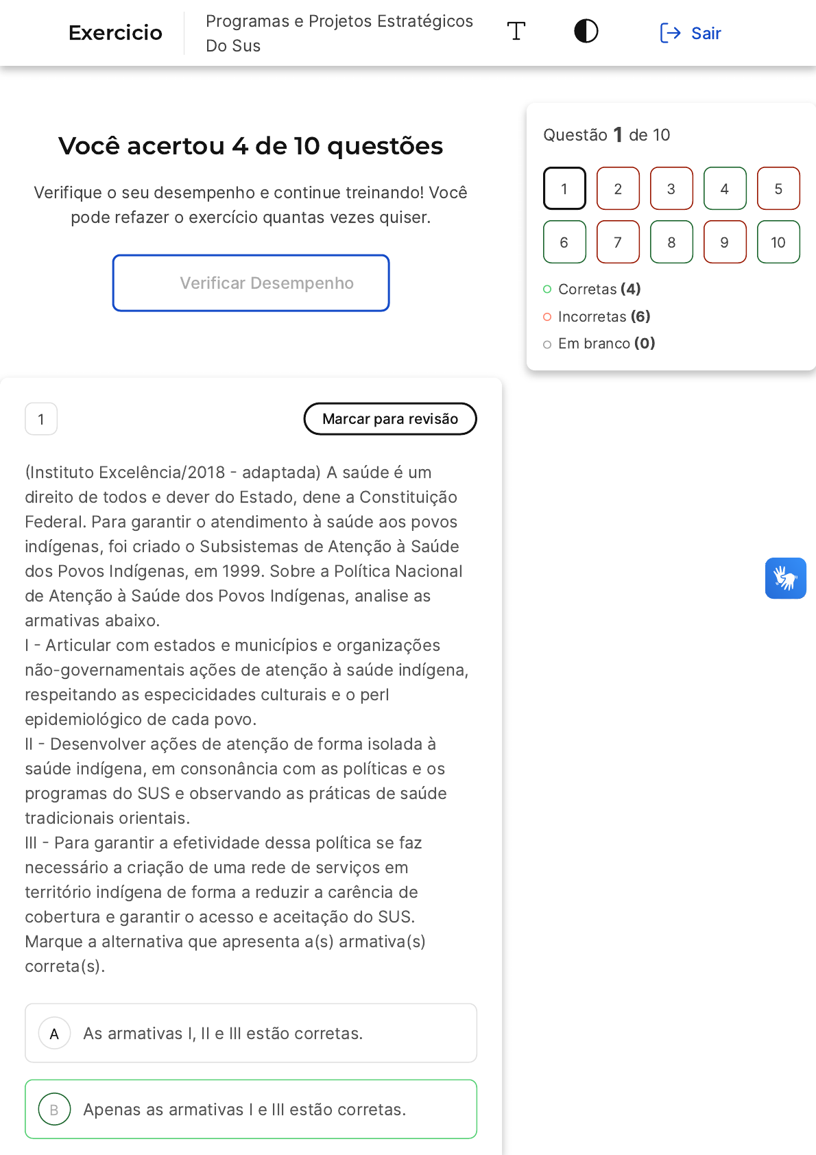 Você acertou 4 de 10 questões Verifique o seu desempenho e continue treinando! Você pode refazer o exercício quantas vezes quiser. Verificar Desempenho A B 1 Marcar para revisão �Instituto Excelência/2018 � adaptada) A saúde é um direito de todos e dever do Estado, dene a Constituição Federal. Para garantir o atendimento à saúde aos povos indígenas, foi criado o Subsistemas de Atenção à Saúde dos Povos Indígenas, em 1999. Sobre a Política Nacional de Atenção à Saúde dos Povos Indígenas, analise as armativas abaixo. I � Articular com estados e municípios e organizações não-governamentais ações de atenção à saúde indígena, respeitando as especicidades culturais e o perl epidemiológico de cada povo. II � Desenvolver ações de atenção de forma isolada à saúde indígena, em consonância com as políticas e os programas do SUS e observando as práticas de saúde tradicionais orientais. III � Para garantir a efetividade dessa política se faz necessário a criação de uma rede de serviços em território indígena de forma a reduzir a carência de cobertura e garantir o acesso e aceitação do SUS. Marque a alternativa que apresenta a(s) armativa(s) correta(s). As armativas I, II e III estão corretas. Apenas as armativas I e III estão corretas. Questão 1 de 10 Corretas �4� Incorretas �6� Em branco �0� 1 2 3 4 5 6 7 8 9 10 Exercicio Programas e Projetos Estratégicos Do Sus Sair C D E Apenas as armativas I e II estão corretas. Apenas as armativas II e III estão corretas. Apenas a armativa I está correta. Resposta incorreta Opa! A alternativa correta é a letra B. Confira o gabarito comentado! Gabarito Comentado RESPOSTA CORRETA� Apenas as armativas I e III estão corretas. 2 Marcar para revisão Conforme apontou levantamento realizado pelo Conselho Nacional de Secretários Estaduais de Saúde na década passada, mais de 50% dos brasileiros interrompem o tratamento devido à falta de dinheiro para comprar os remédios. O Programa Farmácia Popular do Brasil, desde 2004, alinha-se às outras ações governamentais, visando ao atendimento das necessidades da população brasileira. Em relação ao tema, assinale as afirmativas a seguir: I. A Farmácia Popular é uma política pública destinada, exclusivamente, ao atendimento dos usuários dos serviços públicos de saúde que têm dificuldades em adquirir medicamentos em estabelecimentos farmacêuticos comerciais. II. O principal objetivo do Farmácia Popular é diminuir o impacto nos gastos familiares com remédios, além da ampliação do acesso da população aos medicamentos essenciais. III. Para obter o remédio a baixo custo, o usuário deve demonstrar ter feito pesquisa de preços em, pelo menos, A B C D E 3 outros estabelecimentos comerciais. O preço de venda do medicamento na farmácia popular terá um desconto de 10% sobre o menor preço pesquisado. É correto o que se afirma, em: I e II, apenas. I e III, apenas. II e III, apenas. I, apenas. II, apenas. Resposta incorreta Opa! A alternativa correta é a letra E. Confira o gabarito comentado! Gabarito Comentado O programa Farmácia Popular é uma política pública destinada ao atendimento dos usuários dos serviços públicos de saúde que têm dificuldades em adquirir medicamentos em estabelecimentos farmacêuticos comerciais. Para ter acesso aos medicamentos fornecidos de forma gratuita ou com descontos pelo SUS é necessário ir a uma Unidade Básica de Saúde ou Farmácia Popular portando os documentos de identificação, comprovante de residência, receita médica e o cartão nacional de saúde, que pode ser feito na hora caso a pessoa não possua. A afirmativa II está correta. A B C D E 3 Marcar para revisão A exclusão do indivíduo pela falta de oportunidades e representatividade, podendo ocorrer por falta de emprego, renda, falta de moradia e saneamento, escolaridade, gênero, raça, orientação sexual ou até mesmo pela falta de um ambiente familiar caracteriza uma condição de vida que podemos descrever como: Equidade Vulnerabilidade Integralidade Descentralização Discriminação Resposta incorreta Opa! A alternativa correta é a letra B. Confira o gabarito comentado! Gabarito Comentado A condição de vida descrita no enunciado é caracterizada como vulnerabilidade. A vulnerabilidade é o estado ou qualidade de ser vulnerável, ou seja, a incapacidade de indivíduos, famílias ou grupos de enfrentar riscos existentes que impedem ou resultam na perda do bem-estar. As outras opções apresentadas não se aplicam ao contexto da questão. A equidade se refere ao atendimento aos indivíduos de acordo com suas necessidades, oferecendo mais a quem mais precisa e menos a quem requer menos cuidados. A integralidade é um princípio do Sistema Único de Saúde que busca garantir ao indivíduo uma A B C D E assistência à saúde que transcenda a prática curativa, contemplando o indivíduo em todos os níveis de atenção e considerando o sujeito inserido em um contexto social, familiar e cultural. A descentralização é a repartição de um poder que antes era absoluto. A discriminação é a conduta de transgredir o direito do outro. 4 Marcar para revisão Têm sido muitos os avanços do SUS, mas persistem problemas a serem enfrentados para consolidá-lo como um sistema público universal que possa prestar serviços de qualidade a toda a população brasileira. Esses problemas podem ser agrupados em torno de grandes desafios a superar. Sobre os desafios do SUS, marque a alternativa correta. Desafio de ampliar o tempo de espera na recepção. Desafio de reduzir os altos custos na aquisição e manutenção de equipamentos, assim como na compra de medicamentos. Desafio no modelo de atenção à saúde, procrastinar a produtividade dos profissionais da saúde. Desafio de reduzir o atendimento em prontos- socorros. Desafio de tornar o serviço público em um atendimento privado de qualidade e eficiência exem