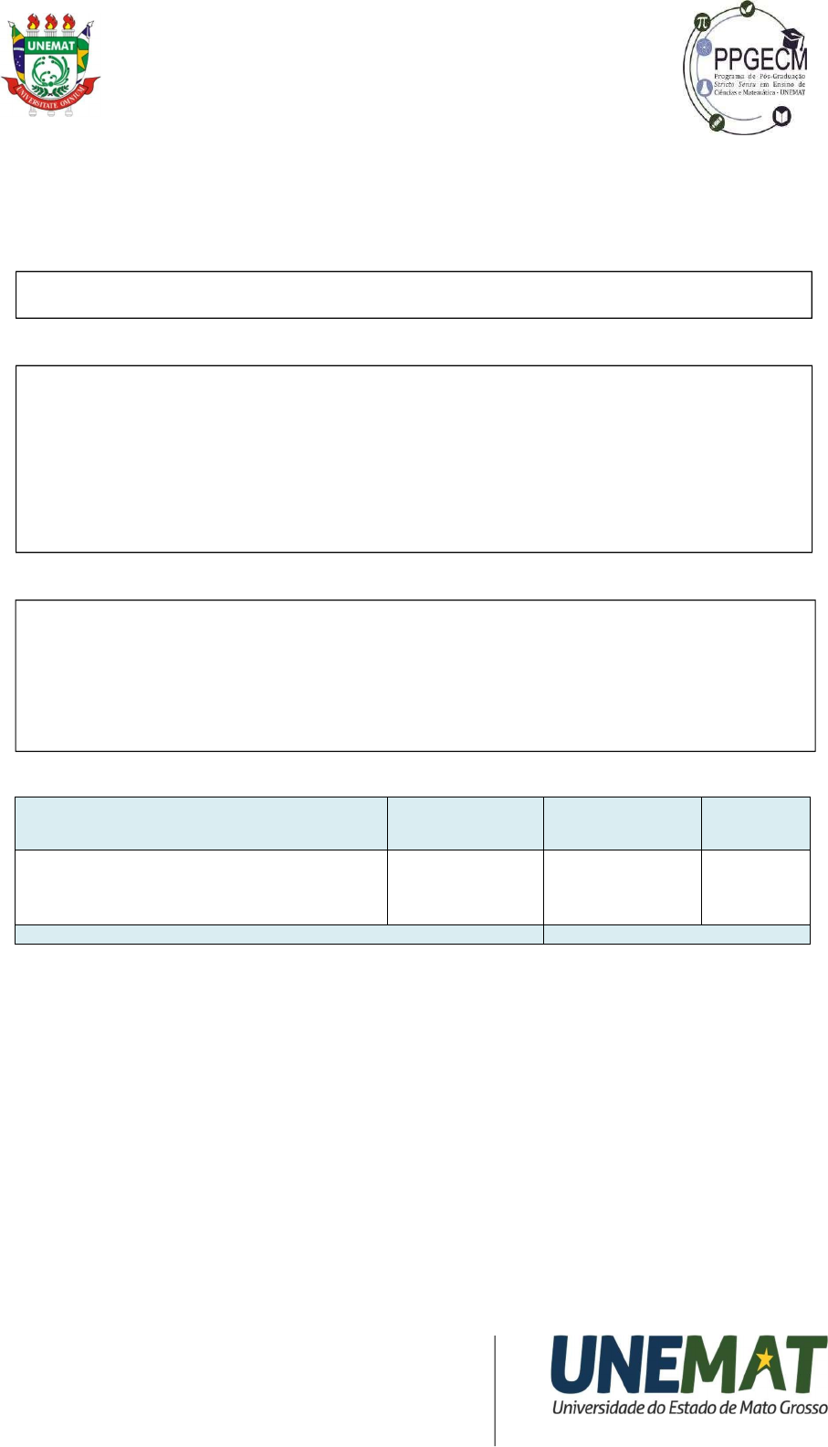 GOVERNO DO ESTADO DE MATO GROSSO SECRETARIADE ESTADODE CIÊNCIA, TECNOLOGIA E INOVAÇÃO UNIVERSIDADE DO ESTADO DE MATO GROSSO CARLOS ALBERTO REYESMALDONADO PRÓ-REITORIA DE PESQUISA E PÓS-GRADUAÇÃO PROGRAMADE PÓS-GRADUAÇÃOEMENSINODE CIÊNCIAS E MATEMÁTICA – PPGECM PROGRAMADE PÓS-GRADUAÇÃO STRICTO SENSU EMENSINO DE CIÊNCIAS E MATEMÁTICA – PPGECM Câmpus Universitário Dep. Est. “Renê Barbour” – Programa de Pós-Graduação Stricto Sensu em Ensino de Ciências e Matemática – PPGECM. Rua A, s/n, Bairro Cohab São Raimundo, CEP 78.390-000, Barra do Bugres-MT. Fone: (65) 3361-6465, e-mail: ppgecm@unemat.br DISCIPLINA ESTÁGIO EMDOCÊNCIA PLANO DE TRABALHO 1. IDENTIFICAÇÃODOS PROPONENTES Discente:Erenilda O. de Souza Orientadora:Sumaya Ferreira Guedes 2. IDENTIFICAÇÃODADISCIPLINA Nomeda Disciplina: Ensino de Português como primeira (L1) e segunda língua (L2) PROGRAMA DE PÓS-GRADUAÇÃO STRICTO SENSU EM ENSINO EM CONTEXTO INDÍGENA INTERCULTURAL Ano/ Semestre: 2024/1 Campus: Câmpus Universitário Dep. Est René Departamento: PPGECII Carga Horária: 60 horas Professora responsável pela disciplina: Cláudia Landin Negreiros 3. EMENTA DA DISCIPLINA Linguagem; Língua; Gêneros, ensinar a partir de textos de circulação social; Ensino a partir de textos de circulação social noções de autoria, leitura, escrita e oralidade; Produção de materiais específicos para escolas indígenas 4. ATIVIDADESA SEREMDESENVOLVIDAS E CRONOGRAMADE EXECUÇÃO DESCRIÇÃO TURMA CARGA HORÁRIA PERÍODO Auxiliar a professora no acompanhamento dos trabalhos dos mestrandos, dando explicações e esclarecimentos possíveis. PPGECII 60 horas Integral Carga Horária Total 60 horas 5. CRONOGRAMA mailto:ppgecm@unemat.br GOVERNO DO ESTADO DE MATO GROSSO SECRETARIADE ESTADODE CIÊNCIA, TECNOLOGIA E INOVAÇÃO UNIVERSIDADE DO ESTADO DE MATO GROSSO CARLOS ALBERTO REYESMALDONADO PRÓ-REITORIA DE PESQUISA E PÓS-GRADUAÇÃO PROGRAMADE PÓS-GRADUAÇÃOEMENSINODE CIÊNCIAS E MATEMÁTICA – PPGECM PROGRAMADE PÓS-GRADUAÇÃO STRICTO SENSU EMENSINO DE CIÊNCIAS E MATEMÁTICA – PPGECM Câmpus Universitário Dep. Est. “Renê Barbour” – Programa de Pós-Graduação Stricto Sensu em Ensino de Ciências e Matemática – PPGECM. Rua A, s/n, Bairro Cohab São Raimundo, CEP 78.390-000, Barra do Bugres-MT. Fone: (65) 3361-6465, e-mail: ppgecm@unemat.br 23/07/2024 (Manhã) APRESENTAÇÃODA PROFESSORA E DO PROGRAMA DADISCIPLINA. Leitura do Capítulo: Concepções de Linguagem Leitura do RCNEI – LÍNGUAS (p. 111- 153) – discussão Leitura dos artigos no livro: Ensino de línguas e educação escolar indígena. Divisão dos grupos para apresentação (oito grupos). (Tarde) Laboratório de informática – slides de apresentação 24/07/2024 (Manhã) Apresentação grupos – livro ensinode línguas (tarde) Língua e literatura divisão dos grupos; livros de língua e literatura indígena (oito grupos). 25/07/2024 (Manhã/tarde) Oficina de produção de vídeos – gêneros digitais – Laboratório de informática. 26/07/2024 (Manhã) Apresentação grupos Língua e Literatura (Tarde) Grupos – 10 artigos – duplas – Laboratório de Informática. 29/07/2024 Apresentação das duplas – artigos da Revista Taka’a 30/07/2024 (Manhã) Live com o professor Alceu Zoia - Produção de materiais específicos para escolas indígenas (Tarde) – produção de materiais. Proposta de elaboração de material didático – gruposMaterial de ilustração Apresentação - vídeos mailto:ppgecm@unemat.br GOVERNO DO ESTADO DE MATO GROSSO SECRETARIADE ESTADODE CIÊNCIA, TECNOLOGIA E INOVAÇÃO UNIVERSIDADE DO ESTADO DE MATO GROSSO CARLOS ALBERTO REYESMALDONADO PRÓ-REITORIA DE PESQUISA E PÓS-GRADUAÇÃO PROGRAMADE PÓS-GRADUAÇÃOEMENSINODE CIÊNCIAS E MATEMÁTICA – PPGECM PROGRAMADE PÓS-GRADUAÇÃO STRICTO SENSU EMENSINO DE CIÊNCIAS E MATEMÁTICA – PPGECM Câmpus Universitário Dep. Est. “Renê Barbour” – Programa de Pós-Graduação Stricto Sensu em Ensino de Ciências e Matemática – PPGECM. Rua A, s/n, Bairro Cohab São Raimundo, CEP 78.390-000, Barra do Bugres-MT. Fone: (65) 3361-6465, e-mail: ppgecm@unemat.br 6. BIBLIOGRAFIA BÁSICA ANDRADE, Carlos; ALEXANDRE, Silvio (Orgs.). Prática de escrita: histórias em quadrinhos. São Paulo: Labmind Editora, Selo Terracota, 2008. BAKHTIN, Mikhail. Os gêneros do discurso. In: BAKHTINMikhail. (1979). Estética da criação verbal. Trad. Paulo Bezerra. São Paulo: Martins Fontes, 2000, p. 261-306. BRASIL. Ministério da Cultura e do Desporto. Referencial Curricular Nacional para as Escolas Indígenas. Brasília: MEC, 1998. Disponível em: http://www.dominiopublico.gov.br/download/texto/me002078.pdf MAHER, Tereza Machado. O Ensino de Língua Portuguesa nas Escolas Indígenas. Em aberto. Brasília: ano 14, n° 63, pp. 69-77, jul. /set. 1994. Disponível em: http://emaberto.inep.gov.br/ojs3/index.php/emaberto/article/view/2284/2023 MAIA, Marcus. Manual de Linguística: subsídios para a formação de professores Indígenas na área de linguagem. Brasília: Edições MEC/UNESCO. Ministério da Educação, Secretaria de Educação Continuada. Alfabetização e Diversidade; LACED/Museu Nacional, 2006. Disponível em:http://portal.mec.gov.br/index.php?option=com_docman&view=download&alias=646- vol15vias04web-pdf&Itemid=30192 MARCUSCHI, Luiz Antônio. Da fala para a escrita: atividades de retextualização. 2 ed. São Paulo: Cortez, 2001. MESQUITA, RobertoMelo. MARTOS, Cloder Rivas. Gramática Pedagógica. São Paulo: Editora Saraiva, 2009. MONTE, Nietta Lindenberg. Escolas da floresta: entre o passado oral e o presente letrado; diários de classe de professores Kaxinawá. Rio de Janeiro: Multiletra, 1996. ORLANDI, Eni Puccinelli. Interpretação: autoria, leitura e efeito do trabalho simbólico. 5 ed.Campinas-SP: Pontes Editores, 2007. OLIVEIRA, GilvanMüller de. Política linguística e internacionalização: a língua portuguesa no mundo globalizado 