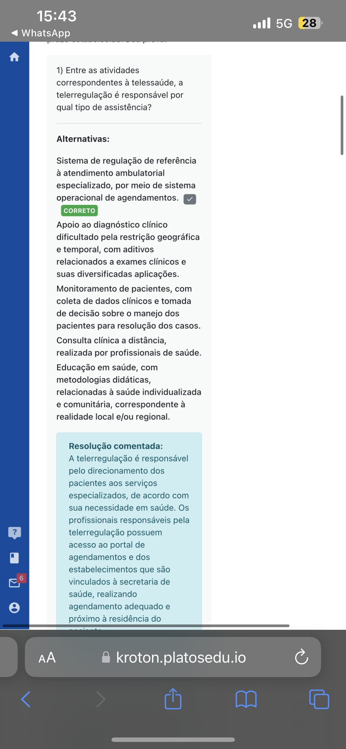15:43 5G 28 WhatsApp 1) Entre as atividades correspondentes à telessaúde, a telerregulação é responsável por qual tipo de assistência? Alternativas: Sistema de regulação de referência à atendimento ambulatorial especializado, por meio de sistema operacional de agendamentos. CORRETO Apoio ao diagnóstico clínico dificultado pela restrição geográfica e temporal, com aditivos relacionados a exames clínicos e suas diversificadas aplicações. Monitoramento de pacientes, com coleta de dados clínicos e tomada de decisão sobre o manejo dos pacientes para resolução dos casos. Consulta clínica a distância, realizada por profissionais de saúde. Educação em saúde, com metodologias didáticas, relacionadas à saúde individualizada e comunitária, correspondente à realidade local e/ou regional. Resolução comentada: A telerregulação é responsável pelo direcionamento dos pacientes aos serviços especializados, de acordo com sua necessidade em saúde. Os profissionais responsáveis pela ? telerregulação possuem acesso ao portal de agendamentos e dos estabelecimentos que são 6 vinculados à secretaria de saúde, realizando agendamento adequado e próximo à residência do AA kroton.platosedu.io