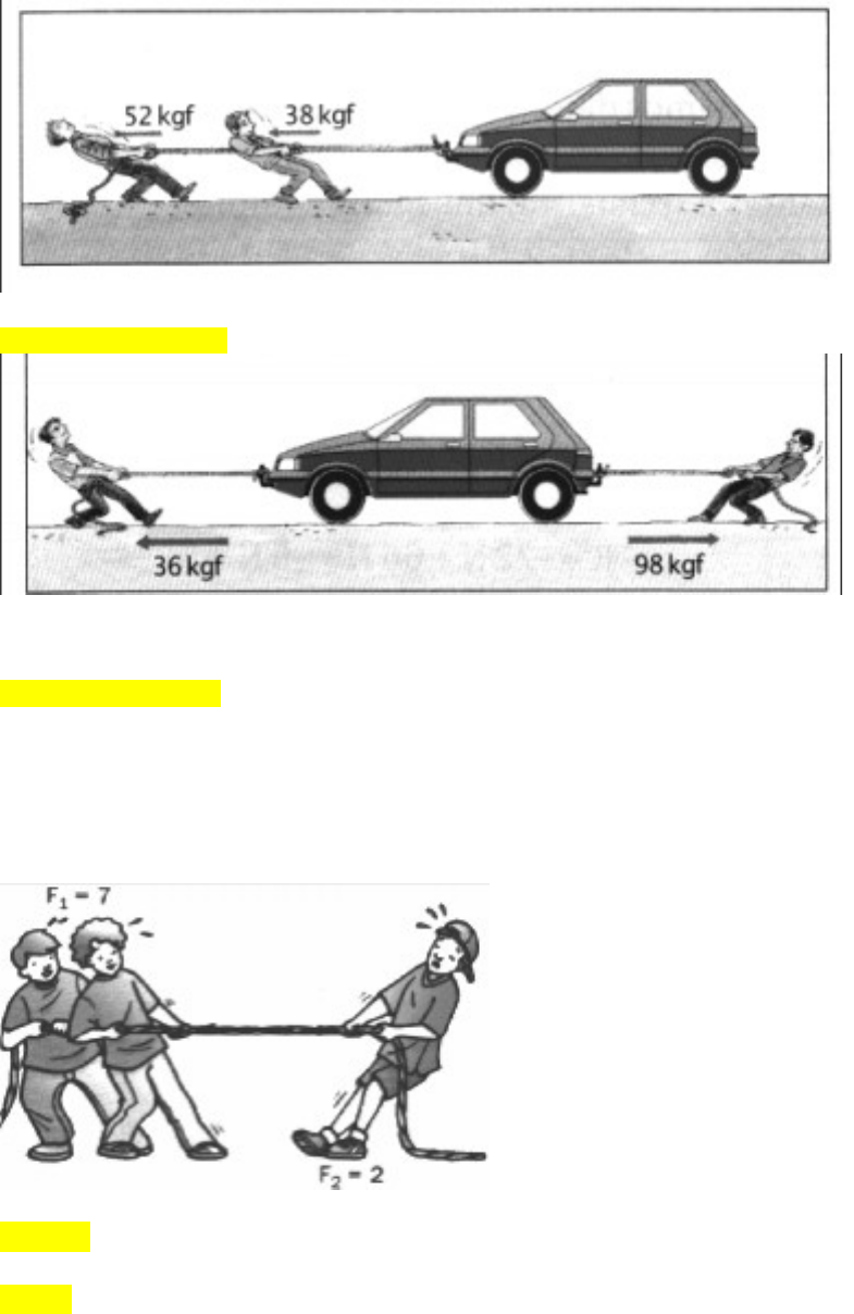 1. Calcule o vetor resultante nas situações abaixo: F= 52 + 38 = 90 kgf F= 98 - 36 = 62 kgf 02. A figura representa três crianças brincando de cabo de guerra, sendo que duas crianças juntas puxam a corda para a esquerda com uma força F1 = 7 N e a outra aplica uma força de F2 = 2 N. Determine a intensidade da força resultante. F= 7 - 2 F= 5N 03. A figura mostra dois cavalos puxando uma carroça no mesmo sentido com uma intensidade de 10 N cada, assim, a intensidade da força resultante é: F= 10+10 = 20n 04. Determine a intensidade da força resultante na figura abaixo. F= 60 - 15 = 45 F= 40 - 5 = 35 F= 35 + 45 = 80N 05. Determine a resultante de dois vetores ortogonais, isto é, perpendiculares entre si, um de módulo 12 e outro de módulo 16. V1= 12 V2 = 16 R= 12.12 + 16.16 R= 144+ 256 R= 400 R = R= 20 06. Uma partícula desloca-se 3 km para leste e em seguida 4 km para o sul. O módulo do deslocamento resultante é: a) 7 km b) 5 km c) 1 km d) 12 km e) 15 Km R= 3.3 + 4.4 R=R= 5 07. Na figura a seguir estão desenhados dois vetores (X e Y). Esses vetores representam deslocamentos sucessivos de um corpo. Represente graficamente e determine o módulo do vetor resultante. hip² = cat²a + cat²b hip² = 3² + 4² hip² = 9 + 16 hip² = 25 hip = 5 08. Duas partículas, A e B, deslocam-se com velocidades de 4m/s e 3 m/s, respectivamente. Represente o vetor resultante e calcule seu módulo nos casos: a- Os vetores estão na mesma direção (horizontal) e mesmo sentido (para a direita). Nesse caso, a soma vetorial é simples: basta somar os módulos. Portanto, o vetor resultante tem módulo 7 m/s e sete quadradinhos (pois é a soma dos dois vetores) para a direita. b- Os vetores estão na mesma direção (horizontal), porém em sentidos contrários... então precisamos subtraí-los. Ou seja, o módulo do vetor resultante é 1 m/s, apontando para a direita. c- Já que os vetores fazem 90º entre si, o vetor resultante é a hipotenusa de um triângulo retângulo: Vr² = 4² + 3² Vr² = 16 + 9 Vr² = 25 Vr = raiz de 25 Vr = 5 m/s 9. Determine o módulo e represente, através de um vetor, a força resultante do sistema de forças. 5 N 3 N 3N 4 N 2 N 09t58 10. Determine o módulo e represente, através de um vetor, a força resultante do sistema de forças. 10 N 5N 4N 7 N 4 N 11. Uma grandeza física vetorial fica perfeitamente definida quando dela se conhecem a) valor numérico, desvio e unidade. b) valor numérico, desvio, unidade e direção. c) valor numérico, desvio, unidade e sentido. d) valor numérico, unidade, direção e sentido. e) desvio, direção, sentido e unidade. 12. Quando dizemos que a velocidade de uma bola é de 20m/s, horizontal e para a direita, estamos definindo a velocidade como uma grandeza: a) escalar. b)algébrica. c)linear. d)vetorial. e)n.d.a. 13. Uma pessoa para dar um passeio pela cidade, faz o seguinte percurso: sai de casa e anda 2 quarteirões para o norte; logo após, dobrar à esquerda ela anda mais 3 quarteirões para oeste, virando a seguir, novamente à esquerda e andando mais 2 quarteirões para o Sul. Sabendo que um quarteirão mede 100m, determine o deslocamento da pessoa. 14. A intensidade da resultante entre duas forças concorrentes, perpendiculares entre si, é de 7,5N. Sendo a intensidade de uma força igual a 60N, calcule a intensidade da outra. image9.png image10.png image11.png image12.png image13.png image14.png image15.png image16.png image17.png image18.png image1.png image19.png image2.png image3.png image4.png image5.png image6.png image7.png image8.png