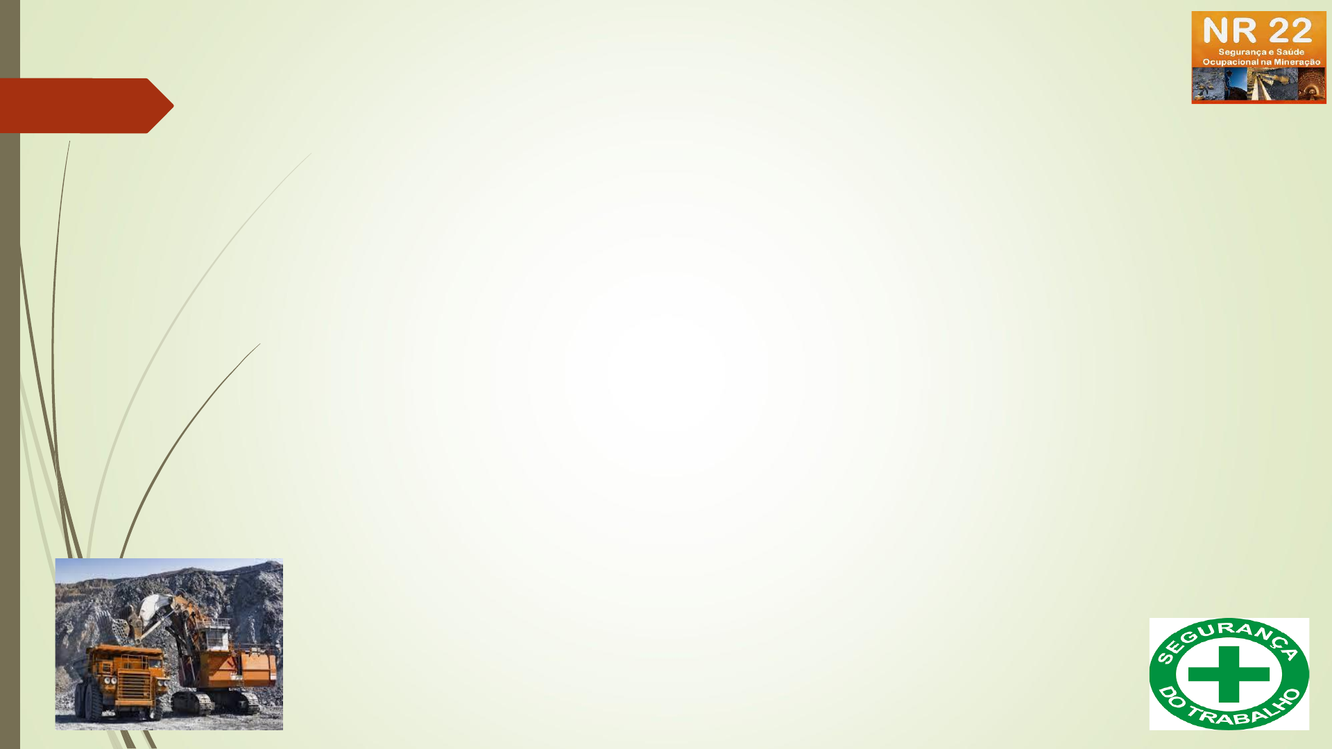 NORMA REGULAMENTADORA 22 SEGURANÇA E SAÚDE OCUPACIONAL NA MINERAÇÃO 22.11 Máquinas, Equipamentos, Ferramentas e Instalações 22.11.20 É proibido fazer manutenção, inspeção e reparos de qualquer equipamento ou máquinas sustentados somente por sistemas hidráulicos. 22.11.21 Nas atividades de montagem e desmontagem de pneumáticos das rodas devem ser observadas as seguintes condições: a) os pneumáticos devem ser completamente esvaziados, removendo o núcleo da válvula de calibragem antes da desmontagem, remoção do eixo ou reparos em que não haja necessidade de sua retirada; b) o enchimento de pneumáticos só poderá ser executado dentro de dispositivo de clausura até alcançar uma pressão suficiente para forçar o talão sobre o aro e criar uma vedação pneumática. c) o dispositivo de clausura citado na alínea “b” deve suportar o impacto de um aro de um pneumático com cento e cinqüenta por cento da pressão máxima especificada.