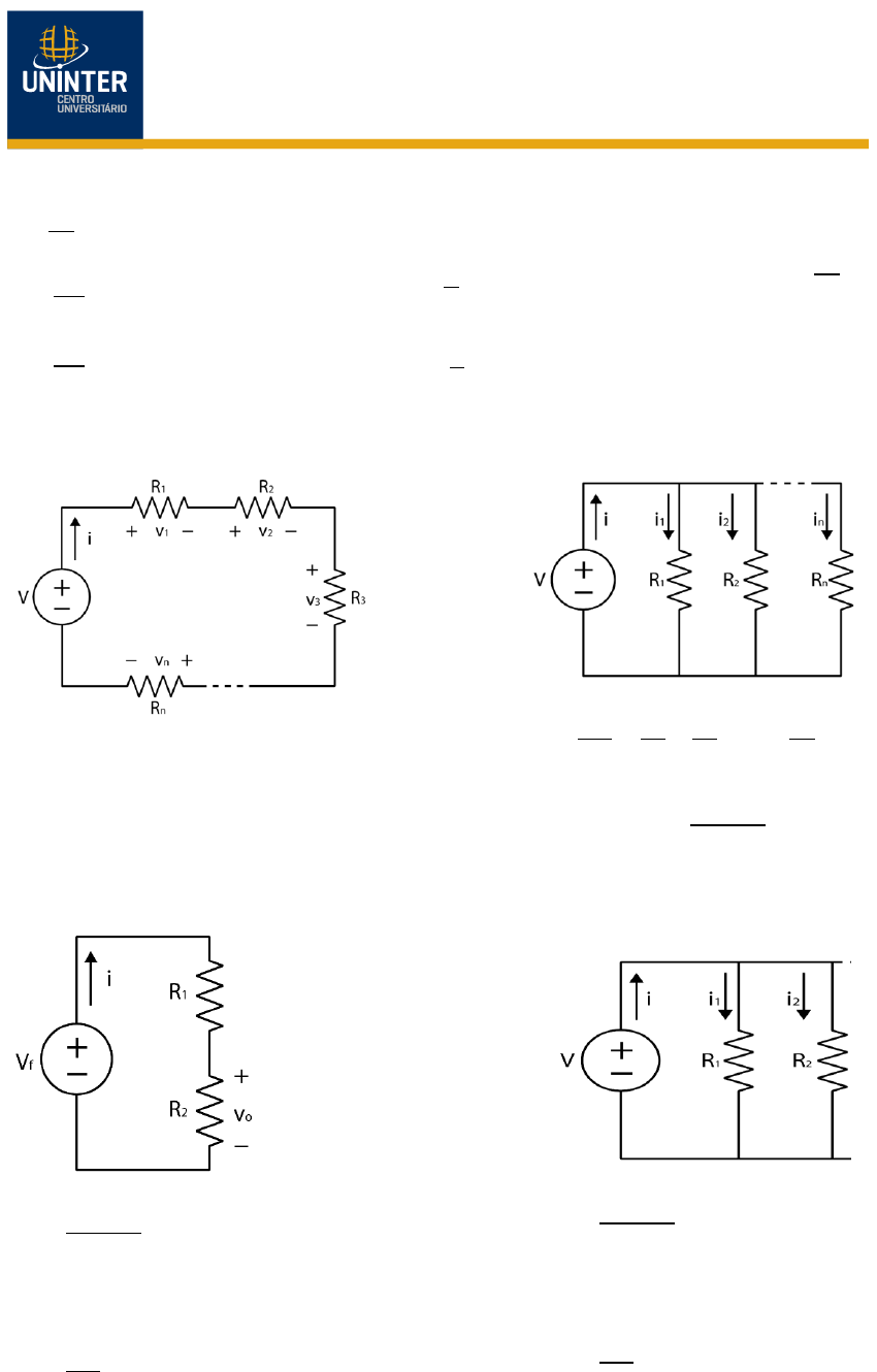 FORMULÁRIO DE ELETRICIDADE Grandezas Elétricas: 𝑖 = 𝑑𝑞 𝑑𝑡 𝑣 = 𝑑𝑤 𝑑𝑞 𝑝 = 𝑑𝑤 𝑑𝑡 Lei de Ohm: 𝑉 = 𝑅. 𝐼 𝐼 = 𝑉 𝑅 𝑅 = 𝑉 𝐼 Potência: 𝑃 = 𝑉. 𝐼 𝑃 = 𝑉2 𝑅 𝑃 = 𝑅. 𝐼2 Resistores em série: 𝑅𝑒𝑞 = 𝑅1 + 𝑅2 + 𝑅3 +⋯+ 𝑅𝑛 Resistores em paralelo: 1 𝑅𝑒𝑞 = 1 𝑅1 + 1 𝑅2 +⋯+ 1 𝑅𝑛 𝑅𝑒𝑞 = 𝑅1. 𝑅2 𝑅1 + 𝑅2 Divisor de tensão: 𝑣𝑂 = 𝑅2 𝑅1 + 𝑅2 ∙ 𝑉𝑓 Ou 𝑣𝑂 = 𝑅2 𝑅𝑒𝑞 ∙ 𝑉𝑓 Divisor de Corrente: 𝑖2 = 𝑅1 𝑅1 + 𝑅2 . 𝑖 Ou 𝑖2 = 𝑅𝑒𝑞 𝑅2 . 𝑖 FORMULÁRIO DE ELETRICIDADE Transformação Δ-Y 𝑅𝐴 = 𝑅1𝑅2 𝑅1 + 𝑅2 + 𝑅3 𝑅𝐵 = 𝑅1𝑅3 𝑅1 + 𝑅2 + 𝑅3 𝑅𝐶 = 𝑅2𝑅3 𝑅1 + 𝑅2 + 𝑅3 Transformação Y-Δ 𝑅1 = 𝑅𝐴𝑅𝐵 + 𝑅𝐴𝑅𝐶 + 𝑅𝐵𝑅𝐶 𝑅𝐶 𝑅2 = 𝑅𝐴𝑅𝐵 + 𝑅𝐴𝑅𝐶 + 𝑅𝐵𝑅𝐶 𝑅𝐵 𝑅3 = 𝑅𝐴𝑅𝐵 + 𝑅𝐴𝑅𝐶 + 𝑅𝐵𝑅𝐶 𝑅𝐴 Capacitores: 𝑞 = 𝐶. 𝑉 𝑖𝑐 = 𝐶. 𝑑𝑣 𝑑𝑡 𝑣𝑐 = 1 𝐶 ∫ 𝑖 𝑑𝑡 𝑡 𝑡0 + 𝑣(𝑡0) 𝜔(𝑡) = 1 2 𝐶. 𝑣(𝑡) 2 Indutores 𝐿 = 𝜇. 𝑁2. 𝐴 𝑙 𝑣𝐿 = 𝐿. 𝑑𝑖𝐿 𝑑𝑡 𝑖𝐿 = 1 𝐿 ∫ 𝑣(𝑡) 𝑑𝑡 𝑡 𝑡0 + 𝑖(𝑡0) 𝜔(𝑡) = 1 2 𝐿. 𝑖(𝑡) 2 Associação de capacitores em série: 1 𝐶𝑒𝑞 = 1 𝐶1 + 1 𝐶2 +⋯+ 1 𝐶𝑛 Associação de capacitores em paralelo: 𝐶𝑒𝑞 = 𝐶1 + 𝐶2 +⋯+ 𝐶𝑛 Associação de indutores em série: 𝐿𝑒𝑞 = 𝐿1 + 𝐿2 +⋯+ 𝐿𝑛 Associação de indutores em paralelo: 1 𝐿𝑒𝑞 = 1 𝐿1 + 1 𝐿2 +⋯+ 1 𝐿𝑛 FORMULÁRIO DE ELETRICIDADE Circuito RC – Resposta natural: 𝑣(𝑡) = 𝑉0 𝑒−𝑡 𝑅𝐶⁄ 𝜏 = 𝑅𝐶 Circuito RC - Resposta forçada: *Capacitor inicialmente descarregado 𝑣(𝑡) = { 𝑉0 𝑉𝑆 + (𝑉0 − 𝑉𝑆)𝑒 −𝑡 𝜏⁄ , ∀ 𝑡 < 0 , ∀ 𝑡 > 0 Equação geral: 𝑣𝐶 (𝑡) = 𝑣𝐶 (∞) + [𝑣𝐶 (0) − 𝑣𝐶 (∞)] 𝑒 −𝑡 𝜏⁄ Circuito RL – Resposta natural: 𝑖(𝑡) = 𝑖0 𝑒−𝑡𝑅 𝐿⁄ 𝜏 = 𝐿 𝑅 Circuito RL – Resposta forçada 𝑖𝐿(𝑡) = { 𝑖0 𝑉𝑆 𝑅 + (𝑖0 − 𝑉𝑆 𝑅 )𝑒−𝑡 𝜏⁄ , ∀ 𝑡 < 0 , ∀ 𝑡 > 0 Equação geral: 𝒊𝑳 (𝒕) = 𝒊𝑳 (∞) + [𝒊𝑳 (𝟎) − 𝒊𝑳 (∞)] 𝒆 −𝒕 𝝉⁄ FORMULÁRIO DE ELETRICIDADE Circuito RLC série – Resposta natural: Condições iniciais: { 𝑖(0) = 𝑖0 𝑣(0) = 1 𝐶 ∫ 𝑖 𝑑𝑡 0 −∞ = 𝑣0 𝑑2𝑖 𝑑𝑡2 + 𝑅 𝐿 𝑑𝑖 𝑑𝑡 + 1 𝐿𝐶 𝑖 = 0 𝑆2 + 𝑅 𝐿 𝑆 + 1 𝐿𝐶 = 0 𝑆1 = −𝛼 + √𝛼 2 −𝜔0 2 𝑆2 = −𝛼 − √𝛼 2 −𝜔0 2 𝛼 = R 2𝐿 𝜔0 = 1 √𝐿𝐶 Superamortecido (𝛼 > 𝜔0) 𝑖(𝑡) = 𝐴1𝑒 𝑆1𝑡 + 𝐴2 𝑒 𝑆2𝑡 Criticamente amortecido (𝛼 = 𝜔0) 𝑖(𝑡) = (𝐴1 + 𝐴2𝑡)𝑒 −𝛼𝑡 Subamortecido (𝛼 < 𝜔0) 𝑆1 = −𝛼 + √−(𝜔0 2 − 𝛼2) = −𝛼 + 𝑗𝜔𝑑 𝑆2 = −𝛼 − √−(𝜔0 2 − 𝛼2) = −𝛼 − 𝑗𝜔𝑑 𝜔𝑑 = √𝜔0² − 𝛼² 𝑖(𝑡) = (𝐴1. 𝑒 𝑗𝜔𝑑𝑡 + 𝐴2. 𝑒 −𝑗𝜔𝑑𝑡). 𝑒−𝛼𝑡 𝑖(𝑡) = [(𝐴1. 𝐶𝑜𝑠(𝜔𝑑 . 𝑡) + 𝐴2. 𝑆𝑒𝑛(𝜔𝑑 . 𝑡)]. 𝑒 −𝛼𝑡 Circuito RLC série – Resposta forçada: 𝑑2𝑣 𝑑𝑡2 + 𝑅 𝐿 𝑑𝑣 𝑑𝑡 + 𝑣 𝐿𝐶 = 𝑉𝑠 𝐿𝐶 𝑆1 = −𝛼 + √−(𝜔0 2 − 𝛼2) = −𝛼 + 𝑗𝜔𝑑 𝑆2 = −𝛼 − √−(𝜔0 2 − 𝛼2) = −𝛼 − 𝑗𝜔𝑑 𝛼 = R 2𝐿 𝜔0 = 1 √𝐿𝐶 Superamortecido (𝛼 > 𝜔0) 𝑣(𝑡) = 𝑉𝑆 + 𝐴1𝑒 𝑆1𝑡 + 𝐴2𝑒 𝑆2𝑡 Criticamente amortecido (𝛼 = 𝜔0) 𝑣(𝑡) = 𝑉𝑆 + (𝐴1 + 𝐴2𝑡)𝑒 −𝛼𝑡 Subamortecido (𝛼 < 𝜔0) 𝑣(𝑡) = 𝑉𝑆 + [𝐴1𝐶𝑜𝑠(𝜔𝑑𝑡) + 𝐴2𝑆𝑒𝑛(𝜔𝑑𝑡)]. 𝑒 −𝛼𝑡 𝜔𝑑 = √𝜔0² − 𝛼² FORMULÁRIO DE ELETRICIDADE Circuito RLC Paralelo – Resposta Natural Condições iniciais: { 𝑣(0) = 𝑣0 𝑖(0) = 1 𝐿 ∫ 𝑣 𝑑𝑡 0 −∞ = 𝑖0 𝑑2𝑣 𝑑𝑡2 + 1 𝑅𝐶 𝑑𝑣 𝑑𝑡 + 𝑣 𝐿𝐶 = 0 𝑆² + 1 𝑅𝐶 𝑆 + 1 𝐿𝐶 = 0 𝑆1 = −𝛼 + √𝛼 2 −𝜔0 2 𝑆2 = −𝛼 −√𝛼² − 𝜔0² 𝛼 = 1 2𝑅𝐶 𝜔0 = 1 √𝐿𝐶 Superamortecido (𝛼 > 𝜔0) 𝑣(𝑡) = 𝐴1𝑒 𝑆1𝑡 + 𝐴2𝑒 𝑆2𝑡 Criticamente amortecido (𝛼 = 𝜔0) 𝑣(𝑡) = (𝐴2 + 𝐴1𝑡)𝑒 −𝛼𝑡 Subamortecido (𝜶 < 𝝎𝟎) 𝑆1 = −𝛼 + √−(𝜔0 2 − 𝛼2) = −𝛼 + 𝑗𝜔𝑑 𝑆2 = −𝛼 − √−(𝜔0 2 − 𝛼2) = −𝛼 − 𝑗𝜔𝑑 𝜔𝑑 = √𝜔0² − 𝛼² 𝑣(𝑡) = 𝑒 −𝛼𝑡[𝐴1𝐶𝑜𝑠(𝜔𝑑𝑡) + 𝐴2𝑆𝑒𝑛(𝜔𝑑𝑡)] Circuito RLC paralelo – Resposta forçada: 𝑑2𝑖 𝑑𝑡2 + 1 𝑅𝐶 𝑑𝑖 𝑑𝑡 + 1 𝐿𝐶 𝑖 = 𝑖𝑆 𝐿𝐶 𝑆1 = −𝛼 + √−(𝜔0 2 − 𝛼2) = −𝛼 + 𝑗𝜔𝑑 𝑆2 = −𝛼 − √−(𝜔0 2 − 𝛼2) = −𝛼 − 𝑗𝜔𝑑 𝛼 = 1 2𝑅𝐶 𝜔0 = 1 √𝐿𝐶 Superamortecido (𝛼 > 𝜔0) 𝑖(𝑡) = 𝑖𝑆 + 𝐴1𝑒 𝑆1𝑡 + 𝐴2𝑒 𝑆2𝑡 Criticamente amortecido (𝛼 = 𝜔0) 𝑖(𝑡) = 𝑖𝑆 + (𝐴1 + 𝐴2𝑡). 𝑒 −𝛼𝑡 Subamortecido (𝛼 < 𝜔0) 𝑖(𝑡) = 𝑖𝑆 + [𝐴1𝐶𝑜𝑠(𝜔𝑑𝑡) + 𝐴2𝑆𝑒𝑛(𝜔𝑑𝑡)]. 𝑒 −𝛼𝑡 𝜔𝑑 = √𝜔0² − 𝛼² FORMULÁRIO DE ELETRICIDADE Senóides e fasores: 𝑣(𝑡) = 𝑉𝑚 𝑆𝑒𝑛(𝜔𝑡 + 𝜙) �̇� = 𝑉𝑚 𝑒 𝑗𝜙 �̇� = 𝑉𝑚∠𝜙 𝜔 = 2𝜋𝑓 𝑇 = 2𝜋 𝜔 = 1 𝑓 𝑍 = 𝑅 ± 𝑗𝑋 𝑍 = |𝑍|∠𝜃 { |𝑍| = √𝑅 