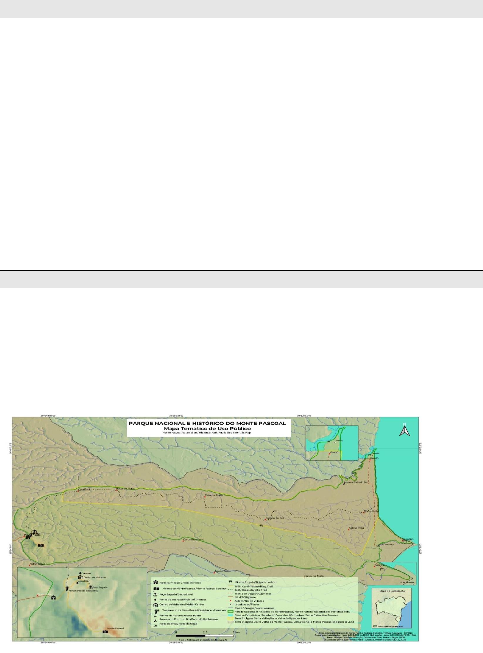 RELATÓRIO TÉCNICO DE APOIO EM UNIDADE DE CONSERVAÇÃO Nome da unidade de conservação: Parque Nacional e Histórico do Monte Pascoal Estado: Bahia Bairro: Taperapuã Cidade: Porto Seguro Coordenada geográfica: 16° 51' 51" S 39° 16' 15" O Representante legal: Nome: O Parque Nacional e Histórico do Monte Pascoal é de responsabilidade federal e tem como objetivo proteger os ecossistemas naturais e conservar os últimos remanescentes da Mata Atlântica do nordeste. O Parque Nacional do Monte Pascoal é de responsabilidade federal e tem como objetivo proteger os ecossistemas naturais e conservar os últimos remanescentes da Mata Atlântica do Nordeste. I. INFORMAÇÕES SOBRE A UNIDADE DE CONSERVAÇÃO II. CARACTERÍSTICAS GERAIS DECRETO N° 242, DE 29 DE NOVEMBRO DE 1961 Cria o Parque Nacional do Monte Pascoal e dá outras providências. Art. 1º Fica criado no Estado da Bahia, abrangendo terras do Município de Pôrto Seguro, o Parque Nacional do Monte Pascoal (P.N.M.P.), subordinado ao Serviço Florestal do Ministério da Agricultura. Art. 4º As terras, a flora, a fauna e as belezas naturais, constitutivas do Parque, inclusive propriedades públicas e particulares por eles abrangidas, ficam desde logo, sujeitas ao Regime estabelecido pelo Código Florestal vigente. Portaria 102 Cria o Conselho Consultivo do Parque Nacional e Histórico do Monte Pascoal/BA Portaria s/n Instrumento de gestão - plano de manejo. Decreto 12.729 Cria o Parque Monumento Nacional de Monte Pascoal, com prerrogativas de monumento nacional, e dá outras providências. O Parque fica diretamente subordinado à Secretaria da Agricultura, Indústria e Comércio, que exercerá os trabalhos administrativos e de fiscalização por intermédio do Departamento de Terras e Proteção da Natureza. Portaria 265 Portaria 291 Decreto 3421 Altera a denominação do Parque Nacional do Monte Pascoal e institui Grupo Assessor, composto por representantes dos ministérios do Meio Ambiente, da Cultura e da Justiça, sob a presidência do primeiro, para definir estratégia de articulação das atividades de interesse comum a esses três Ministérios, relativas ao Parque Nacional e Histórico do Monte Pascoal. Portaria 908 O Ministro da Justiça e a Ministra do Meio Ambiente, em Portaria interministerial resolvem: Art. 1o Instituir GT com a finalidade de elaborar, escolher e implementar planos, programas e projetos, acompanhamento técnico, captação de recursos e supervisão da prestação de contas relacionados com o desenvolvimento do modelo de gestão ambiental participativa do Parque Nacional Monte Pascoal e terras indígenas no seu entorno. O Parque Nacional e Histórico do Monte Pascoal, localizado no município de Porto Seguro/BA, (recebeu este nome por ter sido visto na época de Páscoa do ano de 1500), é um marco para a história nacional, pois abrange a primeira porção de terras do Brasil avistada pelos navegadores portugueses. Por ter sido a região ocupada nas primeiras décadas da colonização portuguesa, é o primeiro e único Parque Nacional e Histórico brasileiro. Criado em 1961 com 22.240,67 hectares, (o embasamento legal para sua criação é o artigo 5° do Código Florestal Brasileiro - Lei n° 4.771 de 15 de setembro de 1965), o Parque além de fazer parte do Patrimônio Mundial Natural da UNESCO da Costa do Descobrimento e possuir uma área natural abrangendo a Mata Atlântica, restinga, alagados e mangues e uma vasta vegetação nacional como pau-brasil, maçaranduba e jatobás, fica diretamente subordinado à Secretaria da Agricultura, Indústria e Comércio, que exercerá os trabalhos administrativos e de fiscalização por intermédio do Departamento de Terras e Proteção da Natureza. O Parque Nacional e Histórico do Monte Pascoal possui sobreposição territorial com a Terra Indígena, por ter a presença de indígenas da etnia Pataxó desde antes de seu decreto de criação. O Parque pode ser dividido em dois setores: • Setor florestal; É uma área do Parque com trilhas. • Setor litorâneo; Área reservada para passeios de buggys, para conhecer as lindas praias e visitar as aldeias pataxó. A fauna do parque chama atenção pela presença de grandes predadores como a onça-pintada e a onça-parda, além de outros grandes mamíferos, como a anta, muito ameaçados nas florestas do sul da Bahia. O clima da região do parque é úmido e super úmido, tropical e subtropical, apresentando uma temperatura média de 21°C com máximas de 38°C. A umidade relativa do ar fica em média de 80% durante todo ano. O Plano de Manejo do Parque, que foi elaborado em 1979, por técnicos do antigo IBDF, estabeleceu os seguintes objetivos: a) Conservar uma amostra representativa dos ecossistemas de transição entre o litoral e a floresta; b) Conservar em estado natural o Monte Pascoal; c) Conservar os recursos genéticos; d) Administrar os serviços recreativos compatíveis com os demais objetivos do parque; e) Possibilitar e fomentar atividades de educação e investigação compatíveis com os objetivos do parque. Um dos problemas do parque é a ocorrência de incêndios, principalmente nos meses de julho a setembro. Nos dias 22 e 23 de fevereiro de 2024, o Instituto Chico Mendes iniciou as primeiras tratativas para a revisão do Plano de Manejo do Parque Nacional e Histórico do Monte Pascoal. Foi destacado a importância do diálogo com a comunidade indígena Pataxó, na revisão do planejamento da unidade de conservação. O consentimento do Conselho dos Caciques foi obtido para a realização de oficinas nas aldeias, visando reunir informações cruciais para a revisão do Plano de Manejo e a elaboração de um Plano Específico para a área de sobreposição. A paisagem do Parque Nacional e Histórico Monte Pascoal é formada por Floresta Ombrófila Densa, Manguezais, Restingas, praias litorâneas, praias fluviais dos rios Caraíva e Corumbau, e Mussununga (fitofisionomia endêmica do extremo sul d