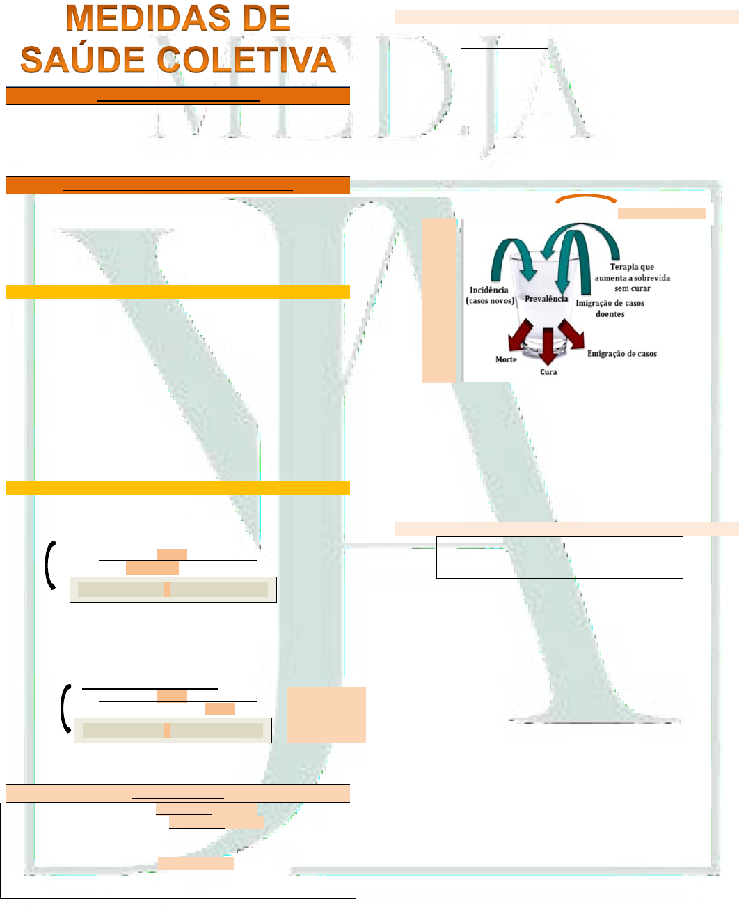 1 PREVENTIVA MED.JA ►►► EPIDEMIOLOGIA ◄◄◄ • Atua diante da necessidade do entendimento da rede causal (saúde-doença); • Ela não executa, não forma políticas e não da assistência; • O que faz, então? Descreve a distribuição dos problemas ►►► OS INDICADORES DE SAÚDE ◄◄◄ - Não é possível medir saúde, pois é muito subjetivo; - O possível é notificar doenças e morte. A morte é possível medir pela declaração de óbito, registrado no SIM (Sistema de Informação de Mortalidade). - Os indicadores podem ser em valores absolutos ou valores relativos [Coeficiente (risco), Índice (proporção)]. 2A. Valores absolutos * Tem como objetivo mostrar a realidade pontual e não permitem comparações temporais, geográficas e avaliações sobre a importância de um determinado fato ou evento. Na prática serve para as administrações de recursos. * Exemplos: Nº de casos de AIDs; Nº de vacinas necessária; Nº de gestante. * Na prática: Na cidade de Santos, com uma população de 400.000 habitantes, 20% da população é de idosos (> 60 anos). O prefeito, preocupado com sua população de idosos, foi comprar as primeiras doses da vacinas para o COVID-19. Quantas vacinas serão necessárias? R: Se 20 % de 400.000 é 80.000. Então, sabendo que há 80.000 idosos (>60 anos) na cidade de Santos, será necessárias 80.000 doses da vacina a ser aplicada 2B. Valores relativos 1) Para avaliar o risco = coeficiente (taxa) Definição: Mede o risco de uma pessoa morrer ou adoecer em um determinado local e ano. AVALIAR O RISCO → COEFICIENTE (TAXA) Número de óbitos em ≥ 50 anos População ≥ 50 anos Interpretação do exemplo acima: ‘é o risco de morte em pessoas maiores de 50 anos’. 2) Para avaliar a proporção = índice Definição: Mede o percentual de óbitos por faixa etária (subconjunto) em relação ao número total de óbitos (conjunto). AVALIAR A PROPORÇÃO → ÍNDICE Número de óbitos em ≥ 50 anos Número total de óbitos Interpretação do exemplo acima: é a proporção de morte em pessoas maiores de 50 anos, ou seja, é o índice de Swaroop- Uermura (aqui quanto maior o ISU, melhor é o país). COEFICIENTES... 1) MORBIDADE: Risco da População adoecer 2) MORTALIDADE: Risco da População morrer * Olha pessoas sadias e doentes: Geral/infantil/por causas! * ) Tópico a mais: Tripla carga global de doença 3) LETALIDADE: Risco do Doente morrer * Olha apenas os doentes, é uma mortalidade “purificada”: Mede a gravidade de uma doença! ENTENDENDO CADA UM DOS COEFICIENTES... 1) MORBIDADE → Incidência x Prevalência a) INCIDÊNCIA: apenas os casos novos em relação aquela população: 𝑁 𝑡𝑜𝑡𝑎𝑙 𝑑𝑒 𝑐𝑎𝑠𝑜𝑠 𝑁𝑂𝑉𝑂𝑆 𝑃𝑜𝑝𝑢𝑙𝑎çã𝑜 𝑒𝑚 𝑅𝐼𝑆𝐶𝑂 x 10.000 hab * Coeficiente de ataque: utilizado para avaliação de surtos (epidemia) → melhor para avaliar doenças agudas; b) PREVALÊNCIA: pega o todo de casos: 𝑁 𝑡𝑜𝑡𝑎𝑙 𝑑𝑒 𝑐𝑎𝑠𝑜𝑠 𝑃𝑜𝑝𝑢𝑙𝑎çã𝑜 𝑡𝑜𝑡𝑎𝑙 x 10.000 hab * Em um tempo e um lugar ‘o balde de casos’ → melhor para avaliar doenças crônicas; * O que pode AUMENTAR a prevalência? Os casos novos, aumento da incidência (exemplo: diagnóstico precoce), imigração de doentes e uso de drogas que aumentam sobrevida sem curar. * O que pode DIMINUIR a prevalência? A morte, a cura e a emigração dos doentes. * Prevalência = Incidência x Duração * Quem é maior - Prevalência ou Incidência? Depende... Na relação entre esses dois indicadores, existe uma variável importante que é a duração. Exemplo: Se houver um surto de ebola, a incidência pode ser muito alta, no entanto, os acometidos morrem facilmente, diminuindo então a prevalência. * A prevalência seria ‘um saco cheio’ que não diferencia casos novos de casos antigos. * Os casos novos de uma população que varia no tempo = densidade de incidência. 2) MORTALIDADE → Geral x Específica (materna e infantil) - Geral: Olha em 1.000 habitantes; - Materna: Olha em 100.000 nascidos vivos; - Infantil: Olha em 1.000 nascidos vivos. a) Mortalidade geral: 𝑁 𝑑𝑒 ó𝑏𝑖𝑡𝑜𝑠 𝑝𝑜𝑟 𝑐𝑒𝑟𝑡𝑎 𝑐𝑎𝑢𝑠𝑎 𝑃𝑜𝑝𝑢𝑙𝑎çã𝑜 𝑠𝑜𝑏 𝑟𝑖𝑠𝑐𝑜 x 1.000 hab * É o ‘ASPONE’: mnemônico para assistente que não serve para nada!!! * Não serve para nada, não pode ser usado para comparar regiões diferentes; * O risco de qualquer indíviduo morrer; * É a população exposta; * Não serve para comparar; * Não avalia a adequada qualidade da saúde. b) Mortalidade específica: Materna e Infantil MATERNA → 𝑁 𝑑𝑒 ó𝑏𝑖𝑡𝑜𝑠 𝑝𝑜𝑟 𝑐𝑎𝑢𝑠𝑎 𝑚𝑎𝑡𝑒𝑟𝑛𝑎 𝑵𝑨𝑺𝑪𝑰𝑫𝑶𝑺 𝑽𝑰𝑽𝑶𝑺 x 100.000 NV * Mortes por causa materna: da gravidez, do parto, do puerpério (42 dias após o parto até 6 semanas); * Morte materna direta (70-80% dos casos): diretamente consequente a gravidez e puerpério. Exemplo: pré- eclâmpsia, eclâmpsia, DPP, infecção puerperal/ choque séptico; * Morte materna indireta (20-30% dos casos): quando existia uma doença previa e a doença foi piorada pela gravidez/ parto/ puerpério. Exemplo: doença cardíaca; NUMERADOR = DENOMINADOR NUMERADOR ≠ DENOMINADOR Proporções NÃO DÃO indicação de risco. P = IxD ‘PID’ Q u a n to m a io r a d u ra ç ã o d a s u a d o e n ç a m a io r a p re v a lê n c ia 2 PREVENTIVA MED.JA 2 exceções que entram no conceito de morte materna: 1º: Aborto provocado: que é um crime: deve ser encaminhada ao IML / CRIME 2º: Suicídio puerperal * OBS: ACIDENTES NÃO ENTRAM AQUI, OU SEJA, NÃO ENTRAM NA CONTABILIDADE DE MORTES MATERNAS! CAUSAS + FREQUENTES DE MORTE MATERNA: 1º Hipertensão 2º Hemorragia 3º Infecção Lembrando que TODAS essas causas são evitáveis. Uma boa assistência não tem sentido morrer por 
